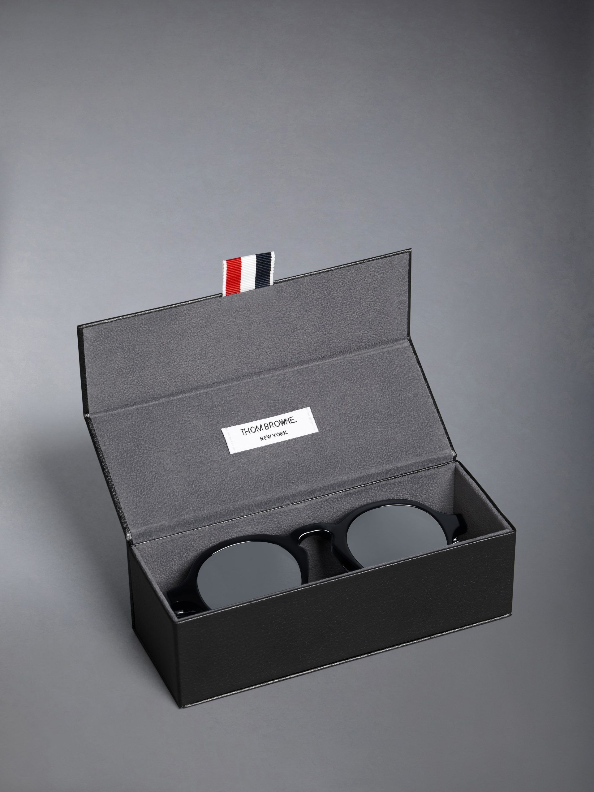 Eco-Leather case with Signature striped grosgrain loop tab at entry