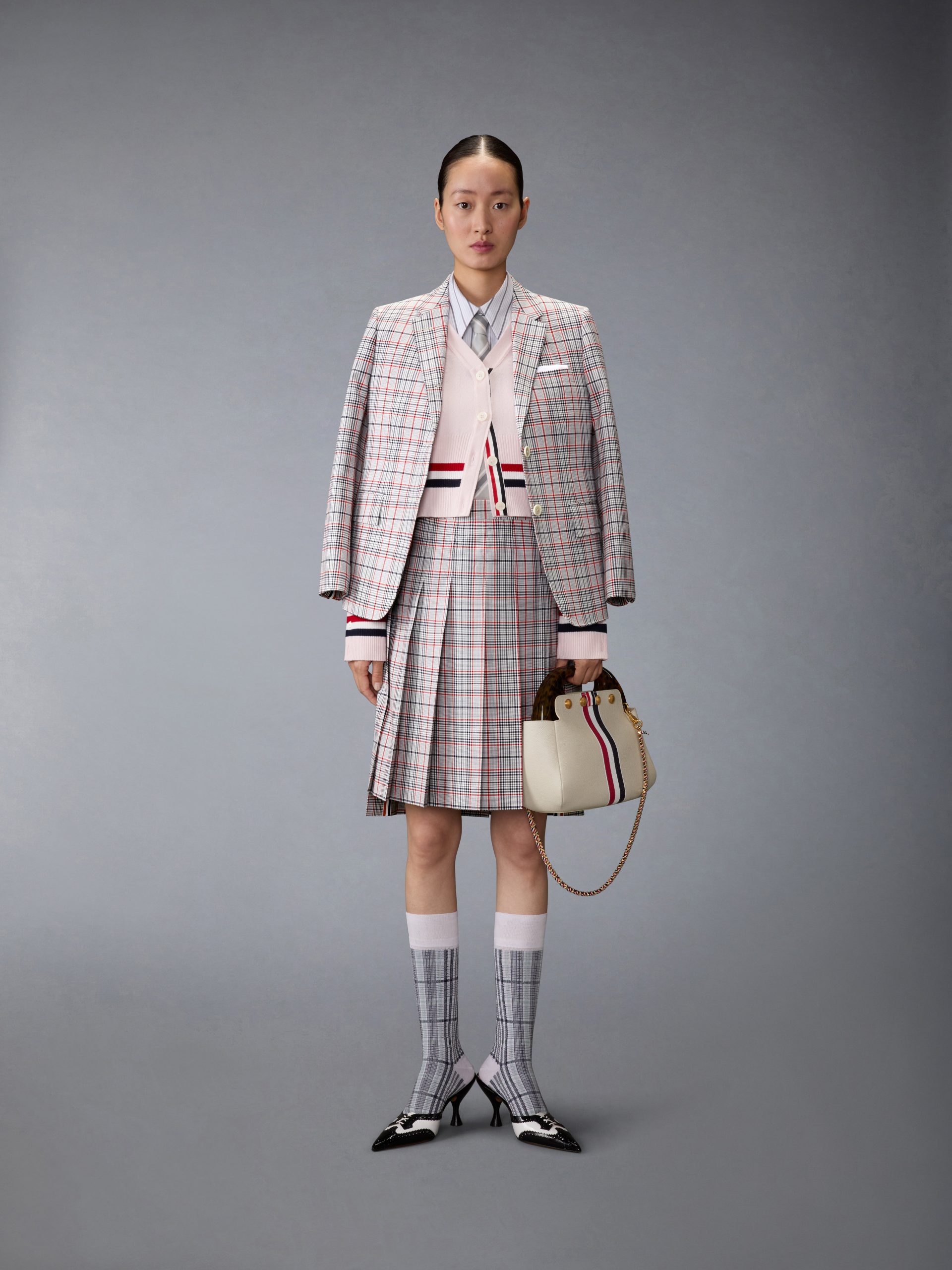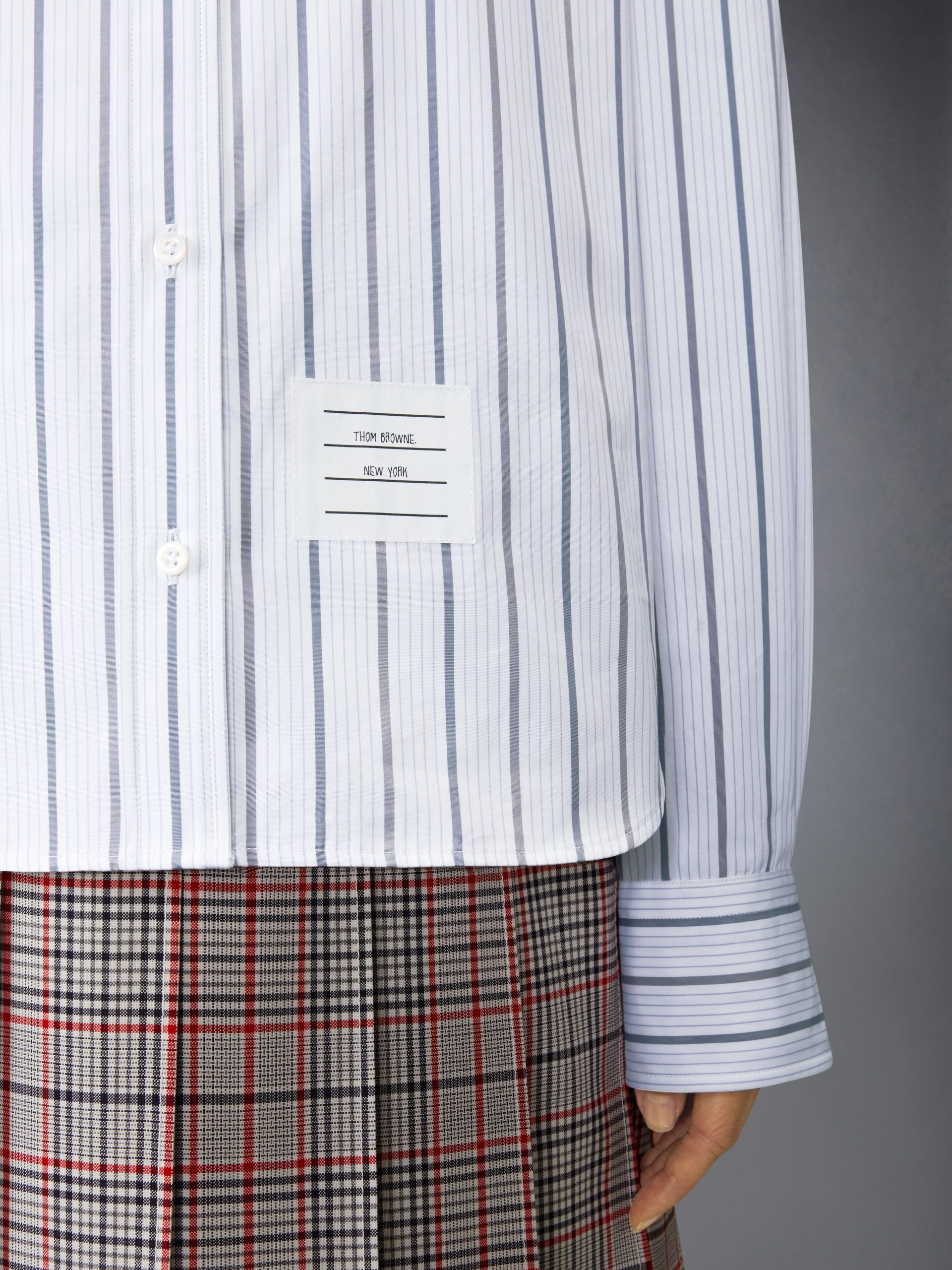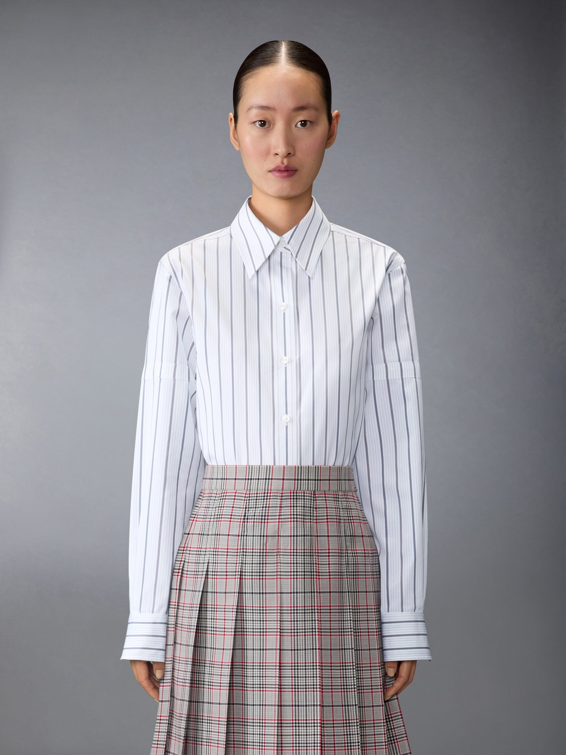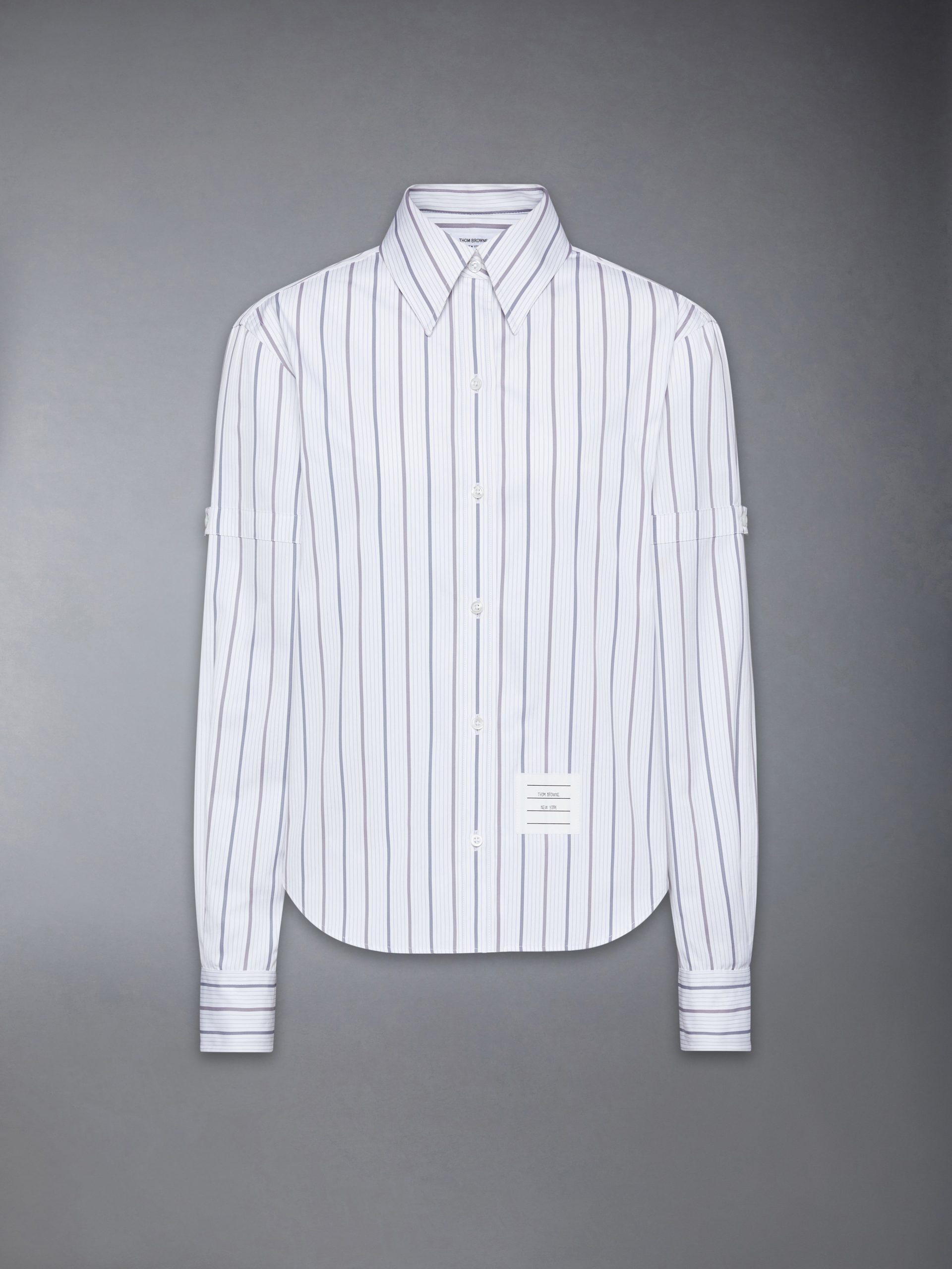 Crisp cotton poplin and a softened shape bring structure and ease into balance. The silhouette features a graphic vertical stripe pattern and armbands—nods to the uniform codes that run through the Thom Browne world. Classic detailing and a point collar ground the composition with quiet precision.