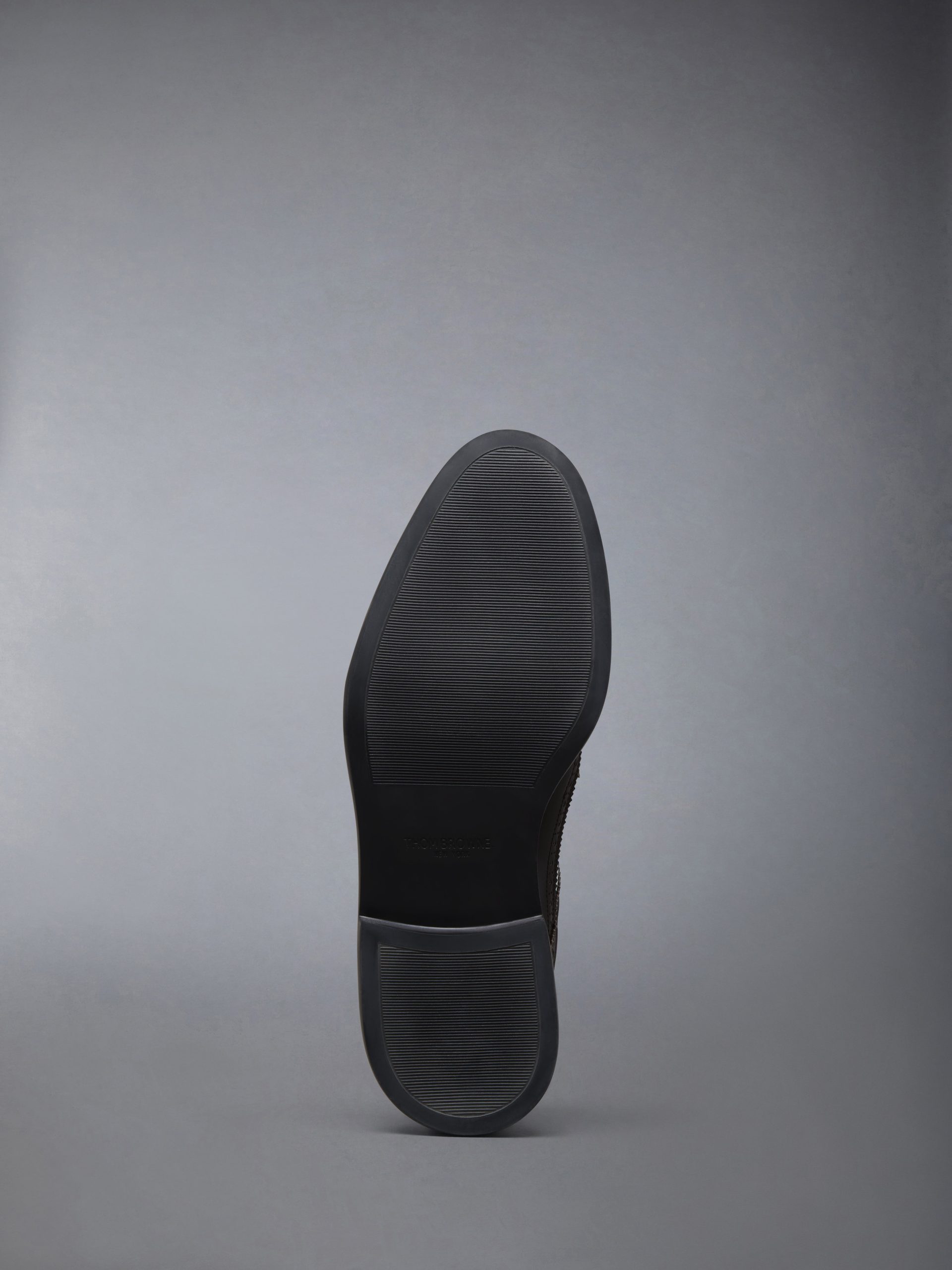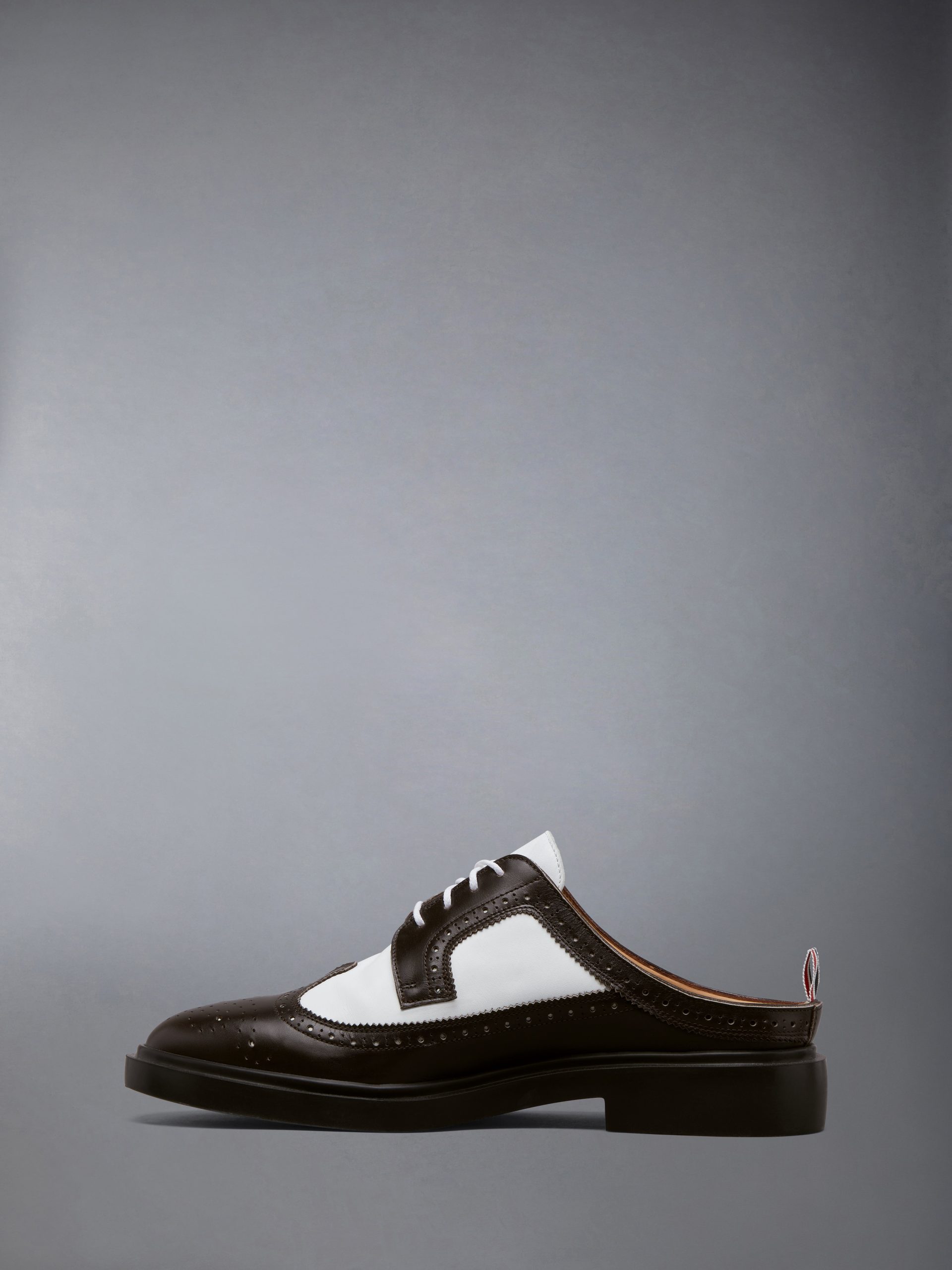 This backless longwing brogue reinterprets a traditional silhouette as a mule. crafted in box calf leather. Set on a lightweight rubber sole. it blends familiar detailing with a directional shift. offering comfort and a distinctly Thom Browne perspective on uniform classics. Pair with both tailored and casual looks to highlight its balance of tradition and ease.