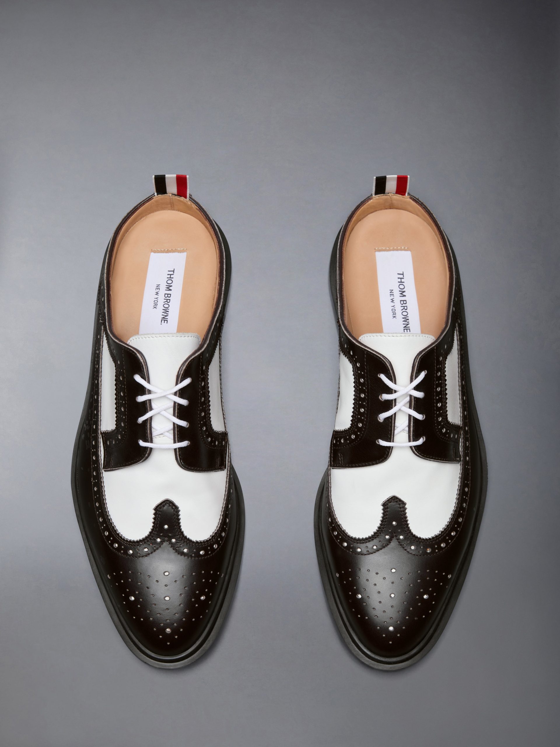 Lace-up closure. Wingtip brogue detailing. Lightweight rubber sole. Signature striped grosgrain loop tab.