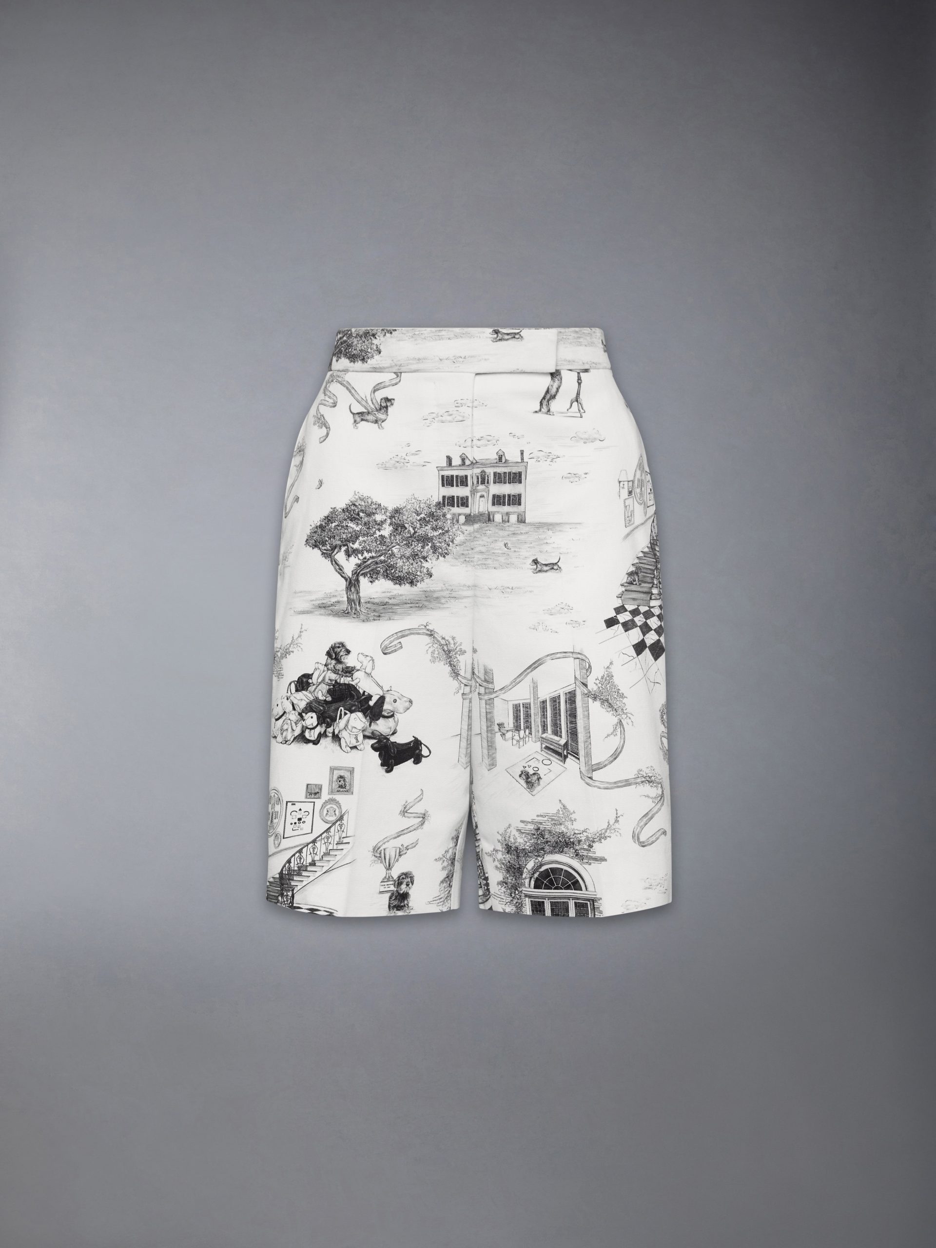 In celebration of Hector’s tenth year as a brand icon. these Bermuda shorts feature a highly personal tableau that is part portrait. part pastoral dream. The print draws elements from Thom Browne’s own upstate world. depicting the beloved dachshund in a series of whimsical vignettes across a tailored silhouette in structured cotton canvas. elevated through storytelling and craft.