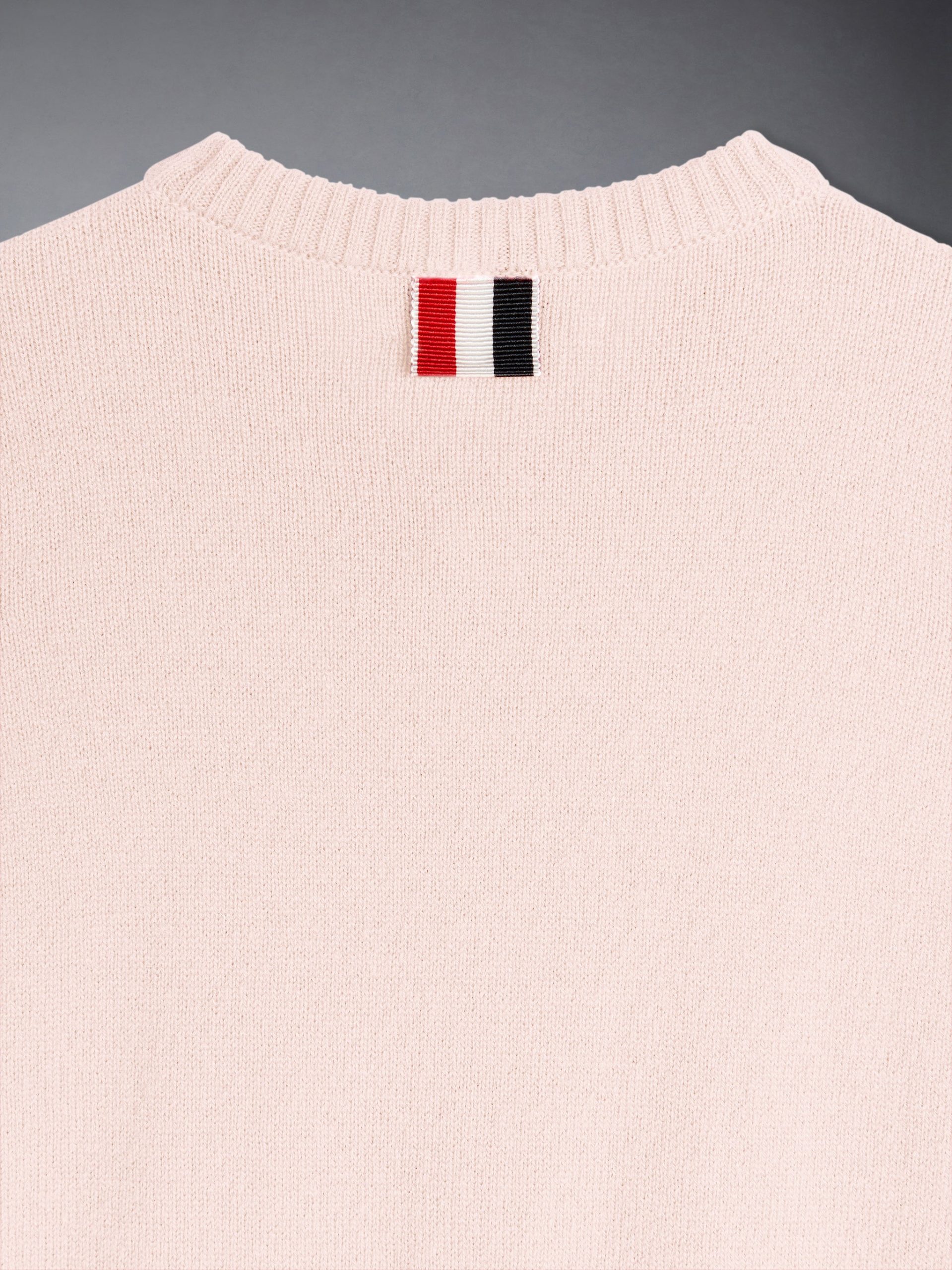 Signature striped grosgrain loop tab at back of neck