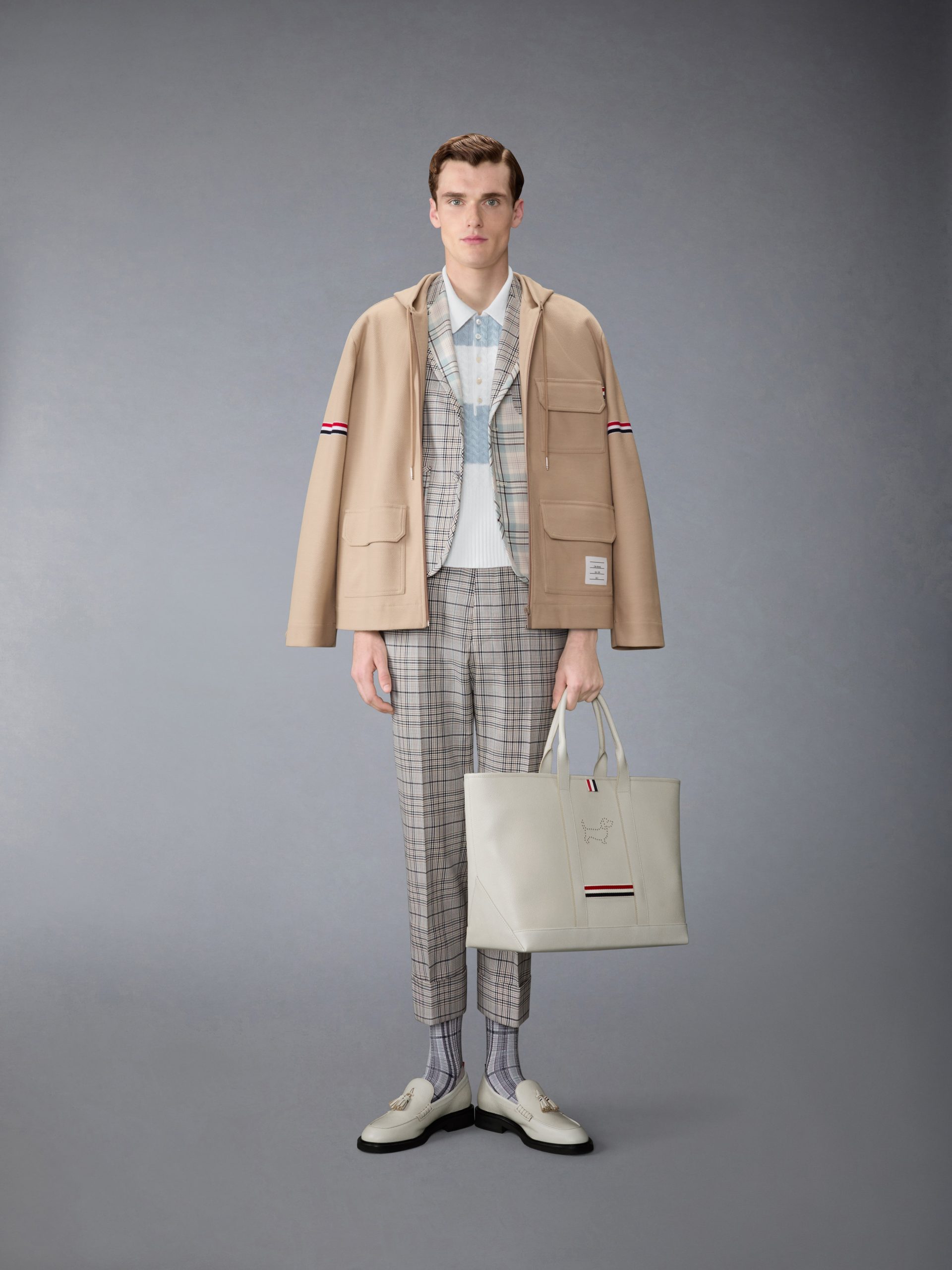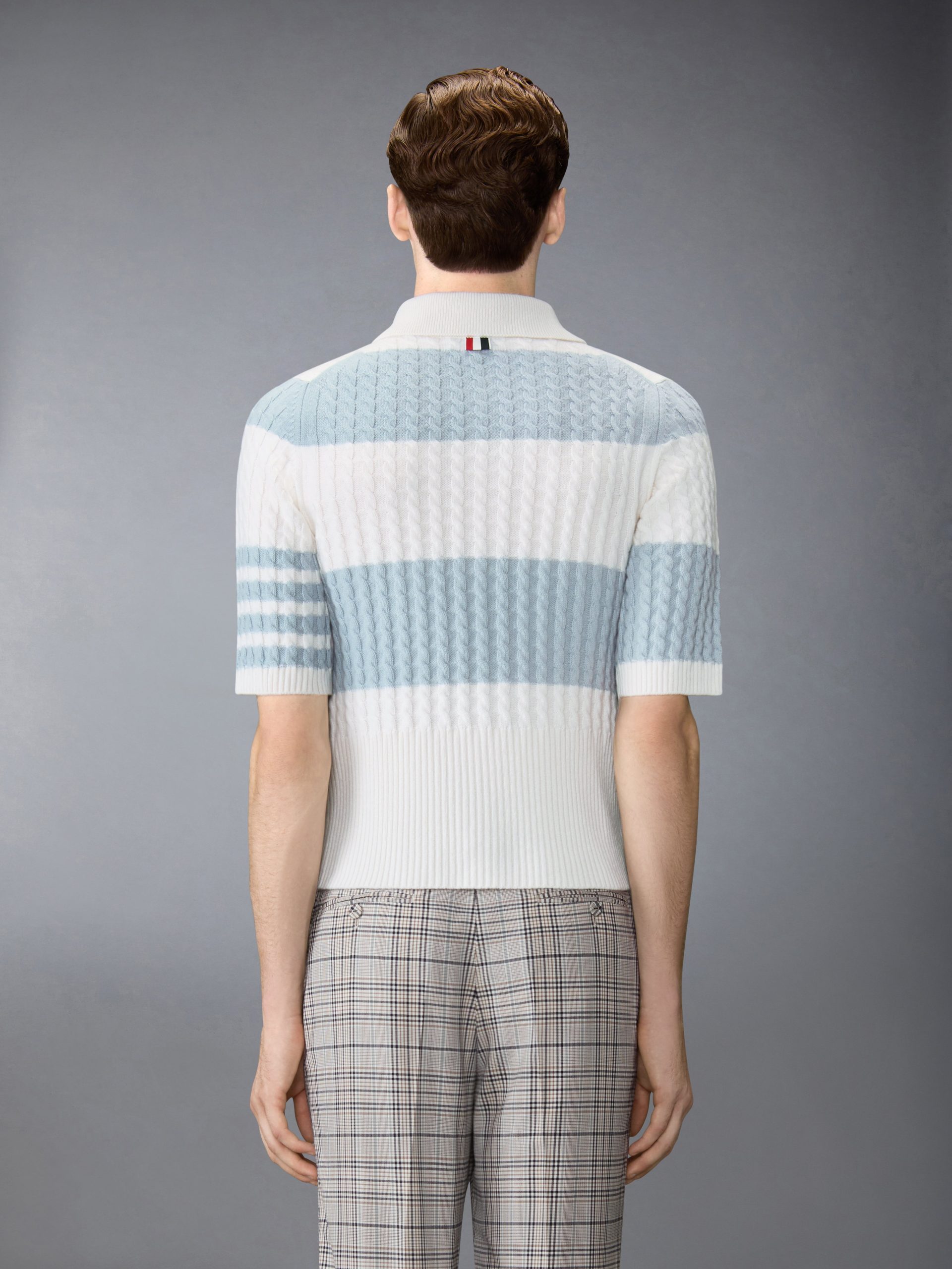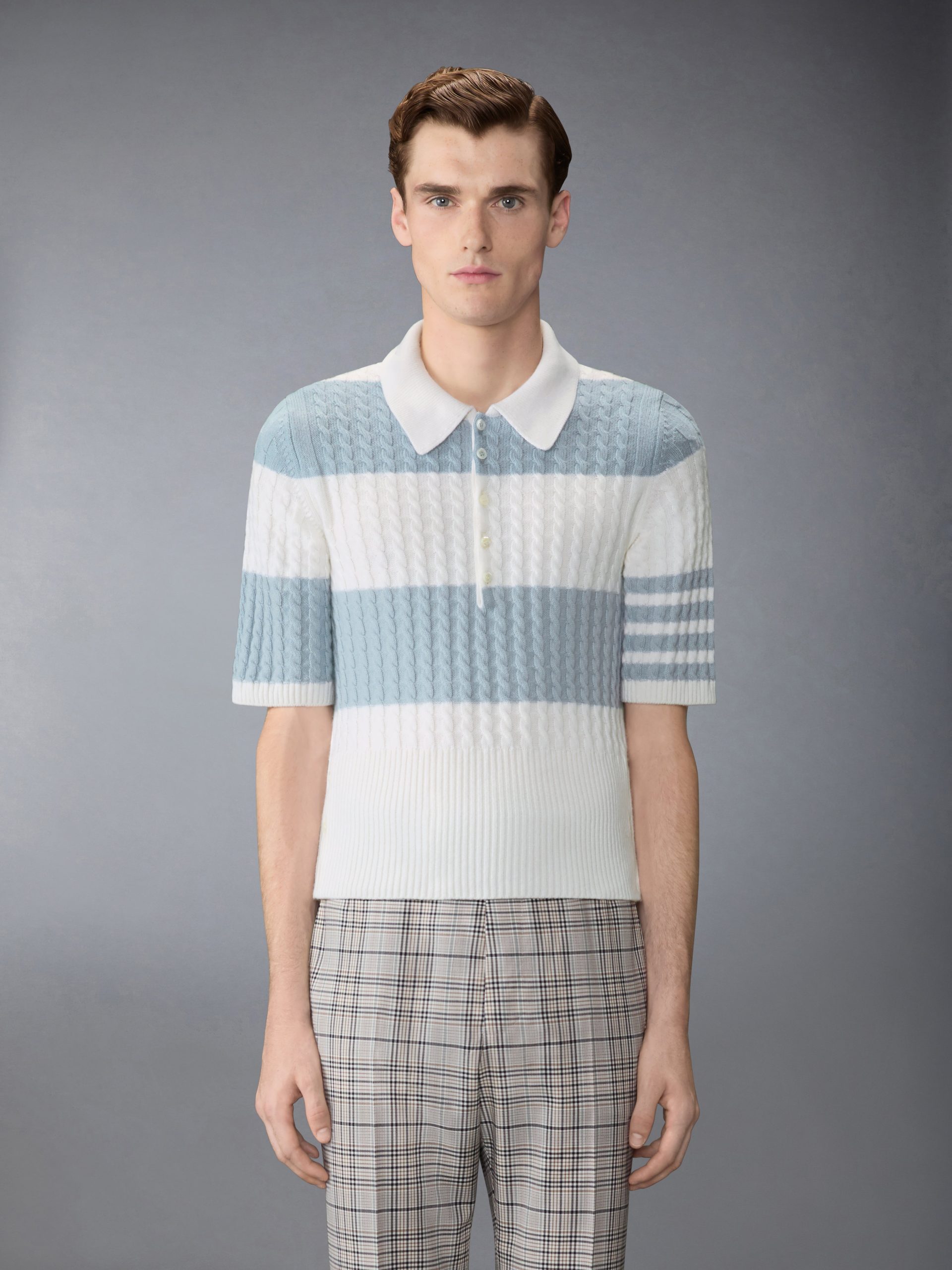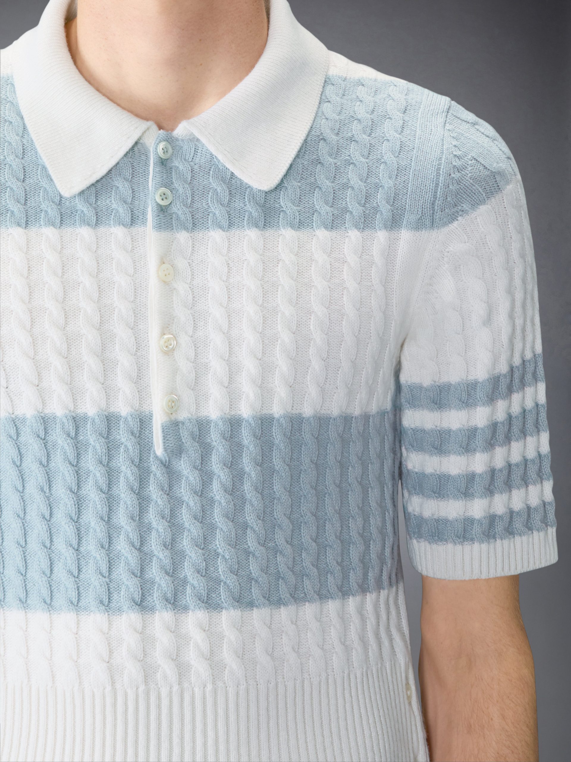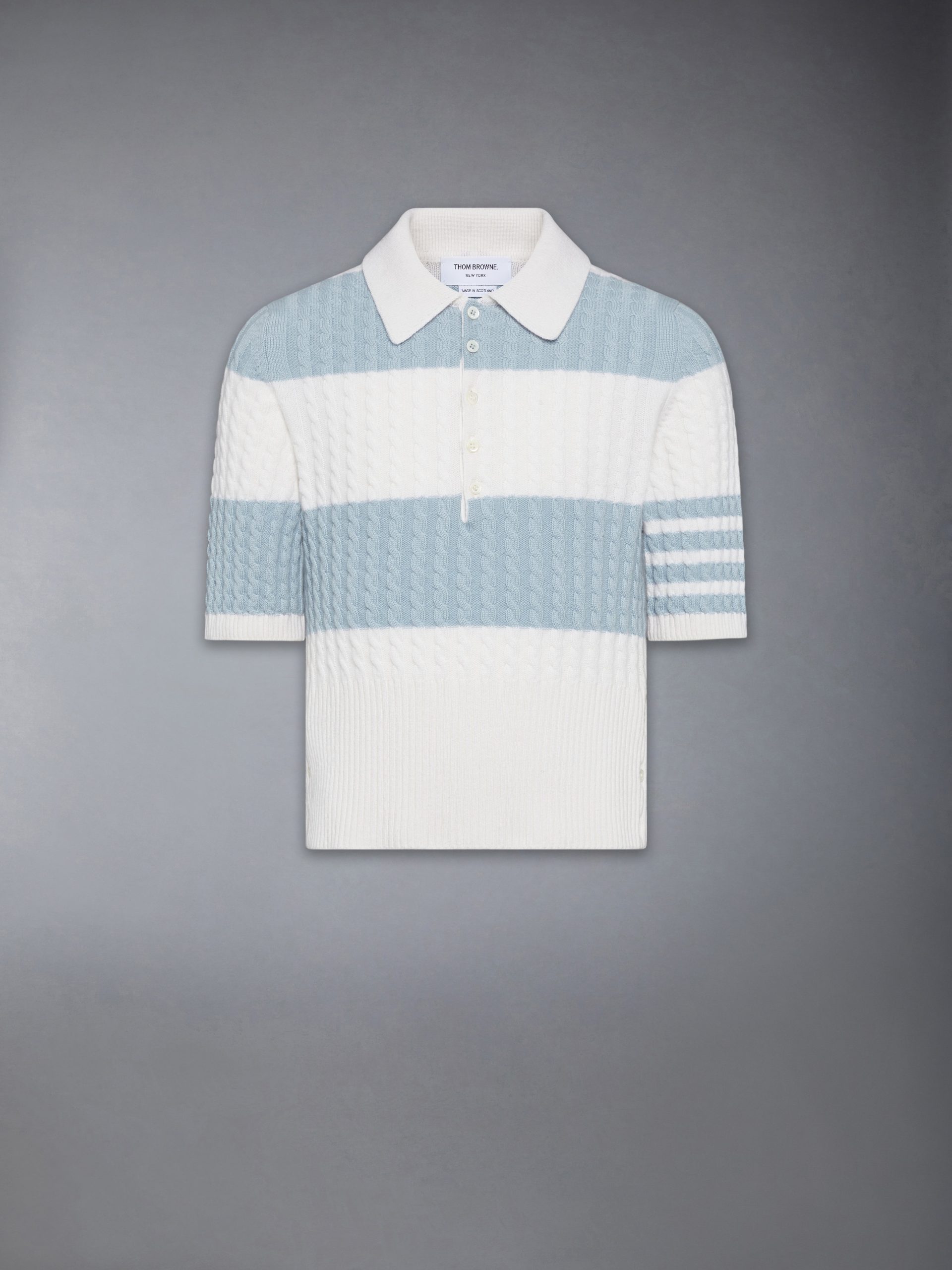 Sport-inspired details meet refined construction. This short-sleeve polo is crafted in soft cashmere with a baby cable stitch. creating a lightweight texture with a soft. dimensional hand. Wide rugby stripes bring a playful nod to athletic tradition. while 4-bar detailing adds a sharp. uniform-like rhythm. Offset with seasonal plaid tailoring for a playful blend of motifs.