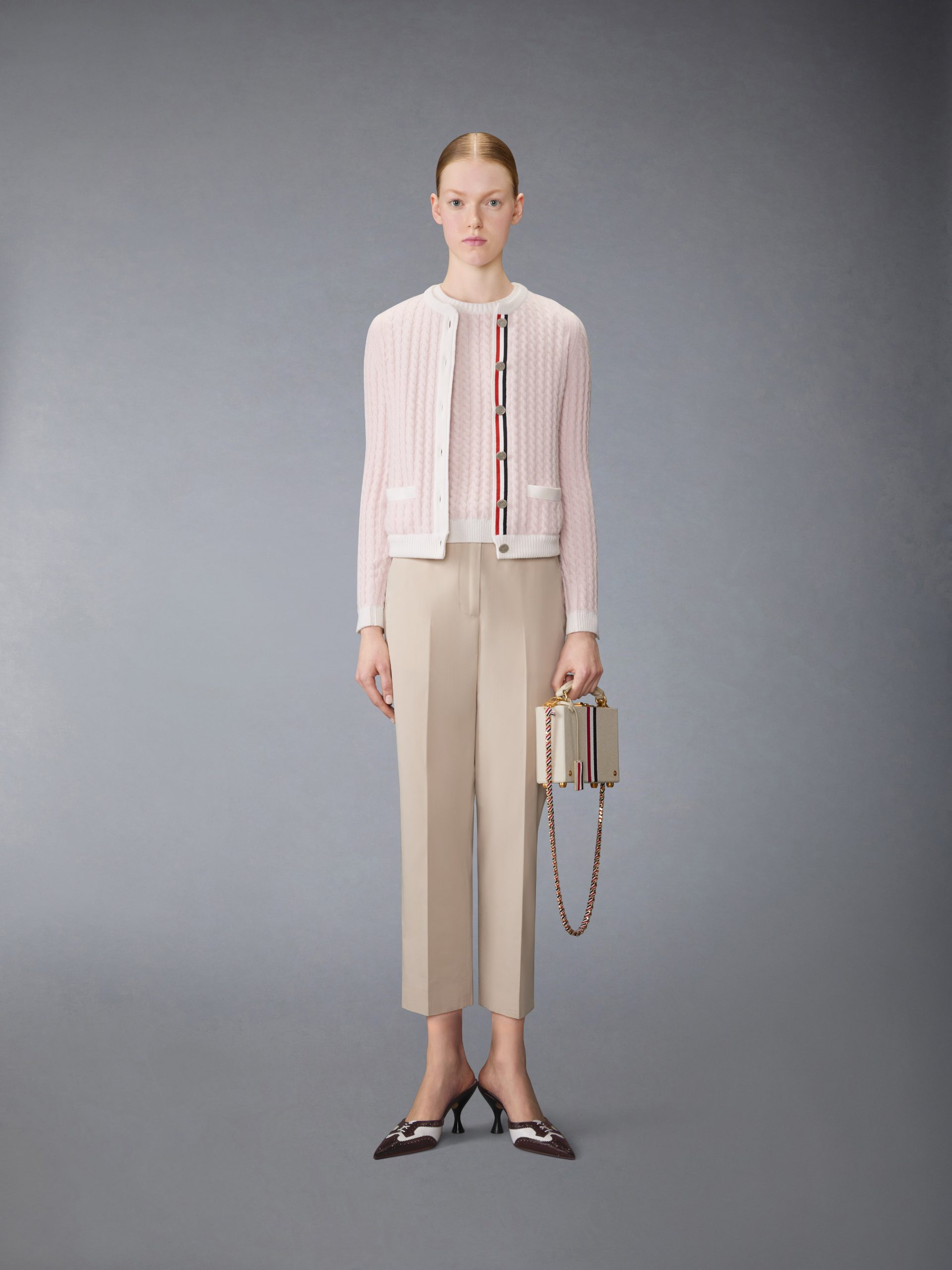 Knit in soft cashmere with a baby cable stitch. this shell top offers delicate texture while contrast ribbing frames the silhouette with gentle definition. Pair with the matching cardigan or wear separately as a lightweight layer.