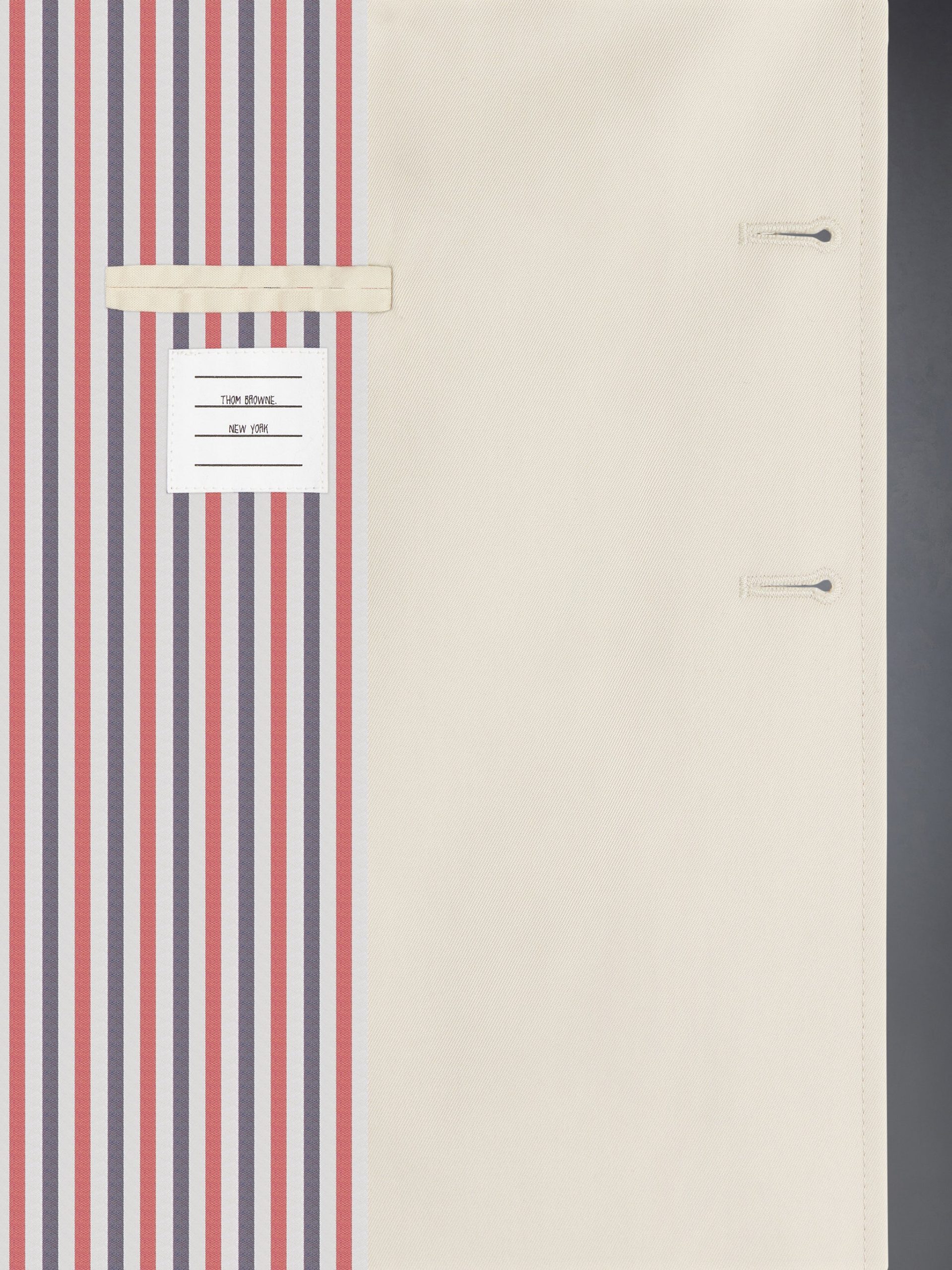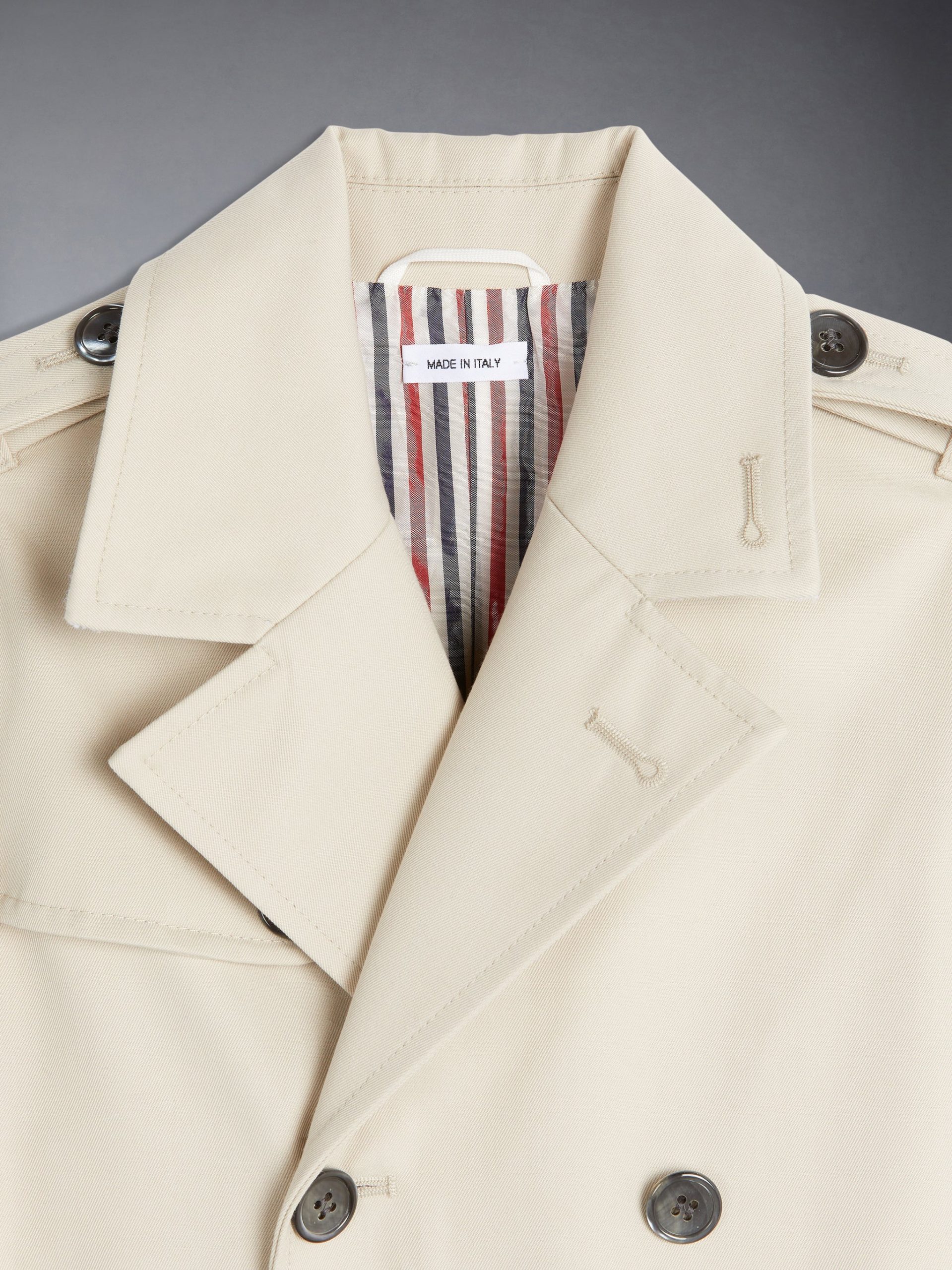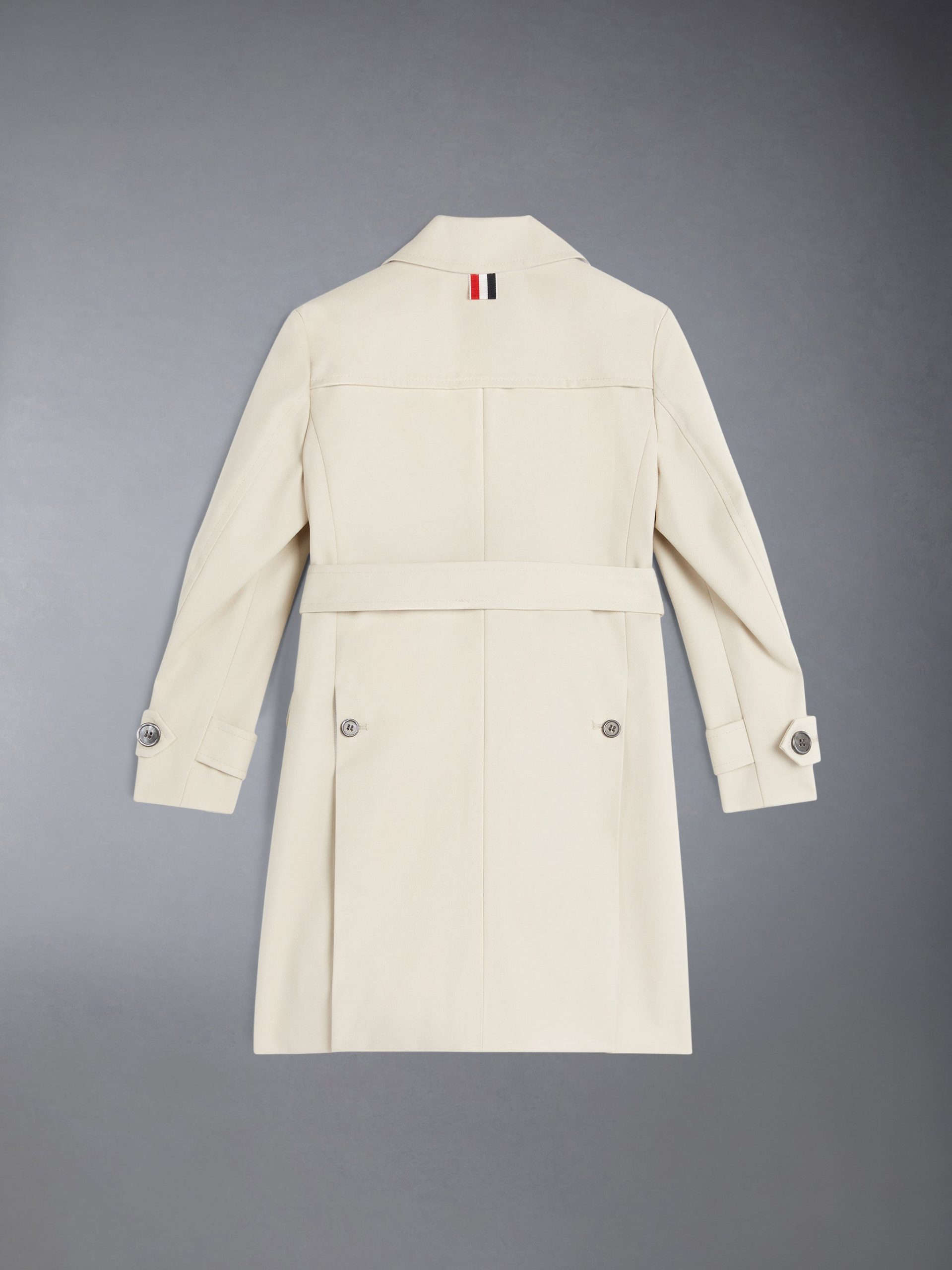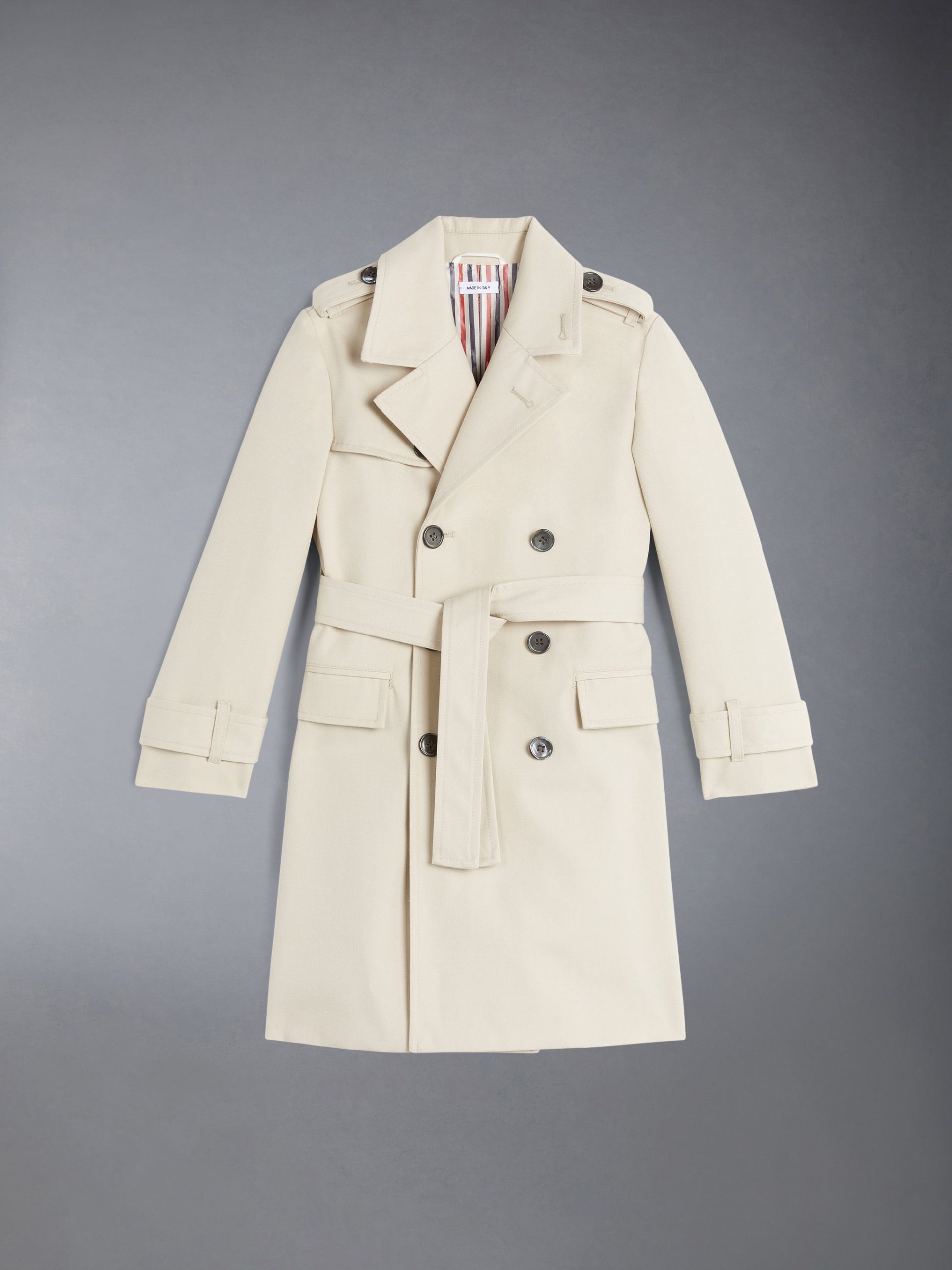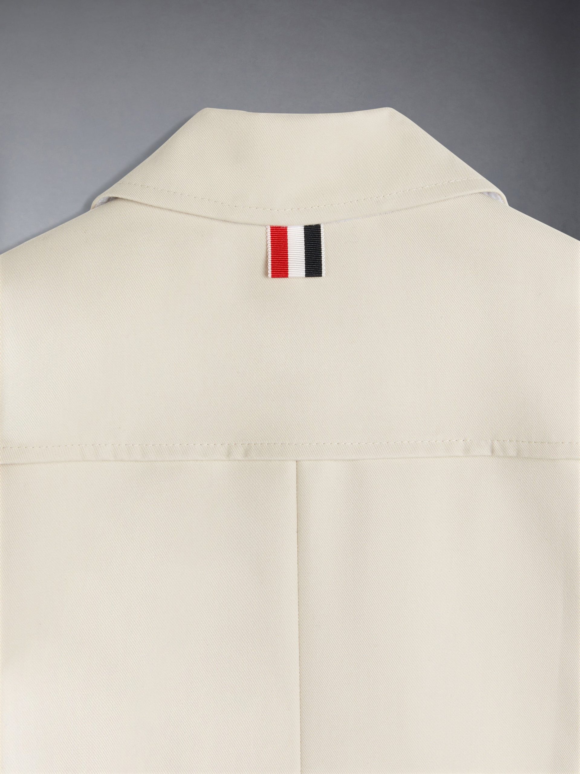 Our Waterproof Cotton Twill Trench Coat in Khaki exemplifies Thom Browne’s mastery of minimalistic design and tailored excellence. A button-front closure is at center. while an iconic striped grosgrain loop tab rests at the nape of the neck.