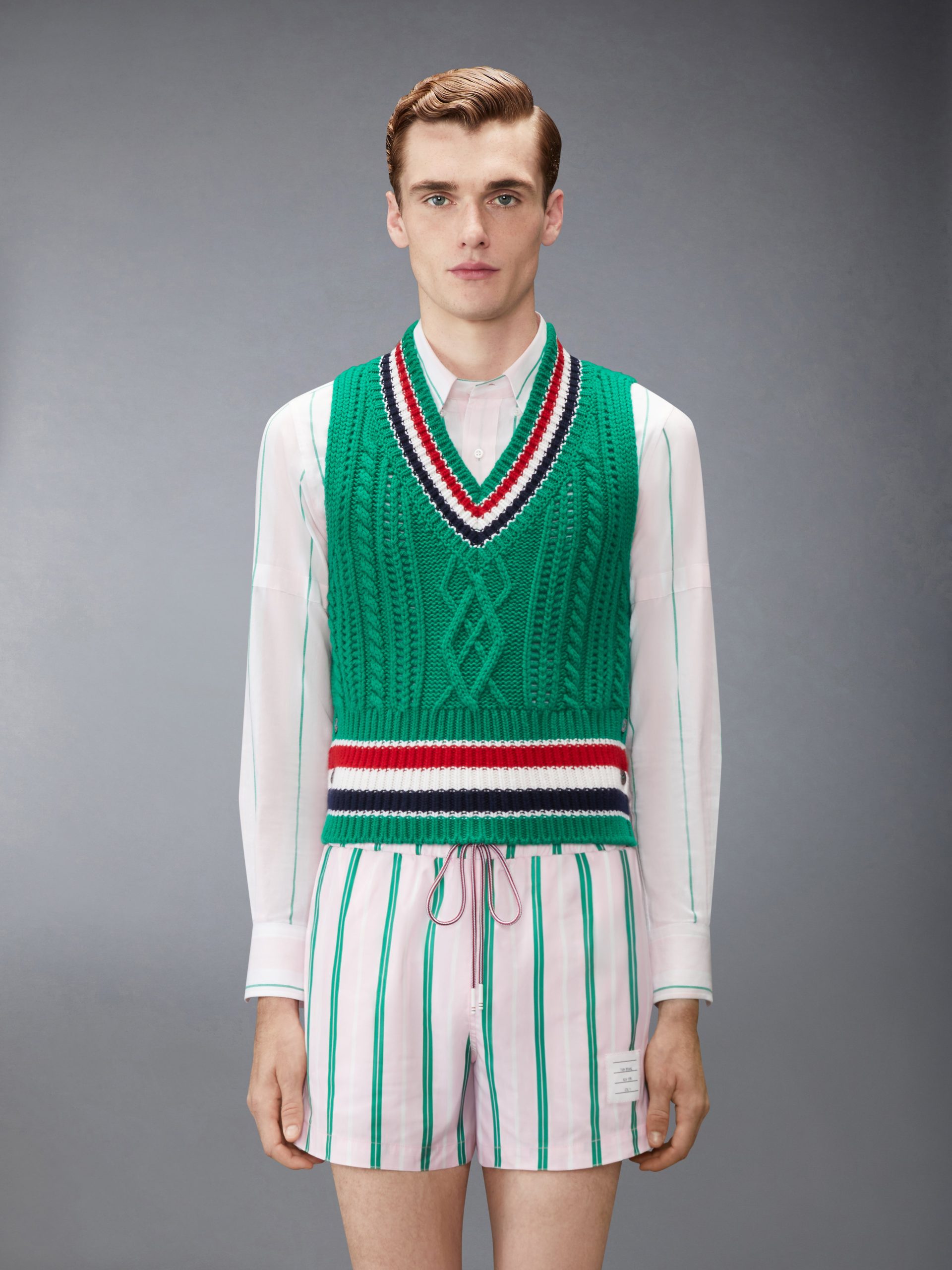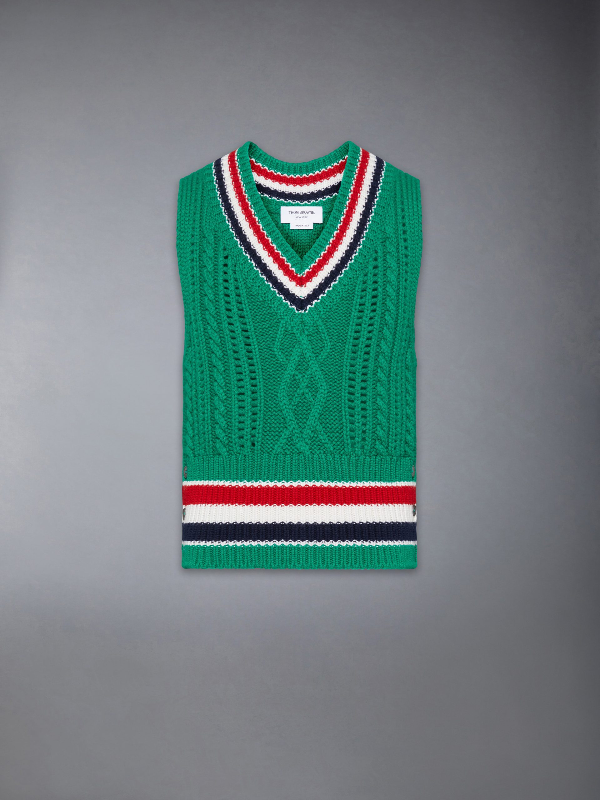 Chunky cashmere V-neck vest in Aran cable knit. Signature RWB stipe details at neckline and hem.