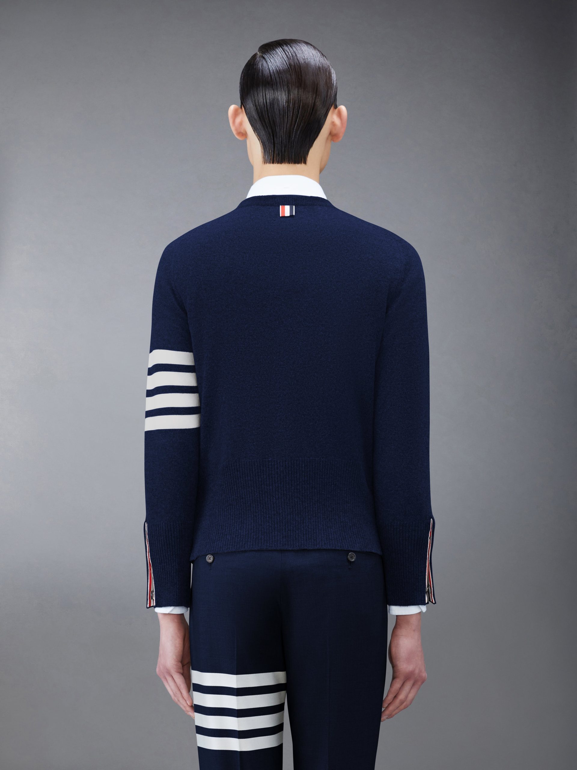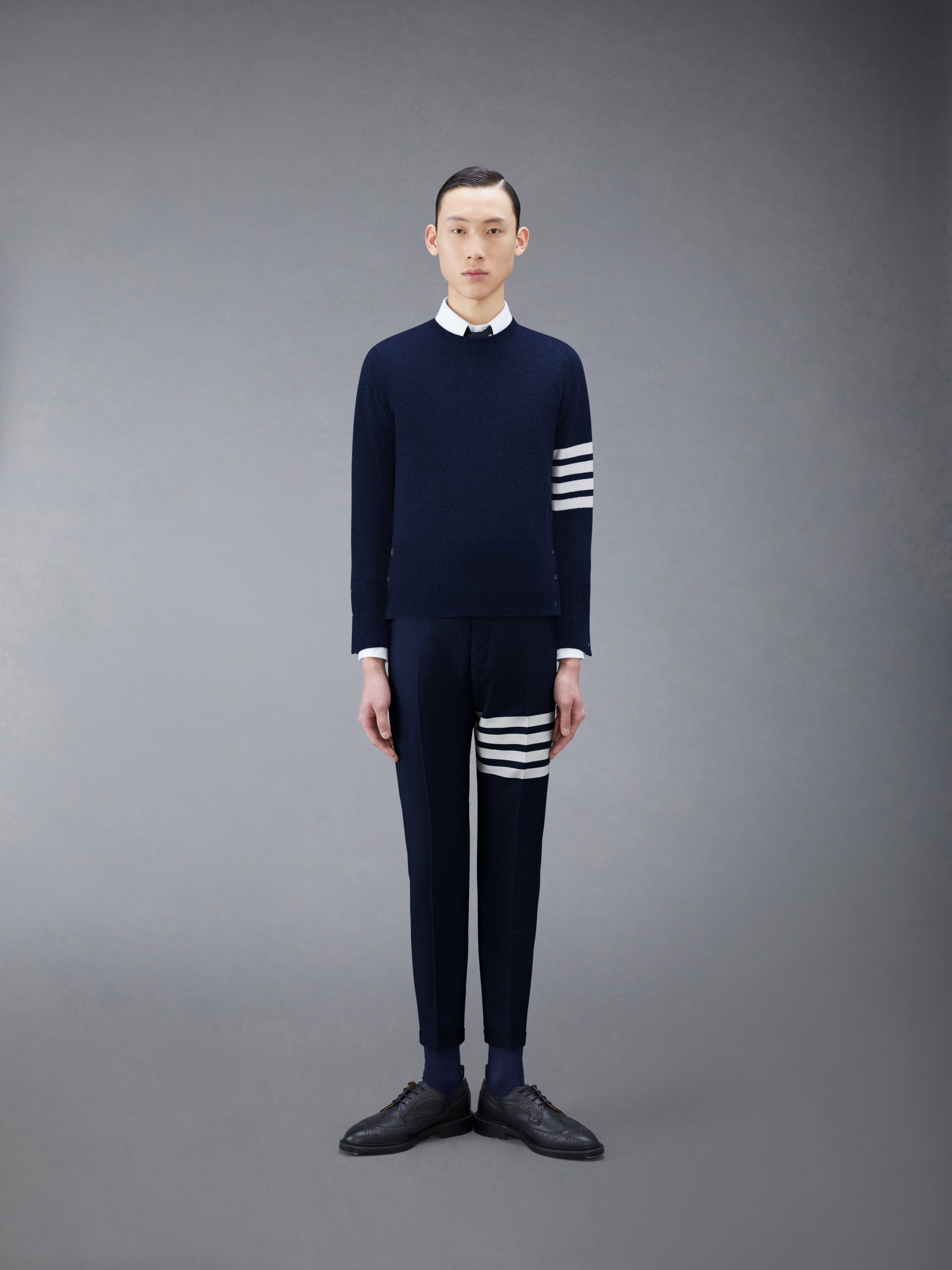A signature Thom Browne emblem defines our Classic Cashmere 4-Bar Pullover. Inspired by varsity stripes. our 4-Bar design is Thom Browne most sought-after icon. Presented in 100% rich cashmere. this pullover is a longstanding staple.