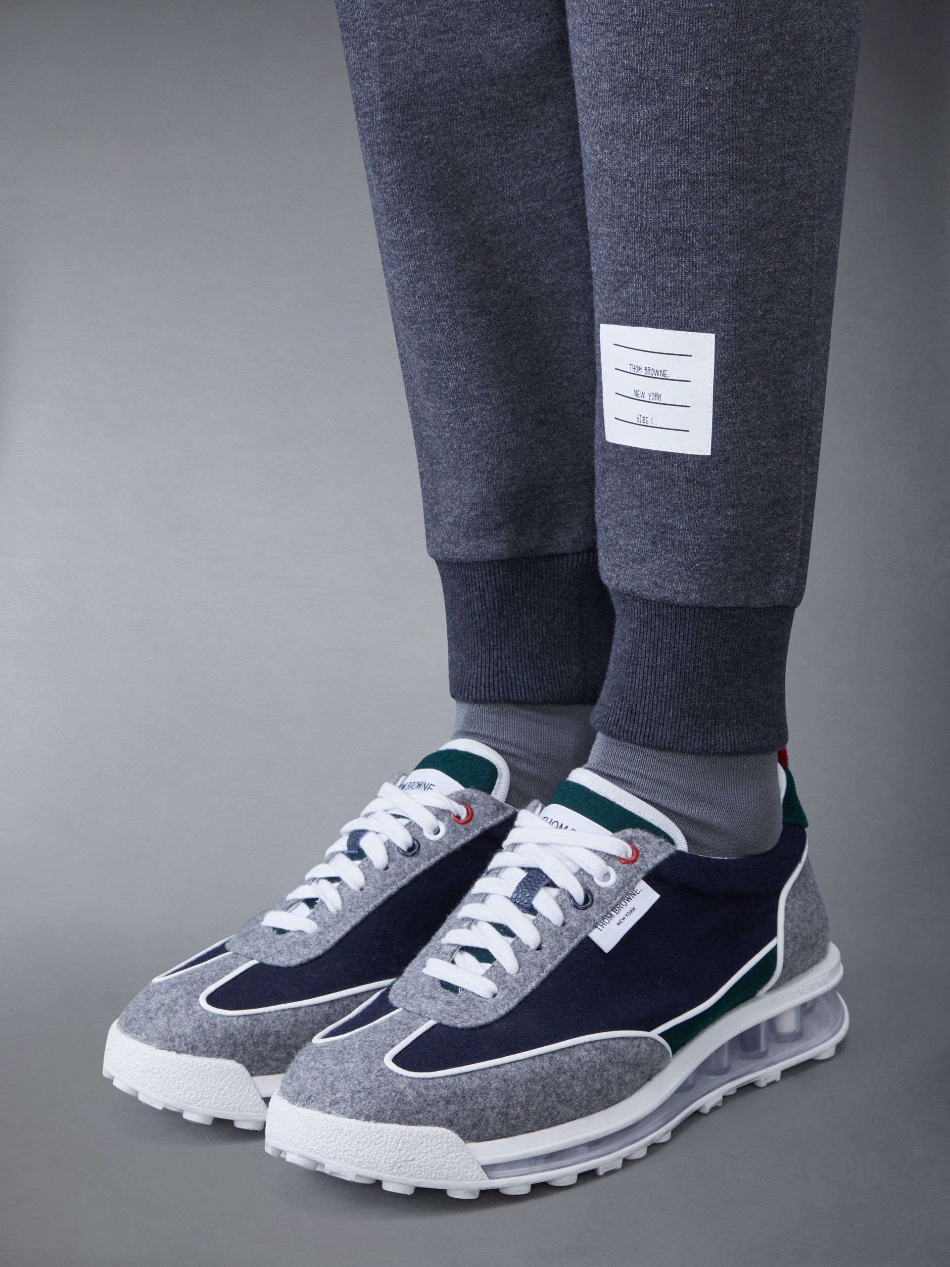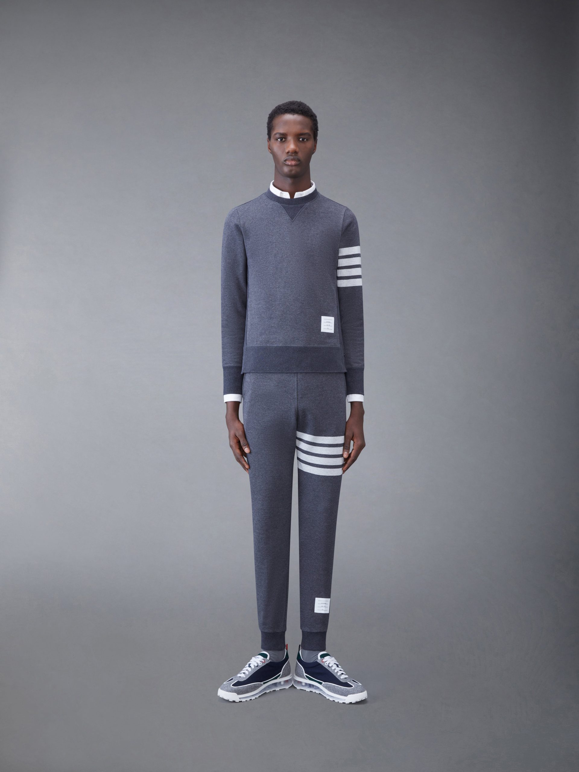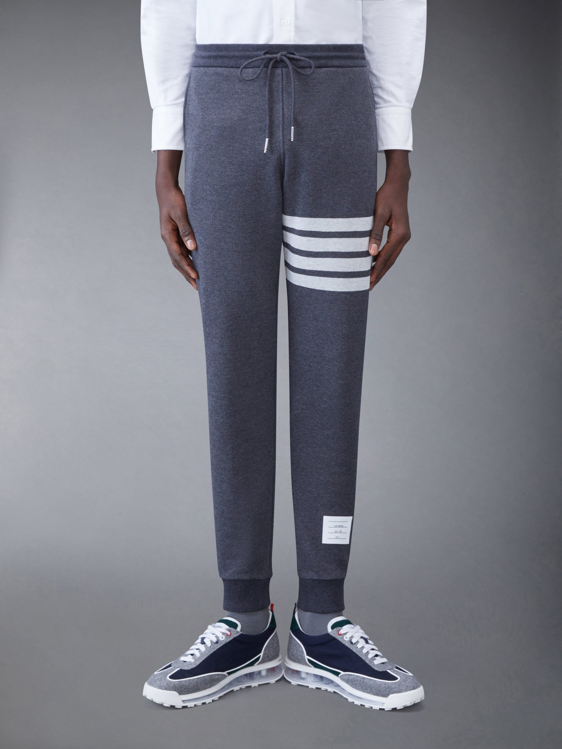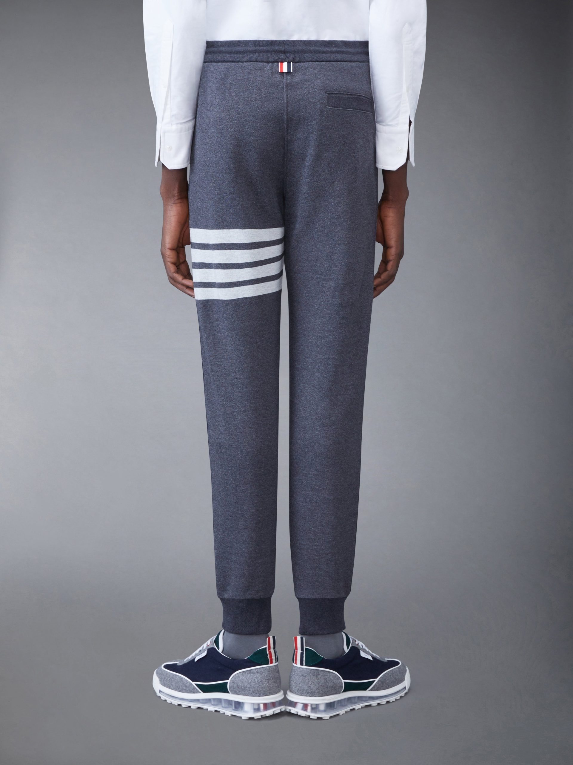 Classic sweatpants in grey cotton loopback with 4-bar stripe detail at left thigh in white. Drawstring waistband. name tag applique above left cuff. ribbed cuffs. Slip side pockets. single back welt pocket. Signature striped grosgrain loop tab at back waist.