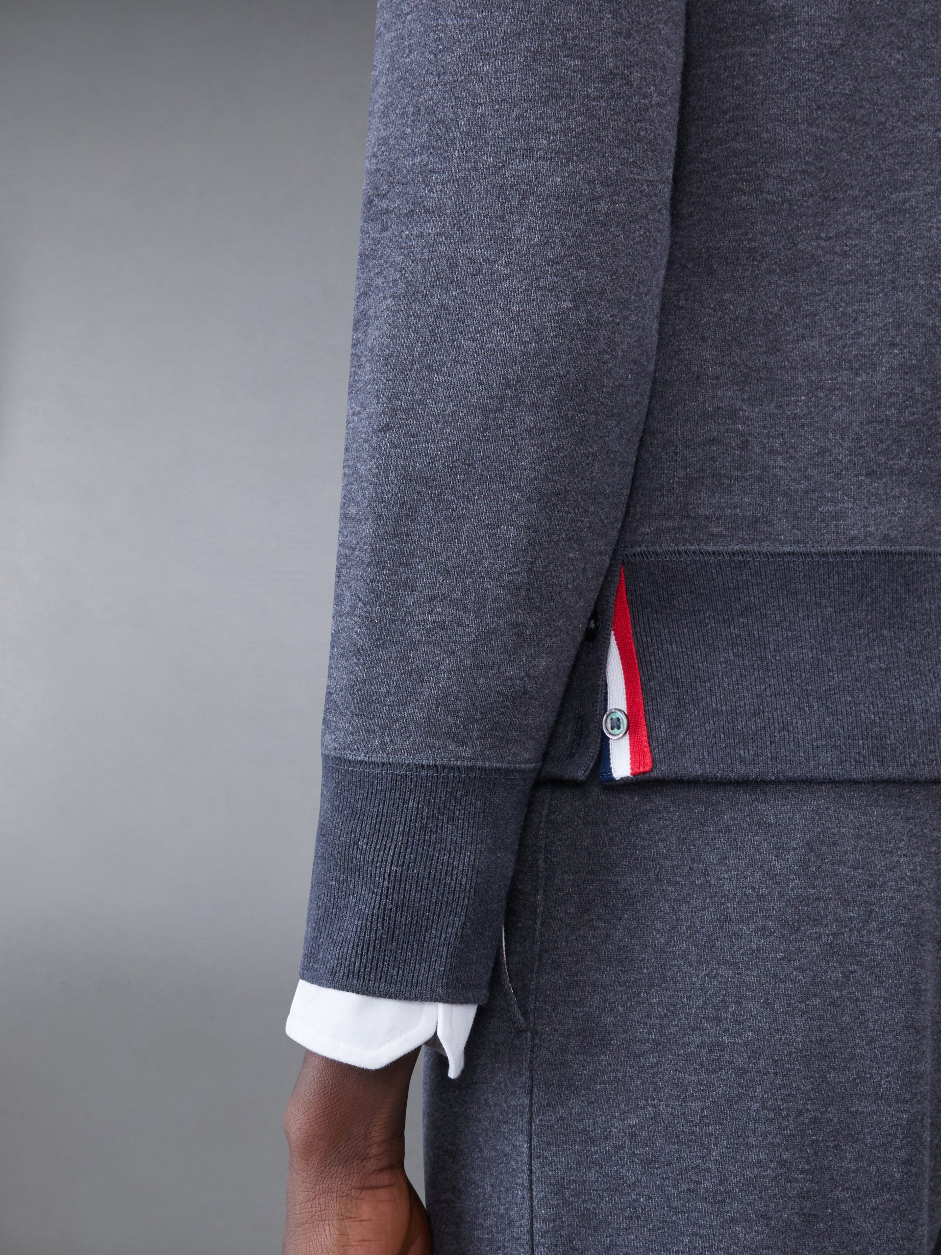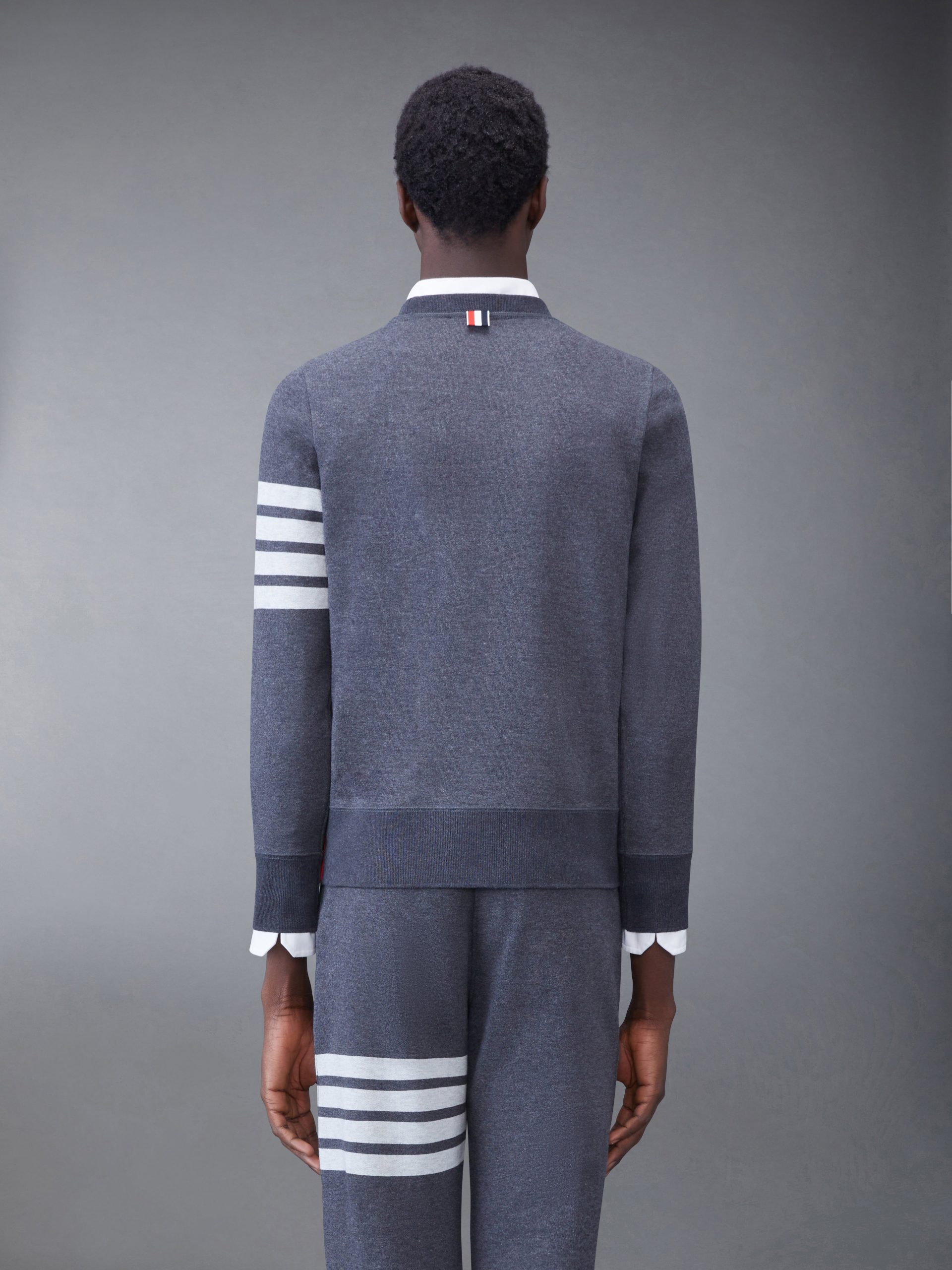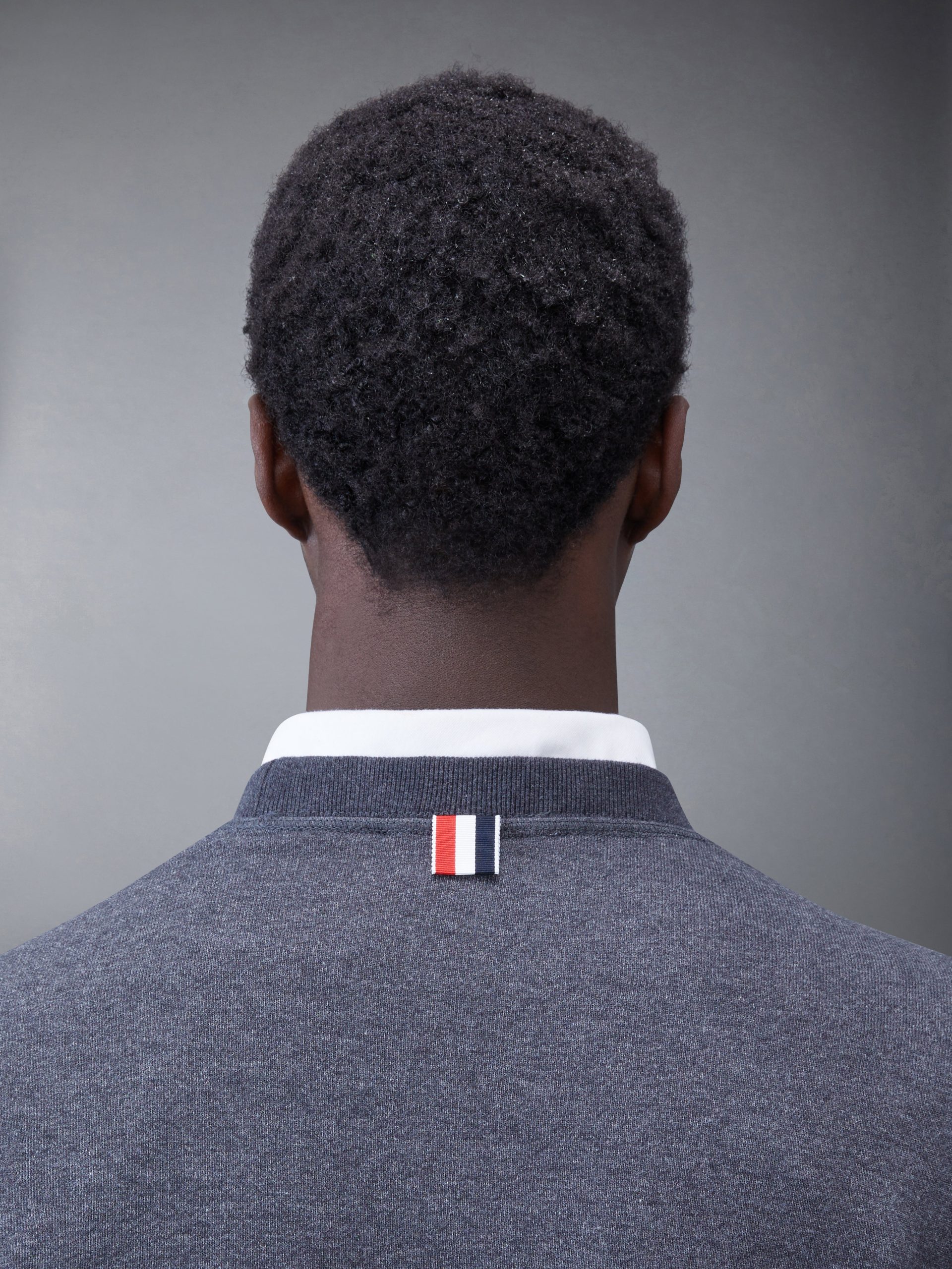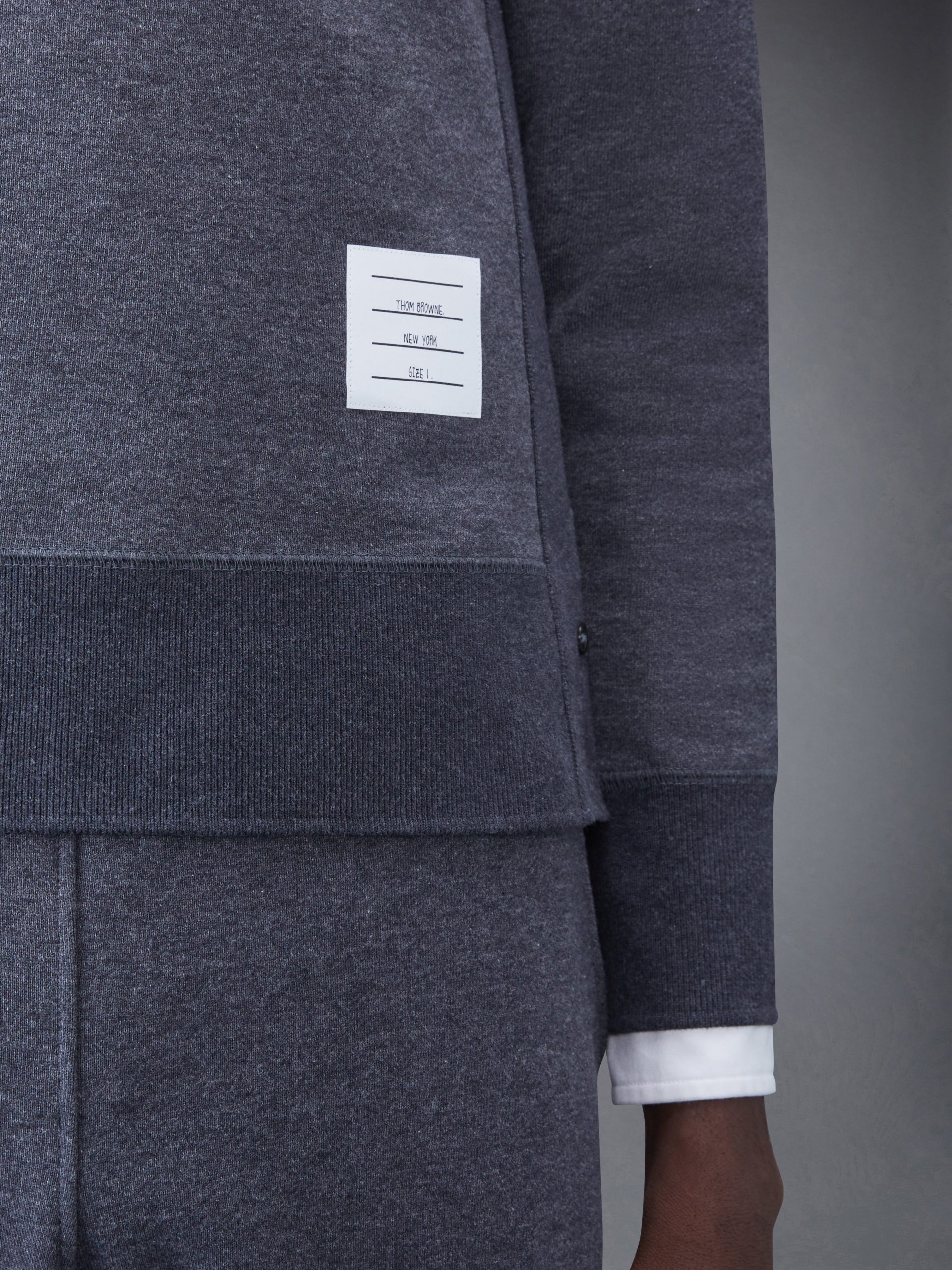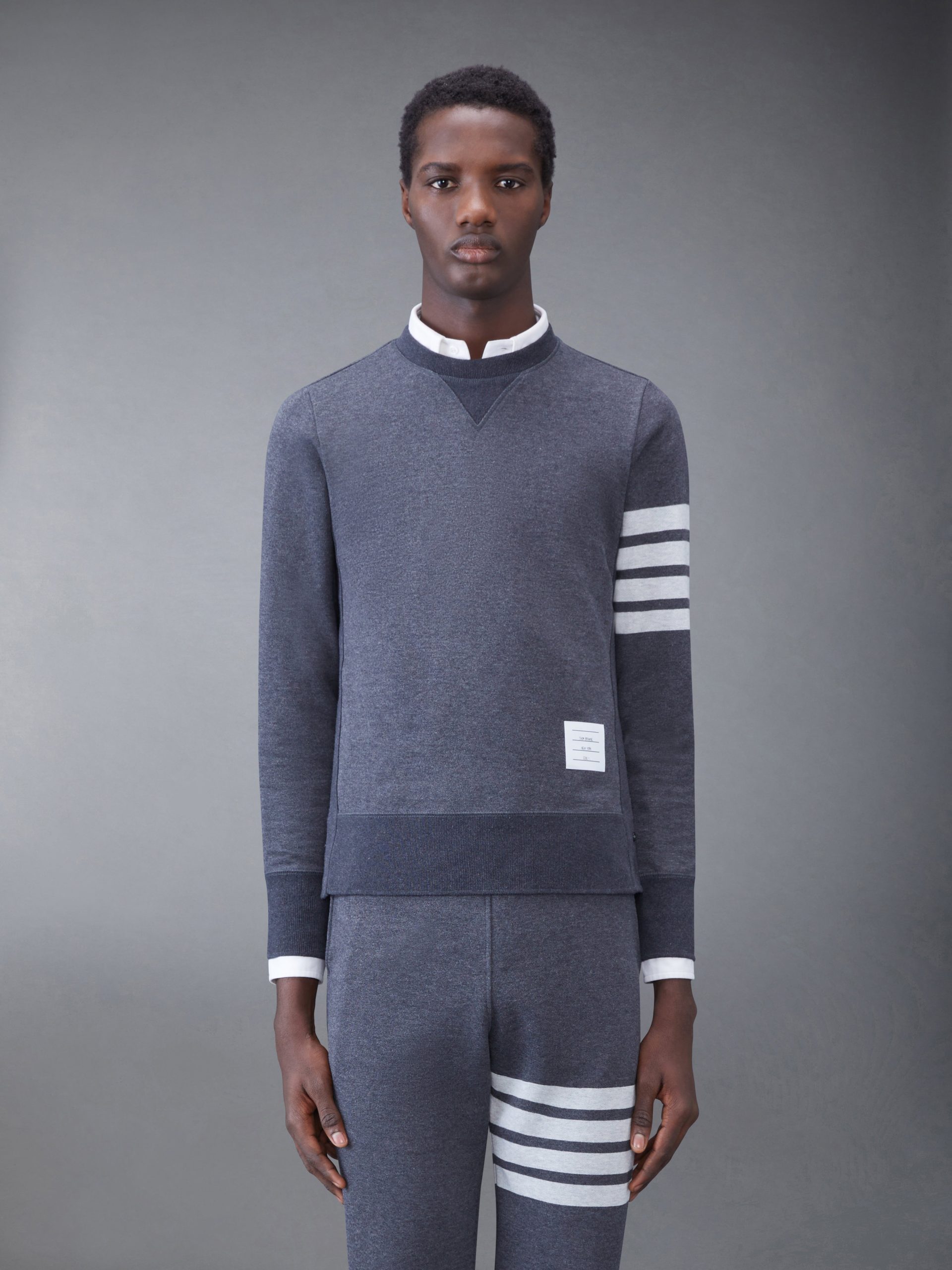 Classic sweatshirt in grey cotton loopback with engineered 4-bar stripe detail at left sleeve in white. Crew neck with V-patch. name tag applique above hem. Ribbed trim at neckline. cuffs. and hem. Buttoned side vents with signature striped grosgrain trim. Signature striped grosgrain loop tab at back of neck.
