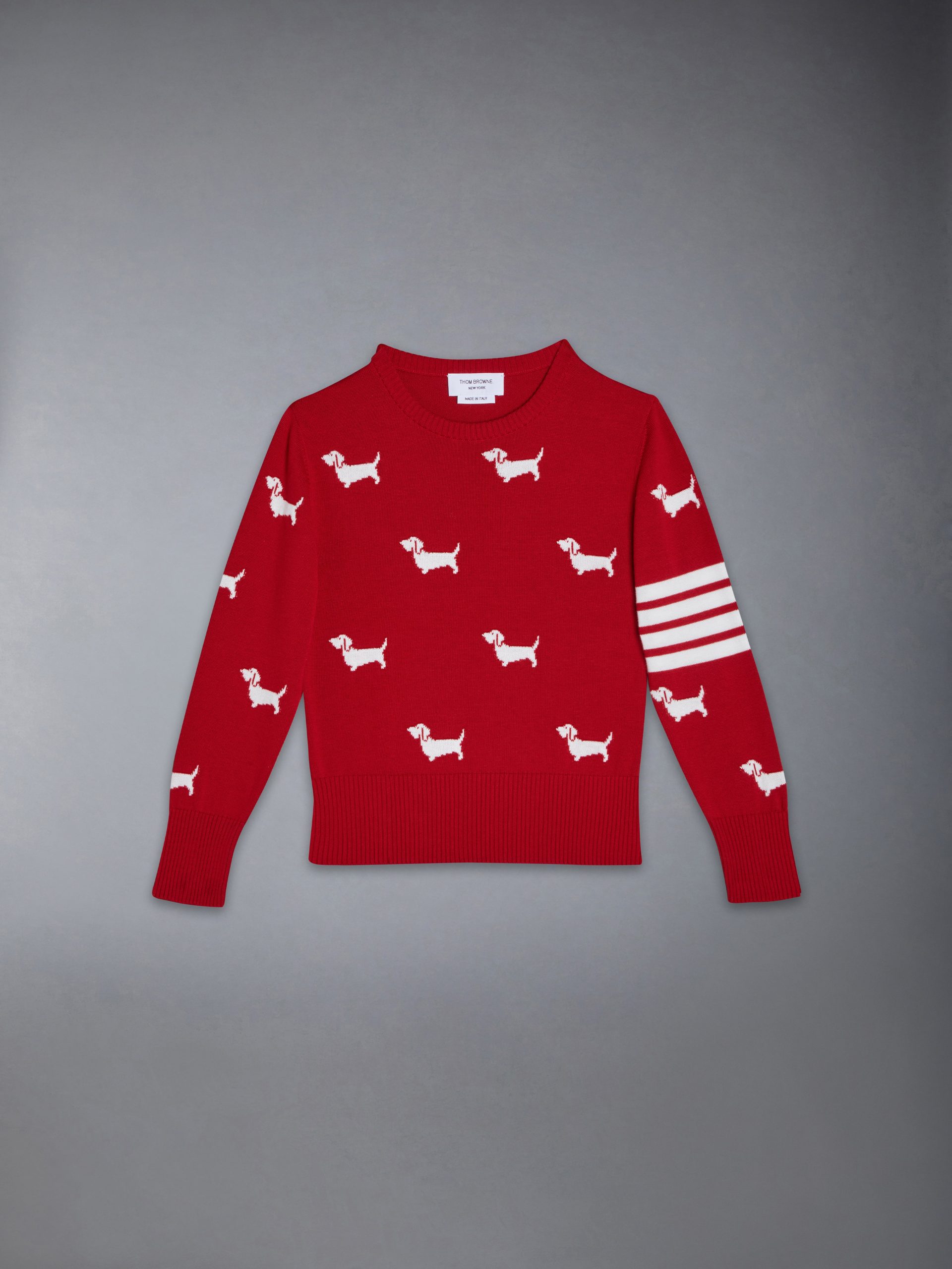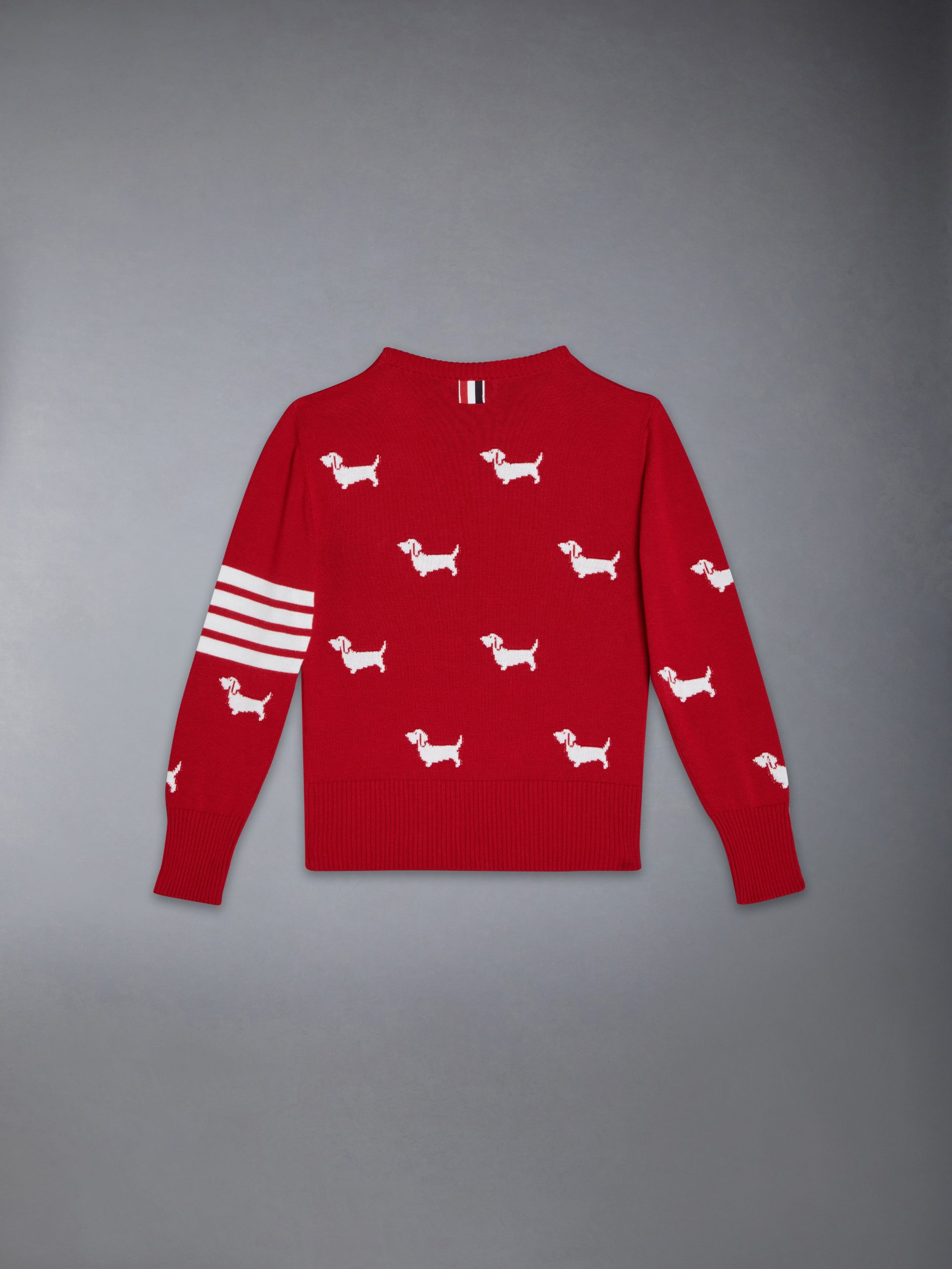 Playful Hector detailing adorns this signature Thom Browne pullover. Add spunk to a pair of plain trousers or style it casually with a pair of dress shorts.