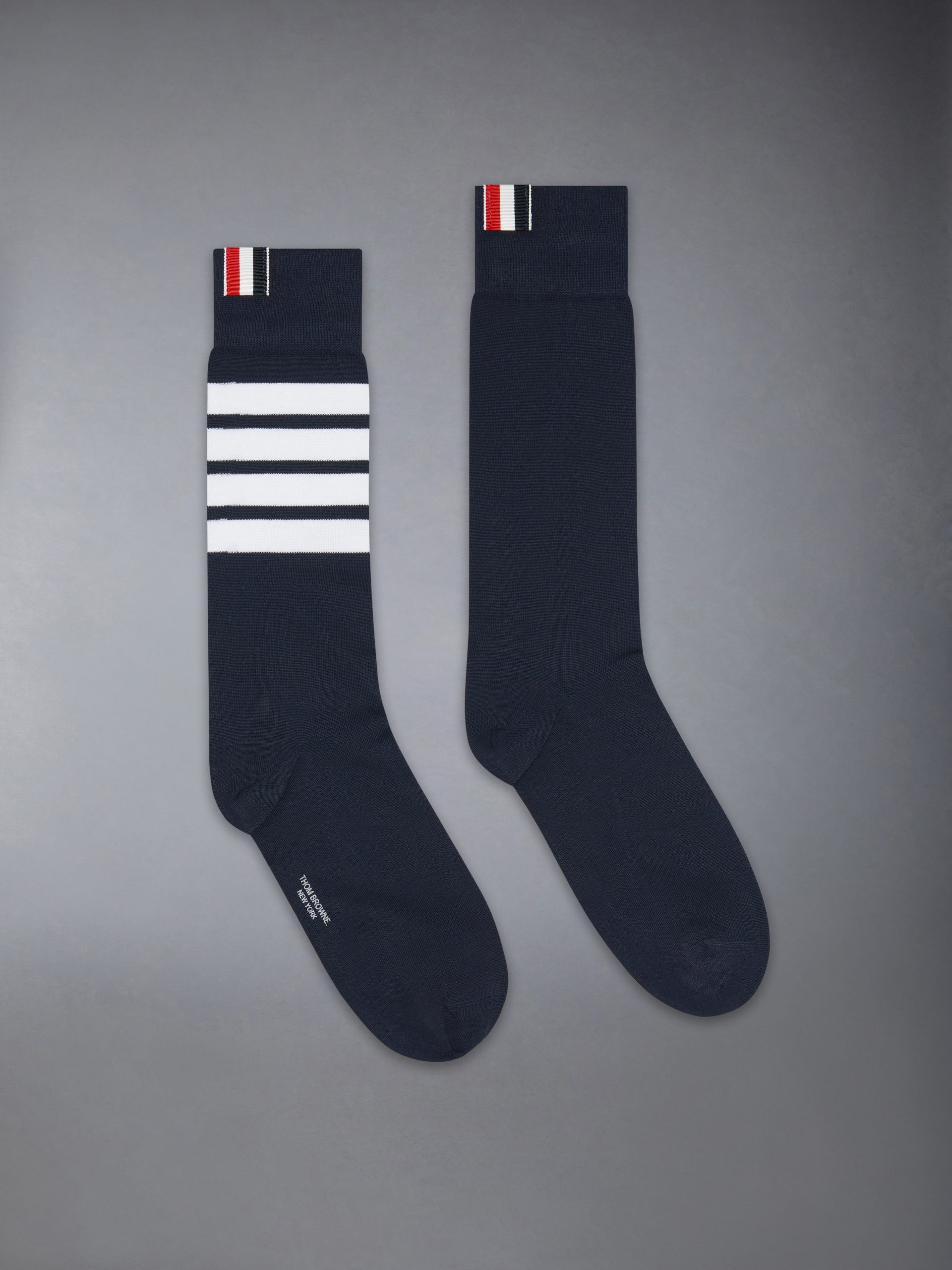 Mid-calf lightweight cotton socks with 4-bar stripe detail at one calf in white.