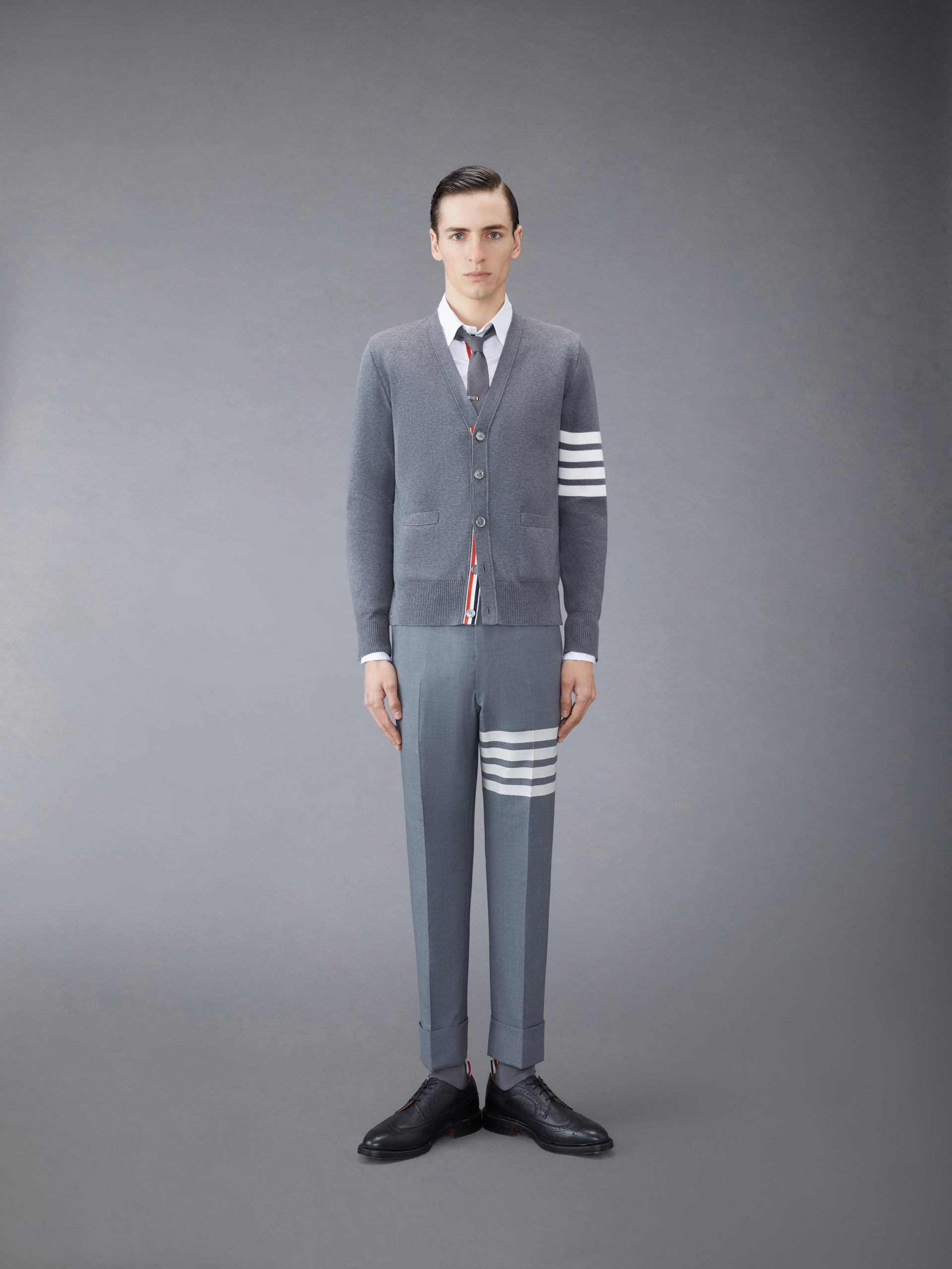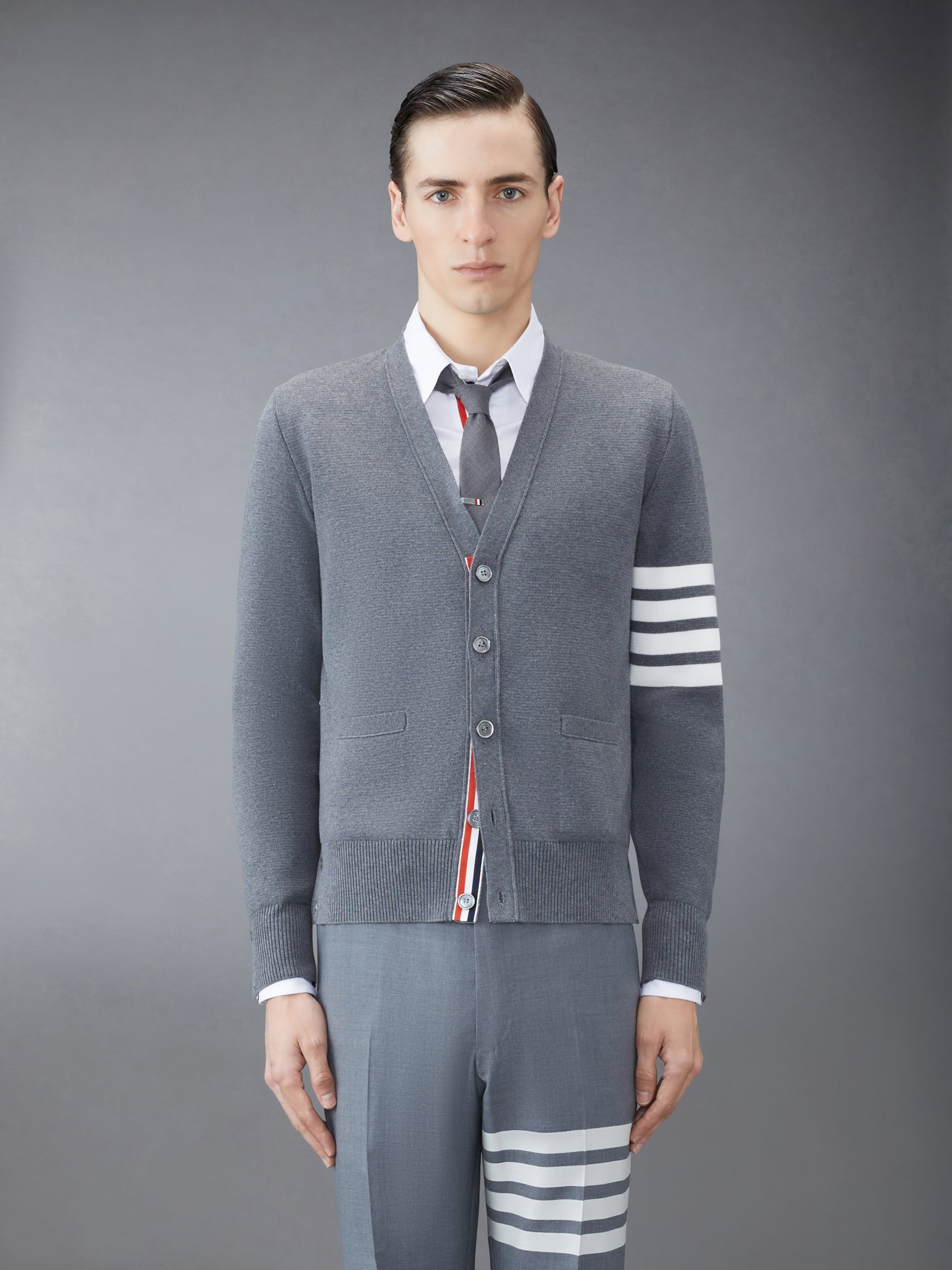 Two Thom Browne emblems define our Cotton Crepe V-neck Cardigan??grosgrain trim and 4-Bar stripe detailing. both synonymous with the brand.
