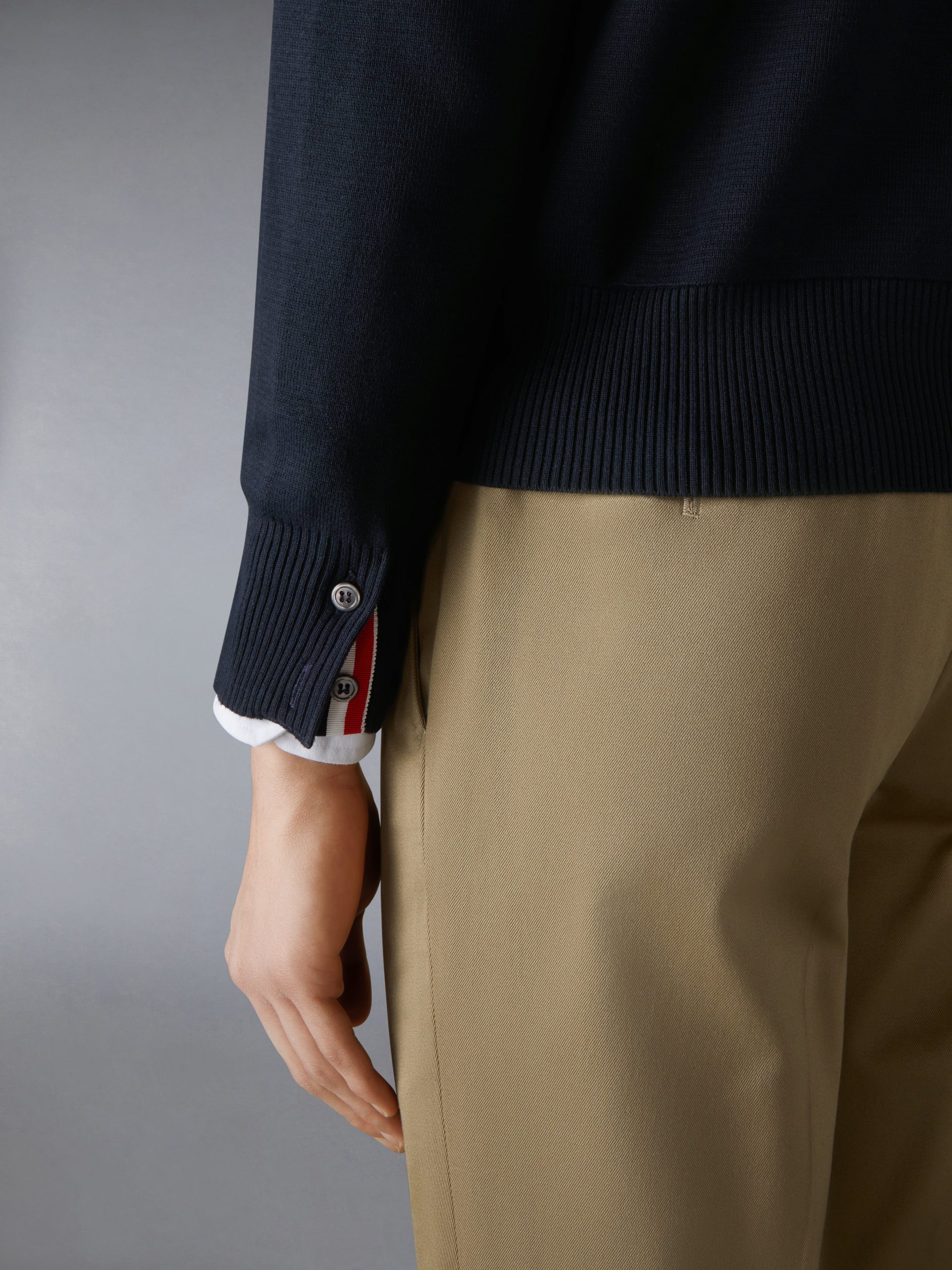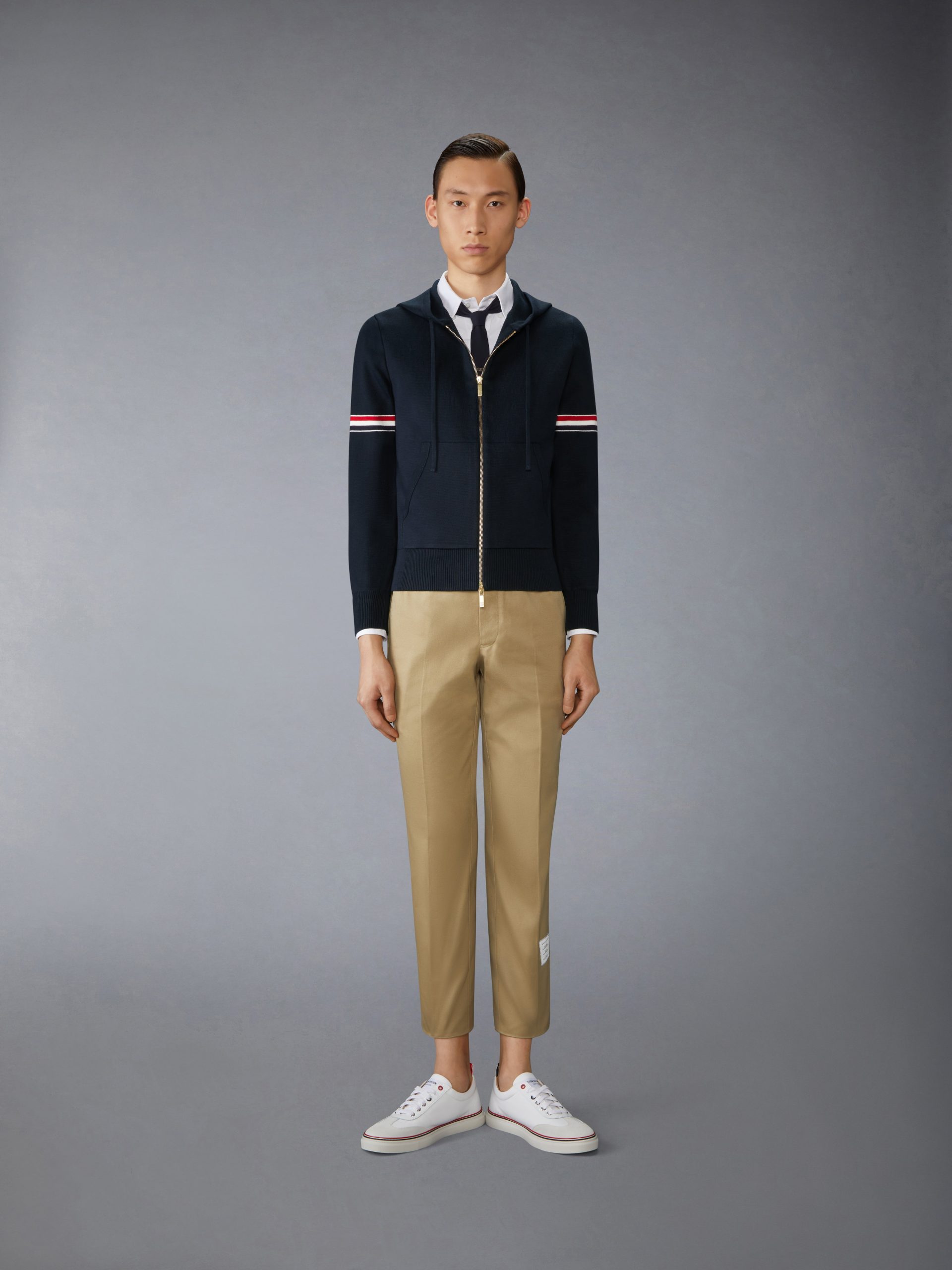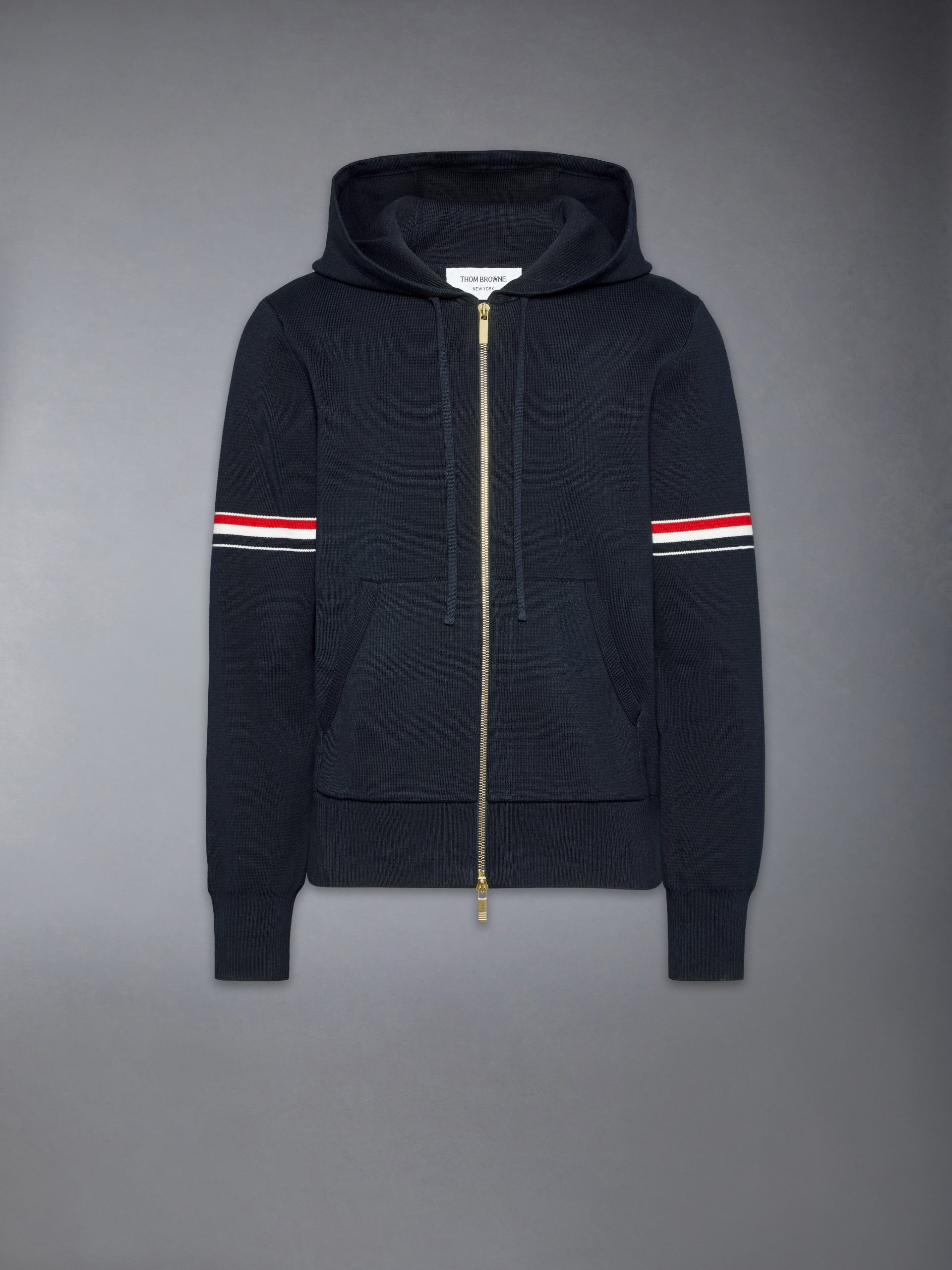 Zip hoodie in navy Milano stitch cotton with striped grosgrain armbands. 2-way zip closure. drawstring hood. slant welt side pockets. Buttoned cuffs with signature striped grosgrain trim.
