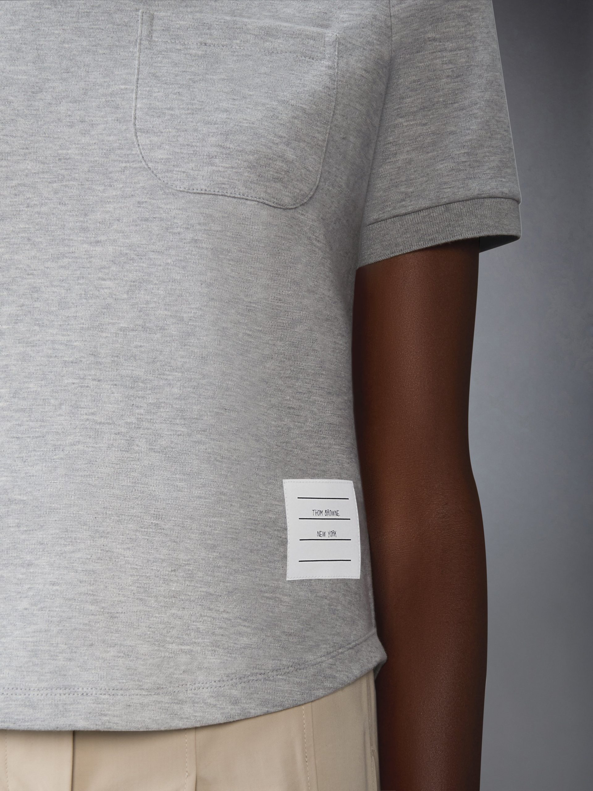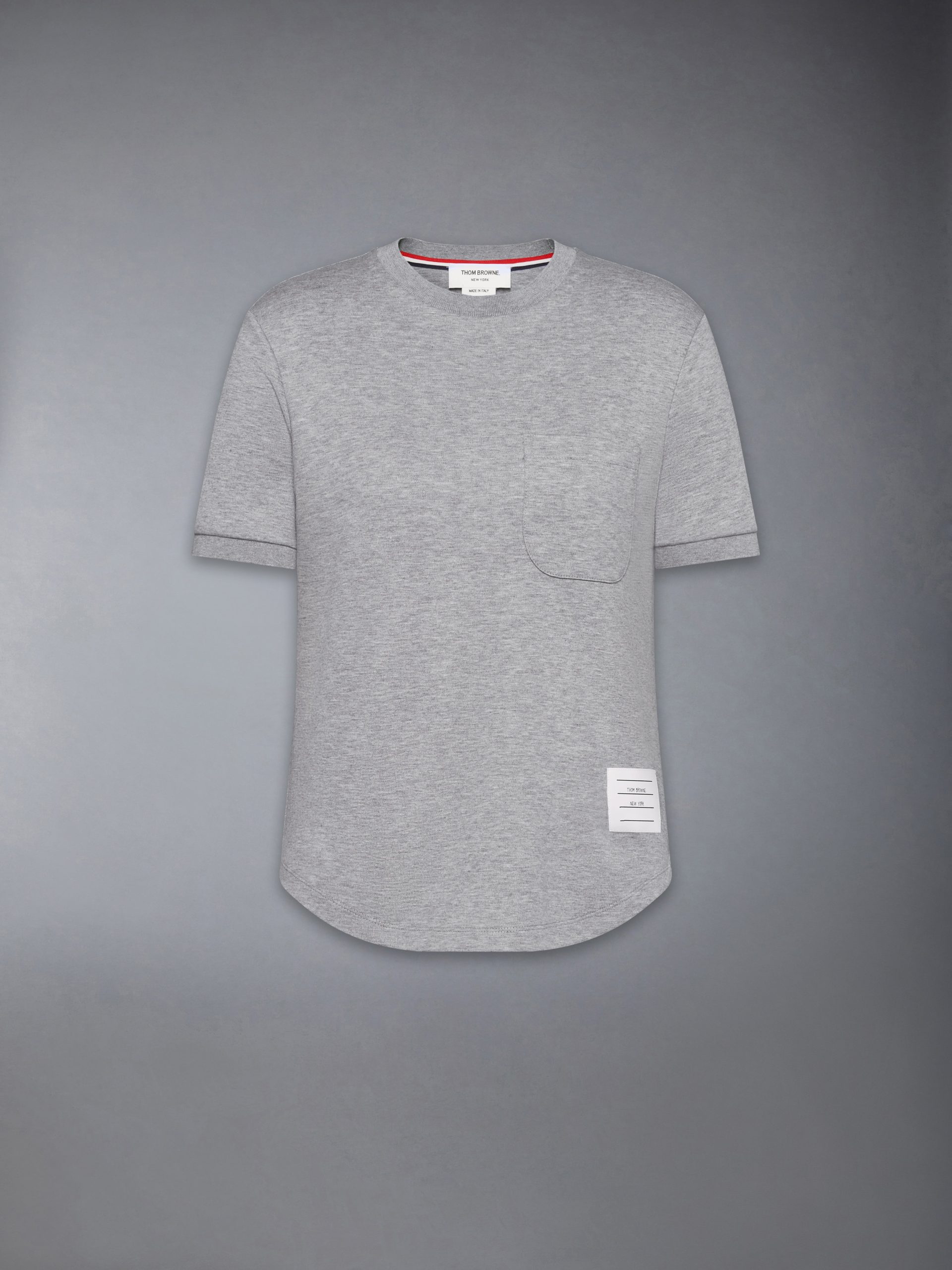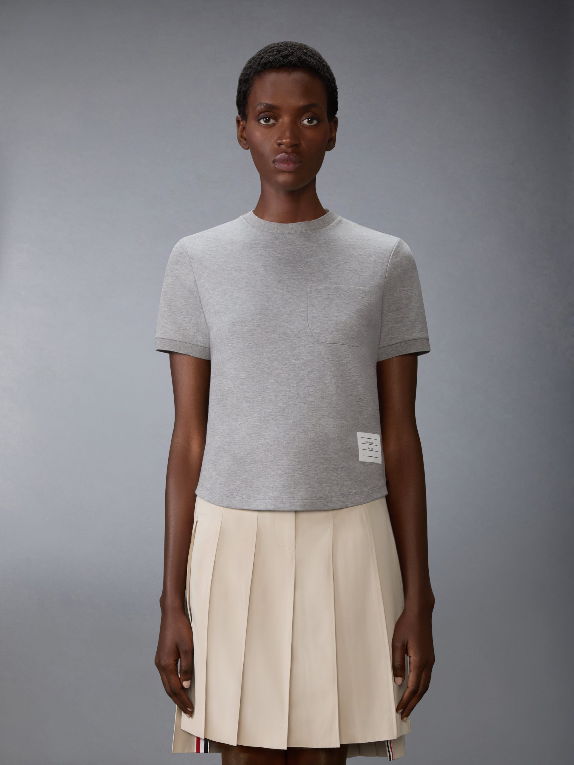 This tee is crafted in structured cotton with a soft hand and clean finish. The rounded hem and minimal chest pocket lend subtle shaping. while signature Thom Browne emblems bring clarity to an enduring staple. Pair with a pleated skirt and Collegiate Sneakers to echo classic campus codes.