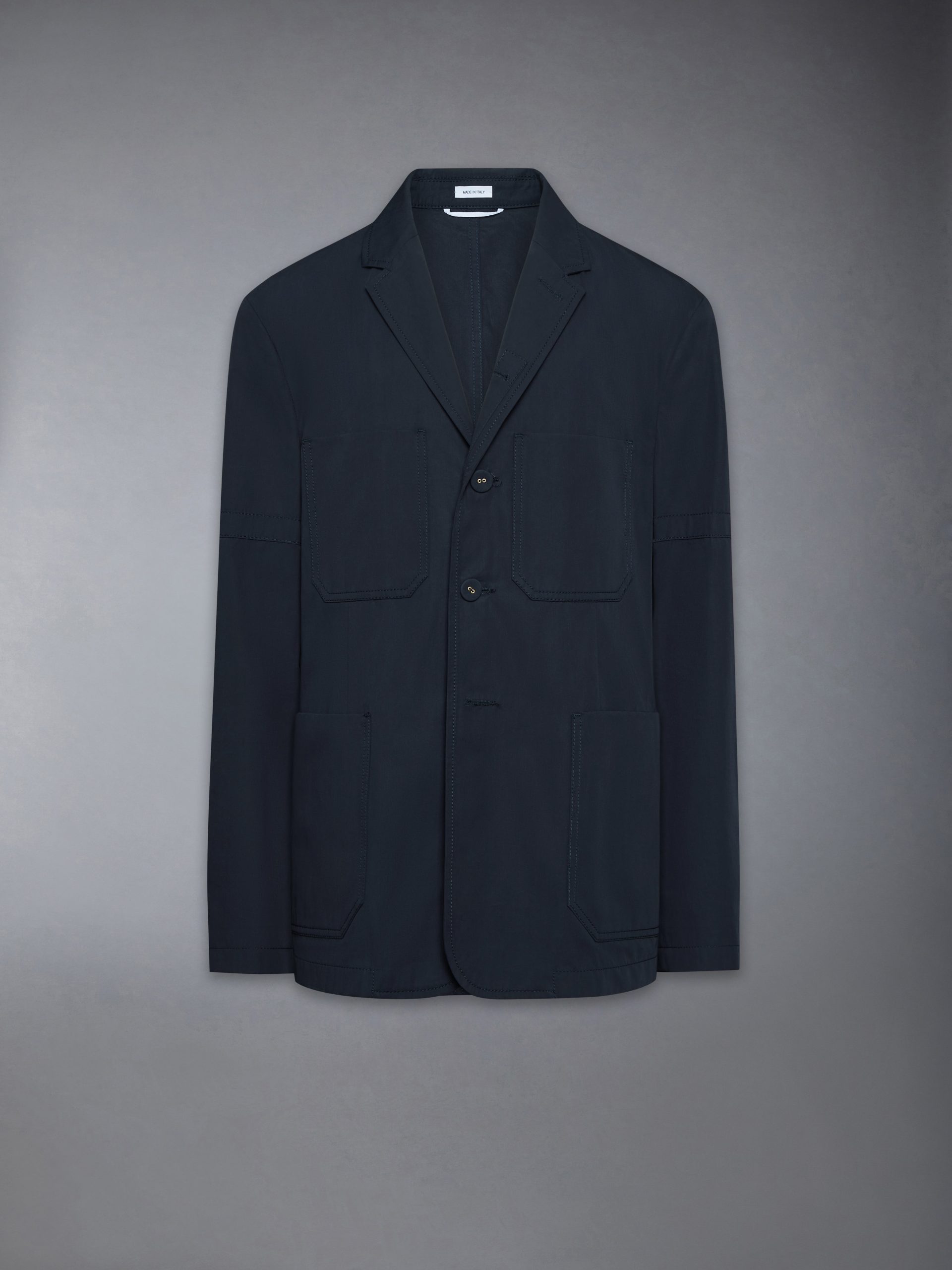 Utility meets precision in this unconstructed sport coat. cut in high-density typewriter cotton with a crisp. crease-resistant finish. A high-buttoning front reinforces the structured feel. while patch pockets nod to classic carpenter design and a cinching belt brings a tailored edge to the silhouette. Style with the Typewriter Cotton Belted Utility Trouser for a uniform grounded in function and ease.