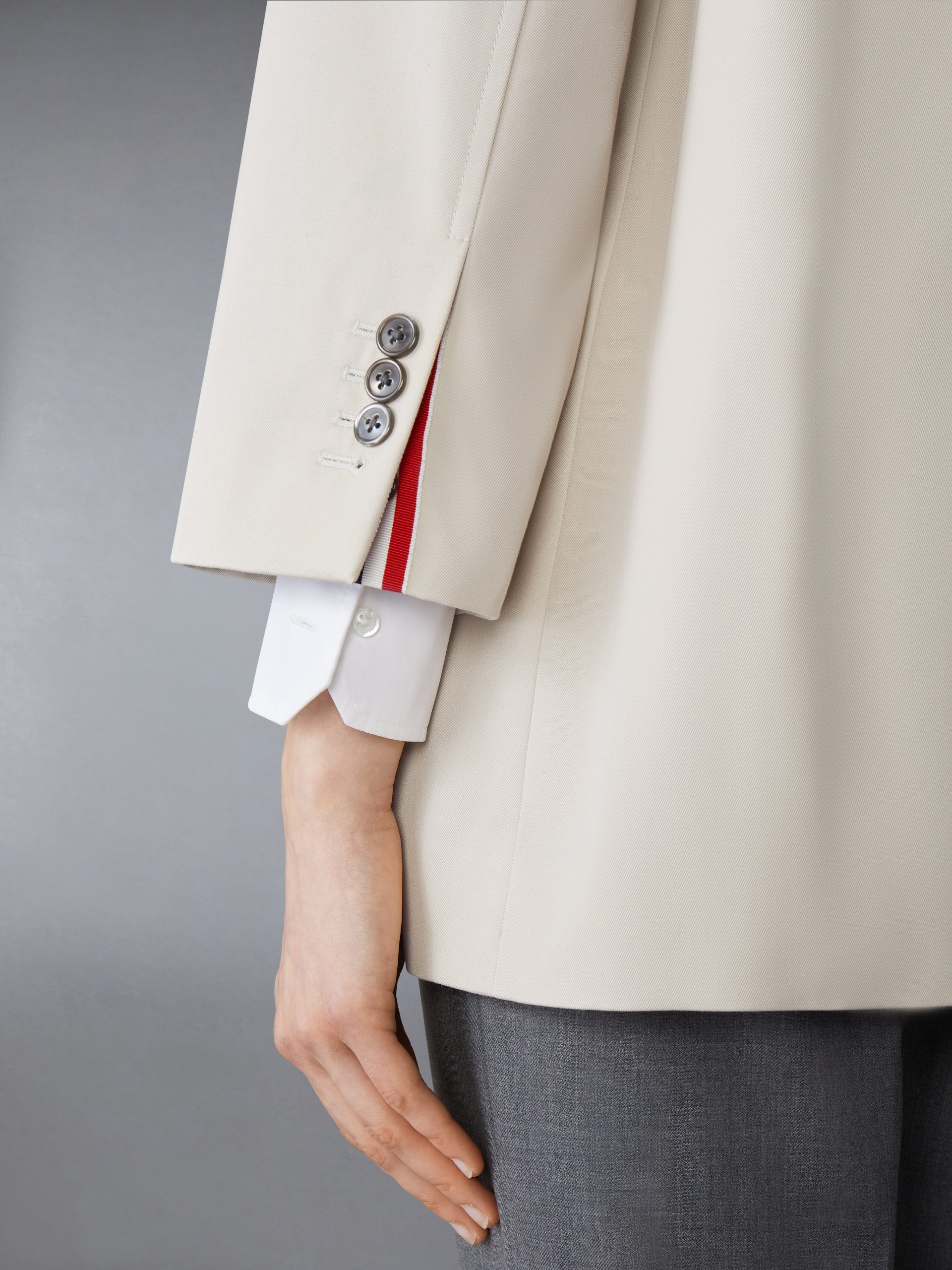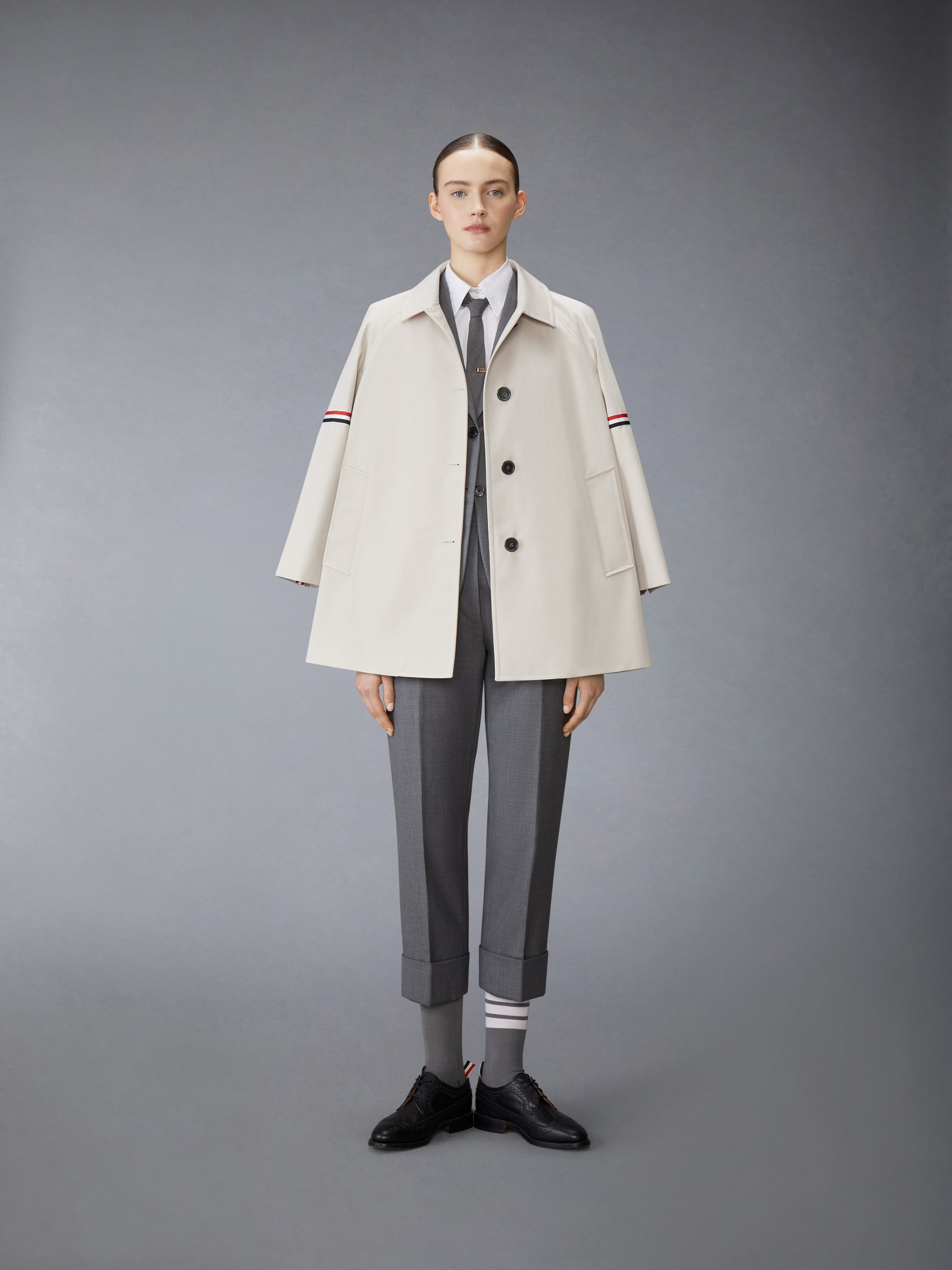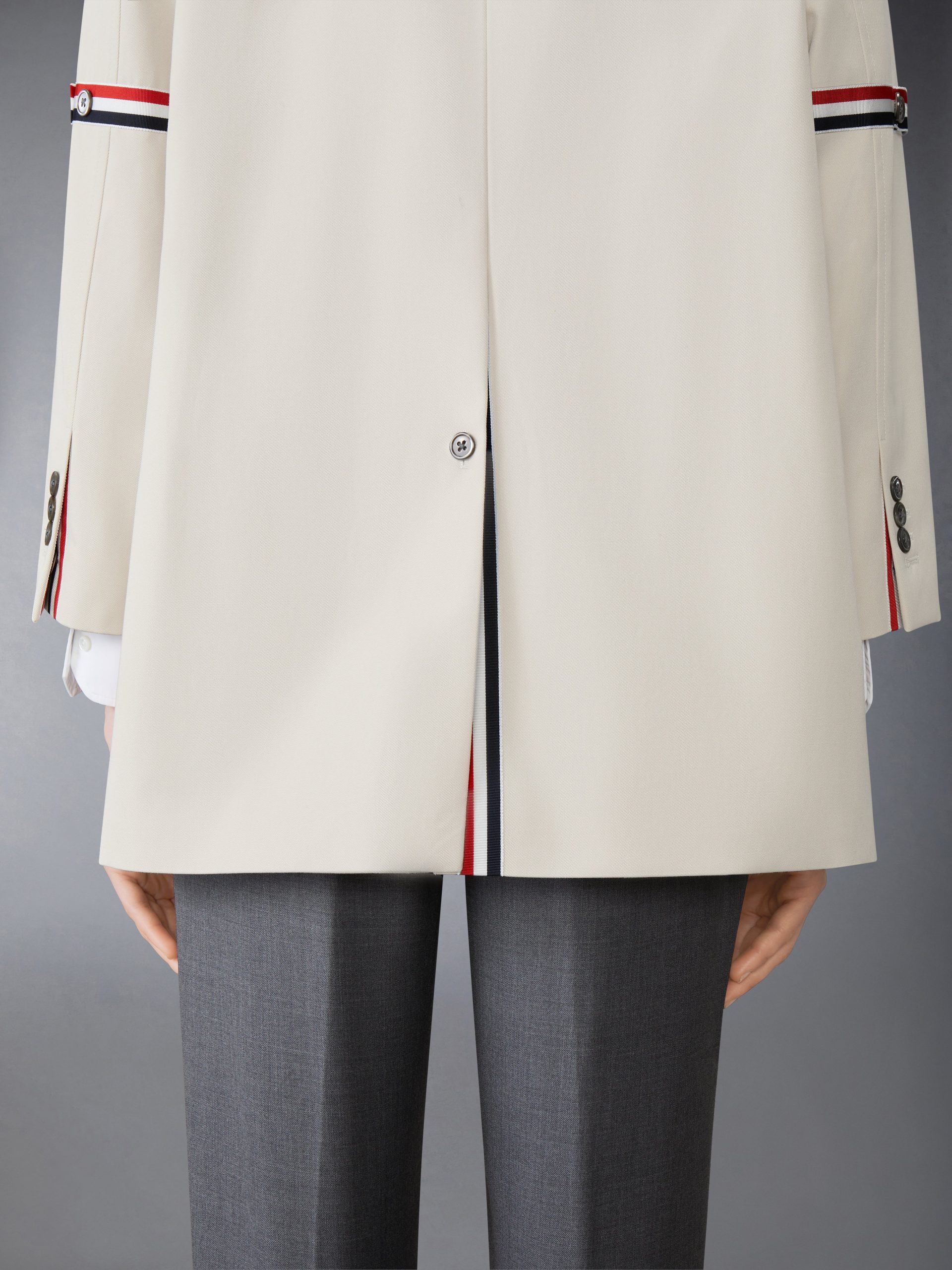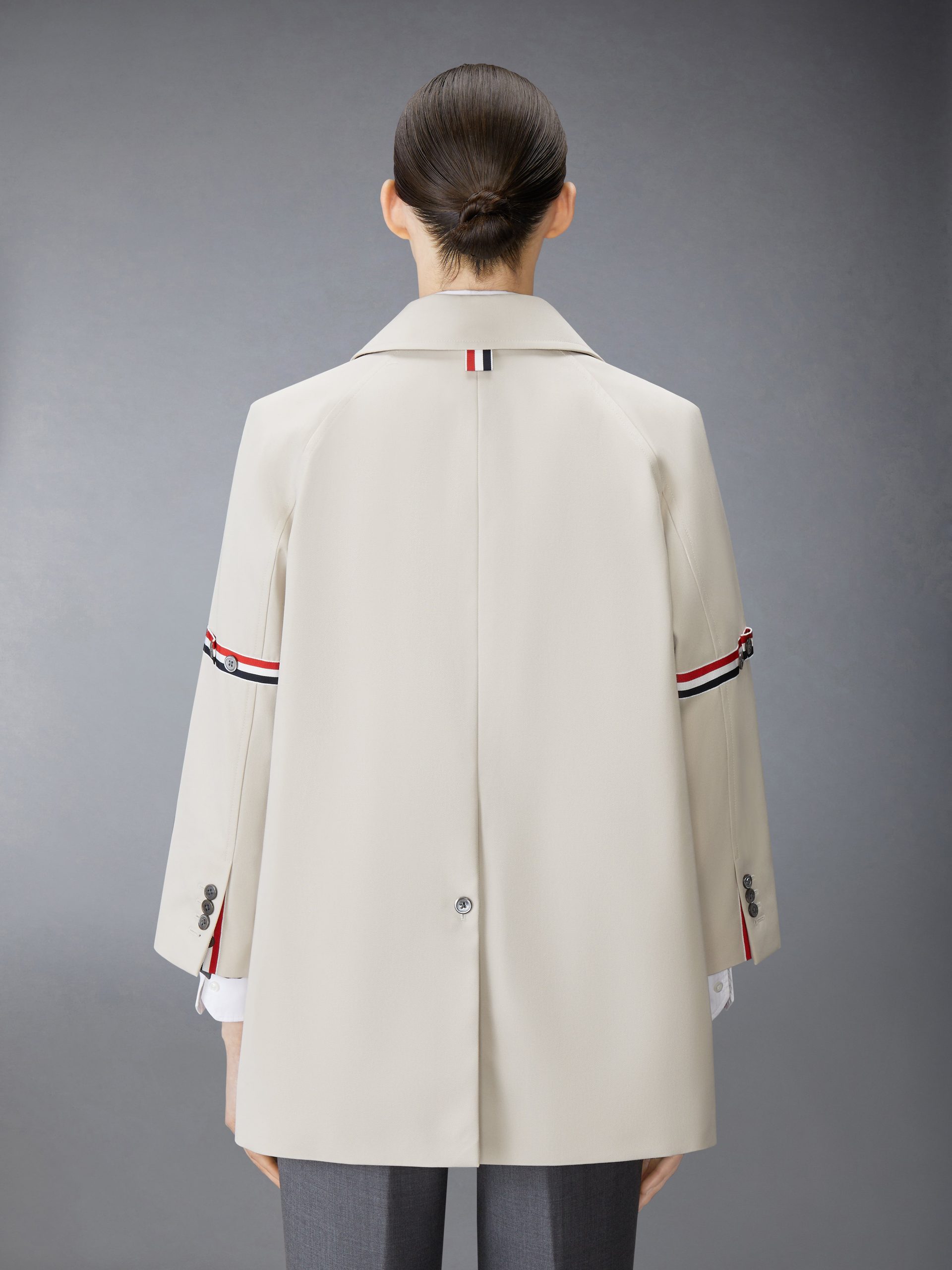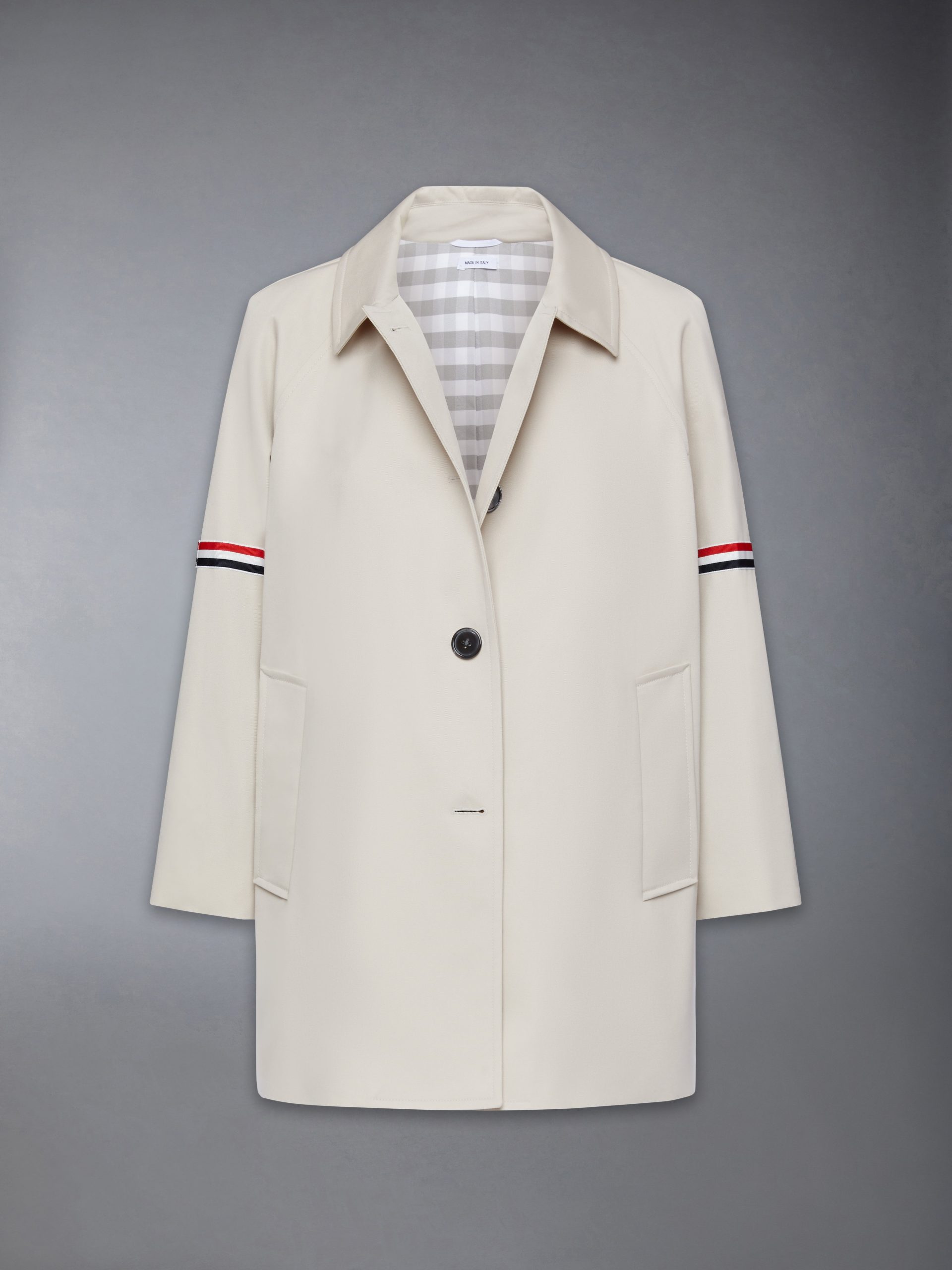 Cropped car coat in waterproof khaki cotton twill with striped grosgrain armbands. 3-button closure. notched lapels. slant welt pockets. Cropped sleeves with buttoned cuffs and striped grosgrain trim. Buttoned single back vent. Gingham lining with interior pocket and name tag. Signature striped grosgrain loop tab at back of neck.