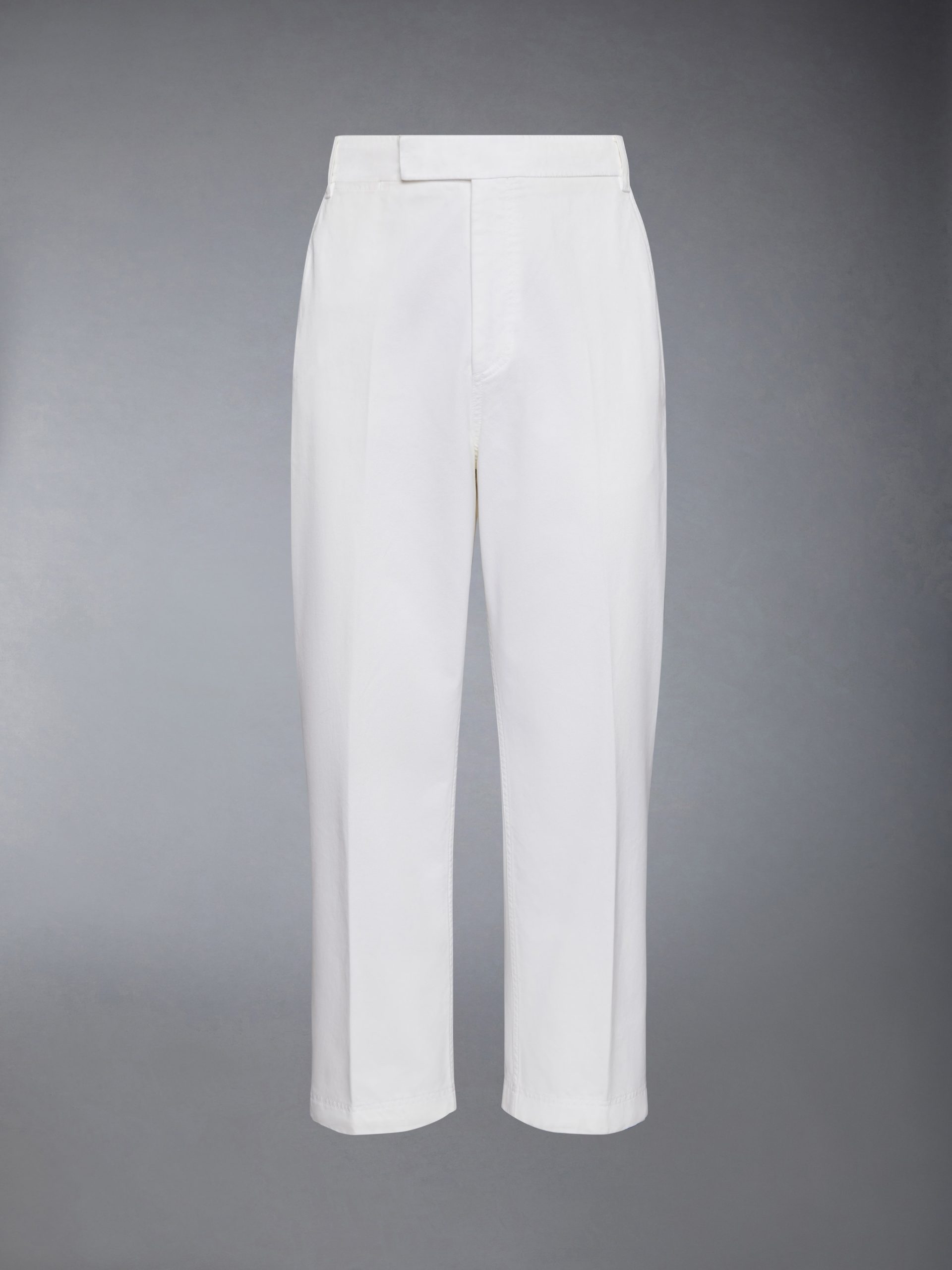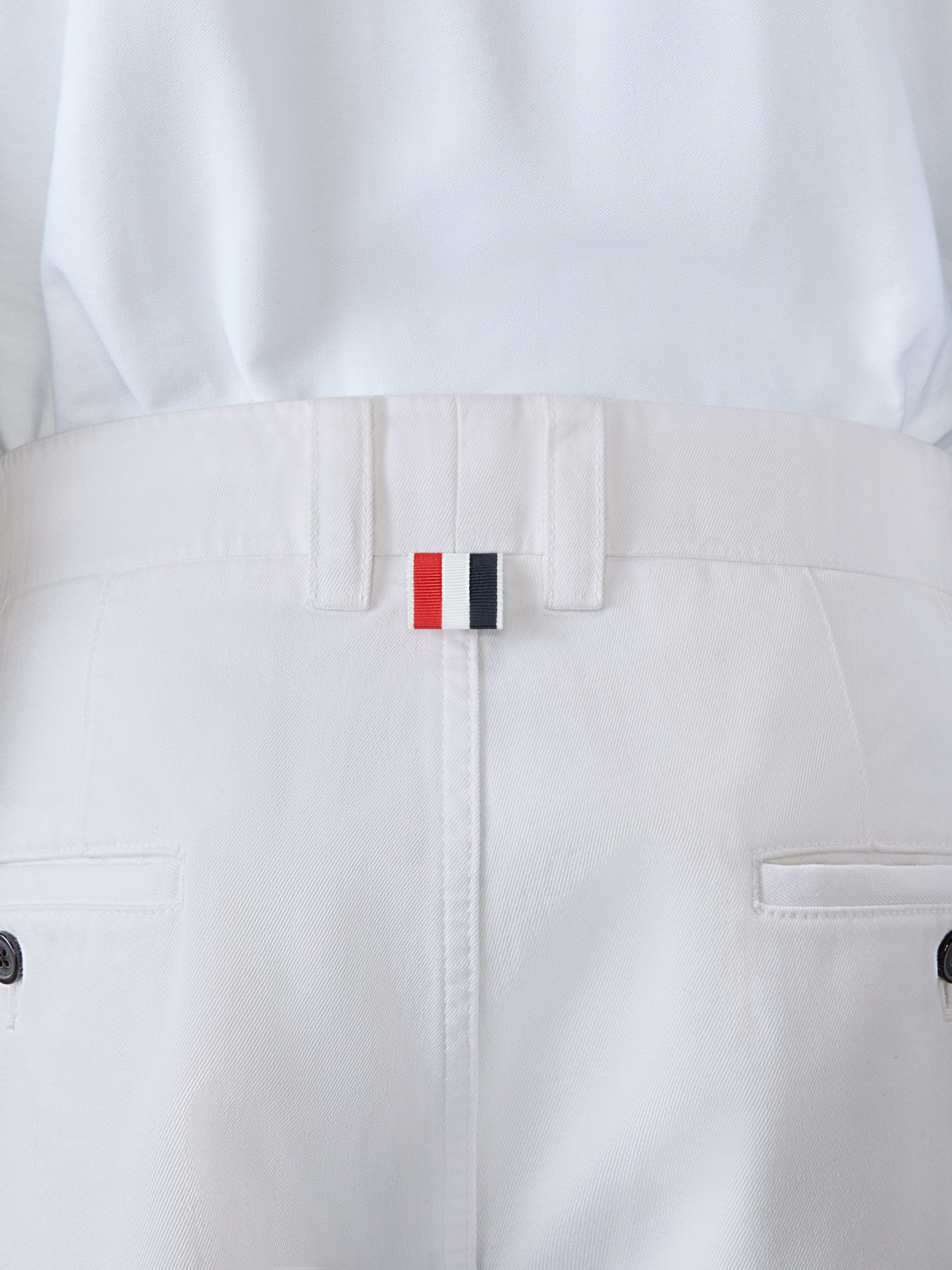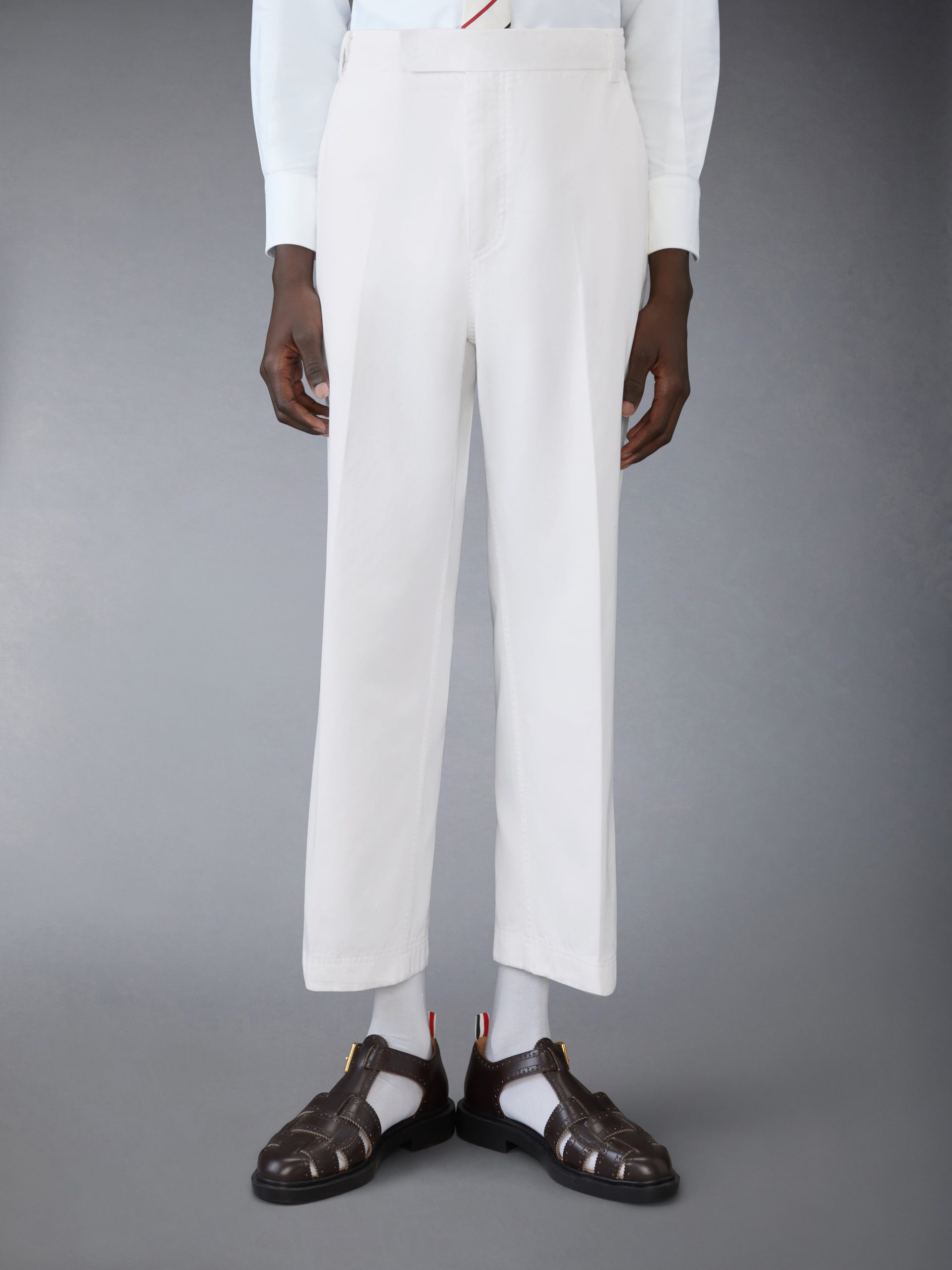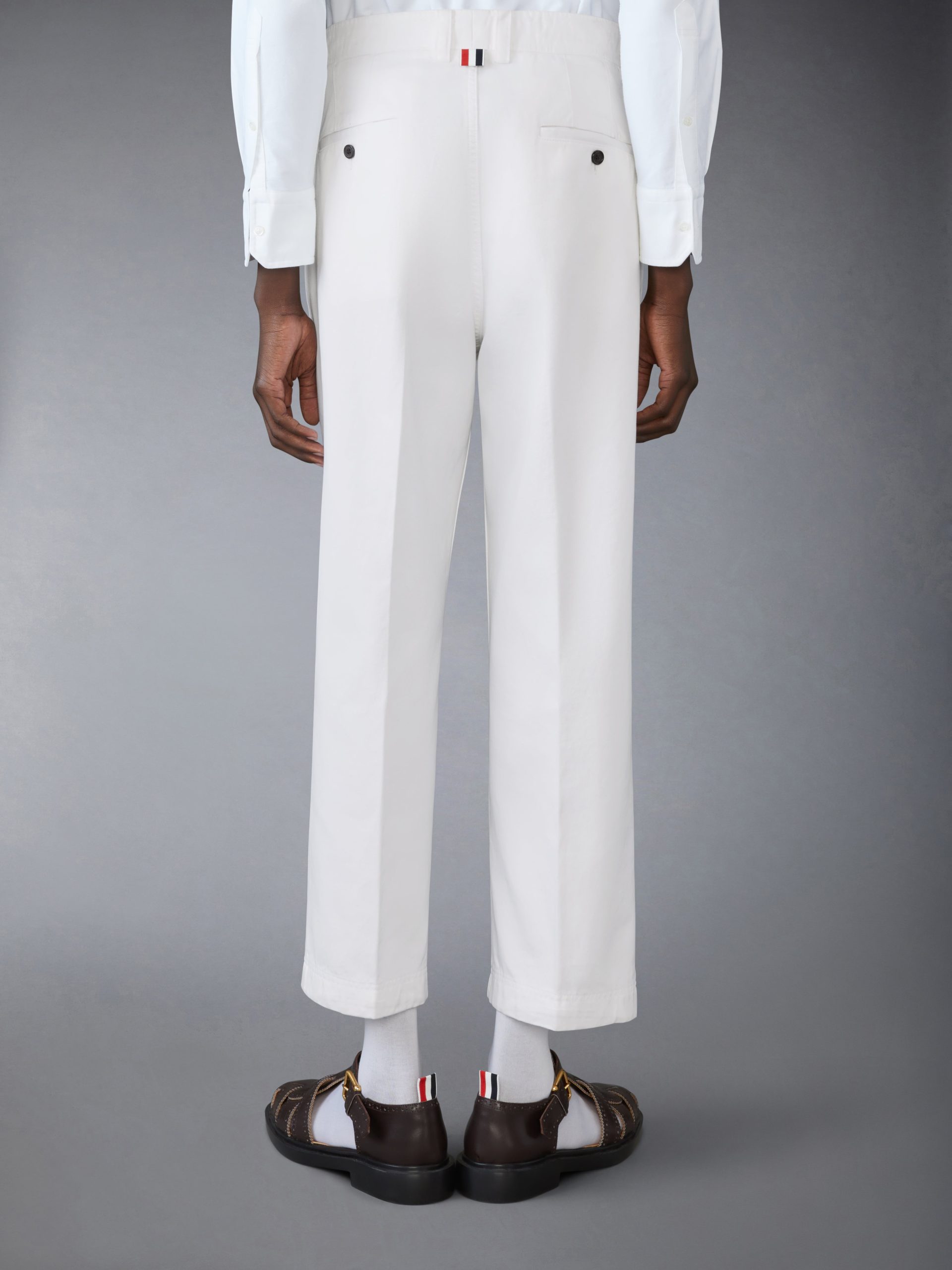 A sophisticated trouser with a shortened hem that pays homage to Thom Browne’s distinguished tailoring. Breathable cotton fabric is a celebration of the season.