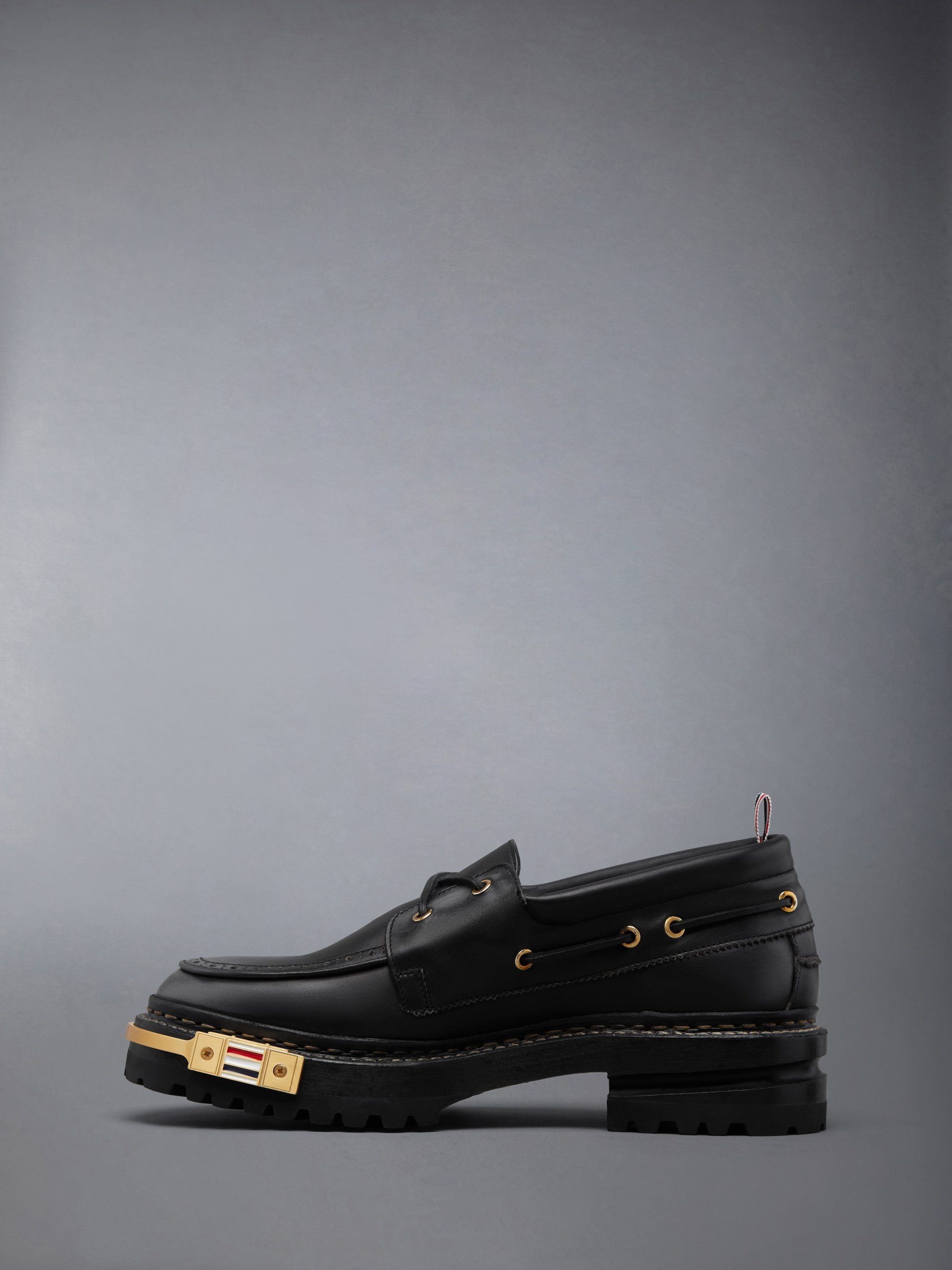 Crafted in calf leather with brogueing along the vamp and a tumbled finish for a subtly worn effect. this design is set on a hiking sole for grip and structure. A gold-tone toe bumper with signature RWB inlay wraps the front—bridging heritage sport references with Thom Browne’s off-duty vocabulary.