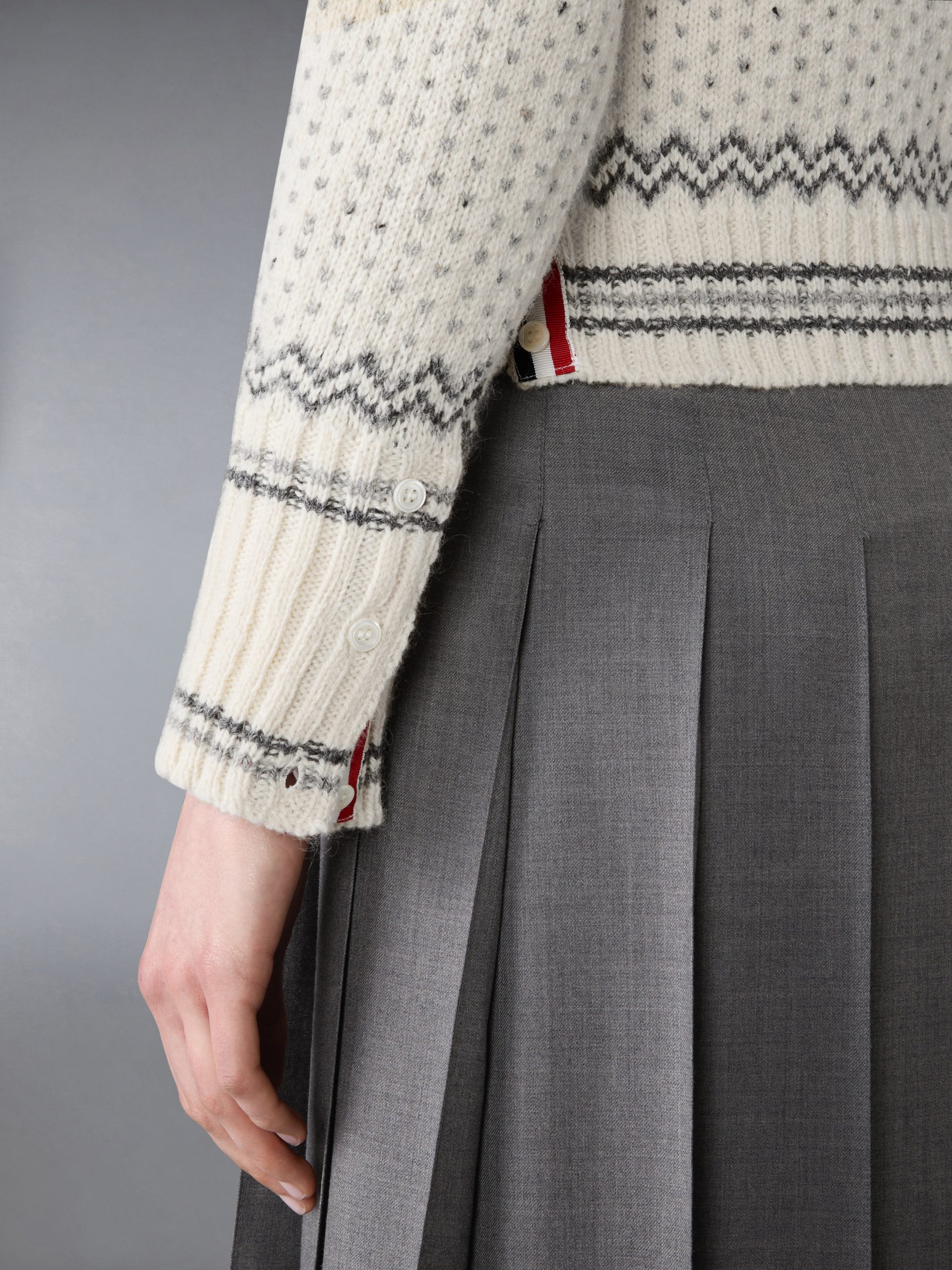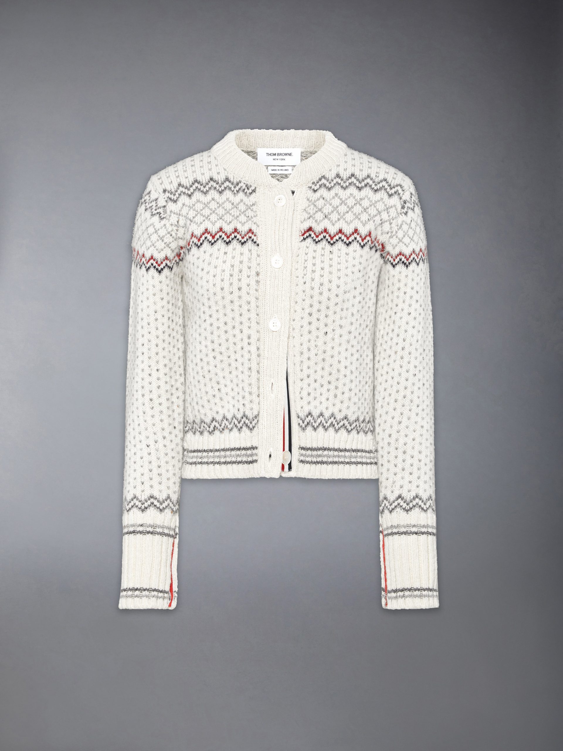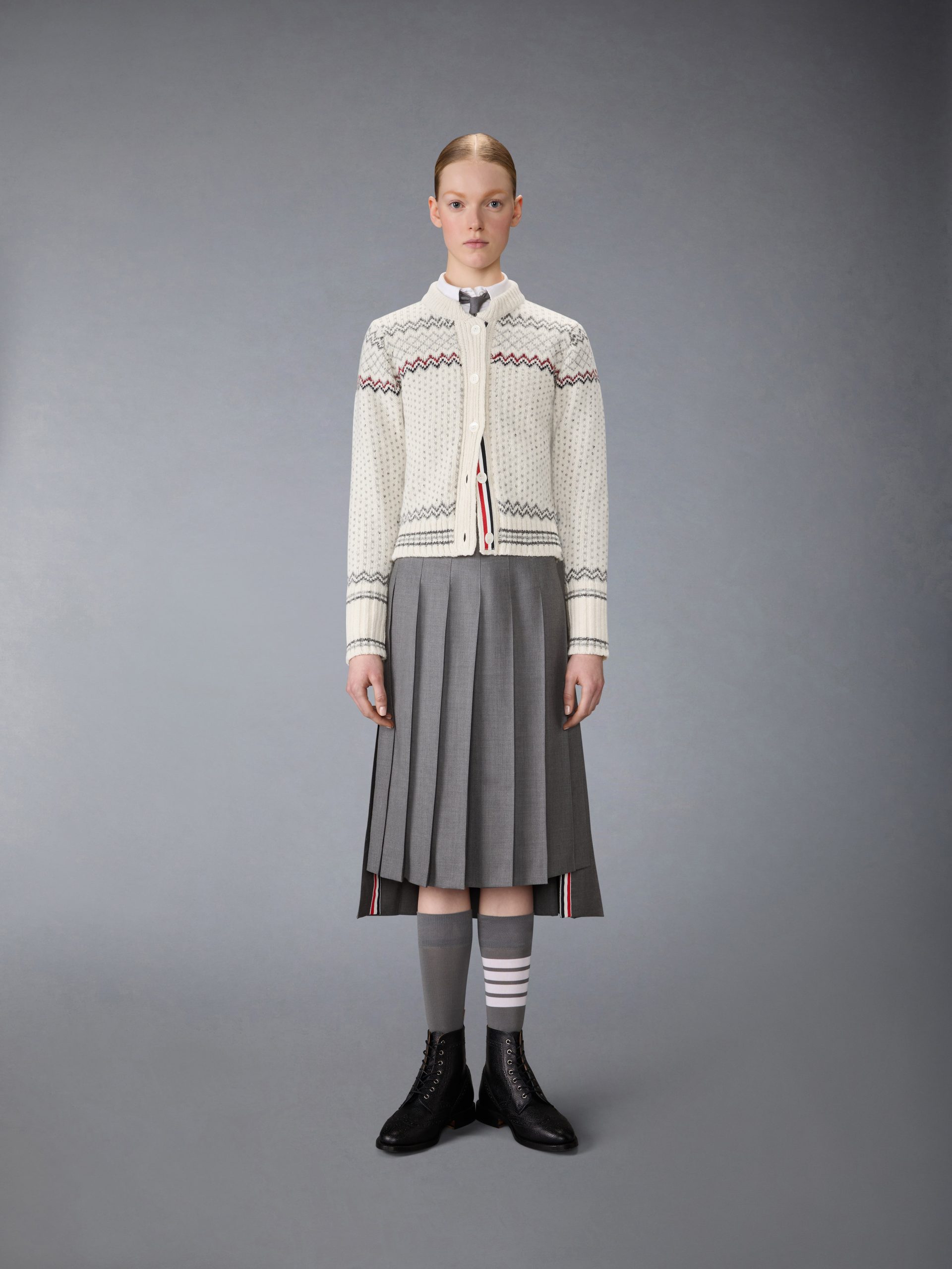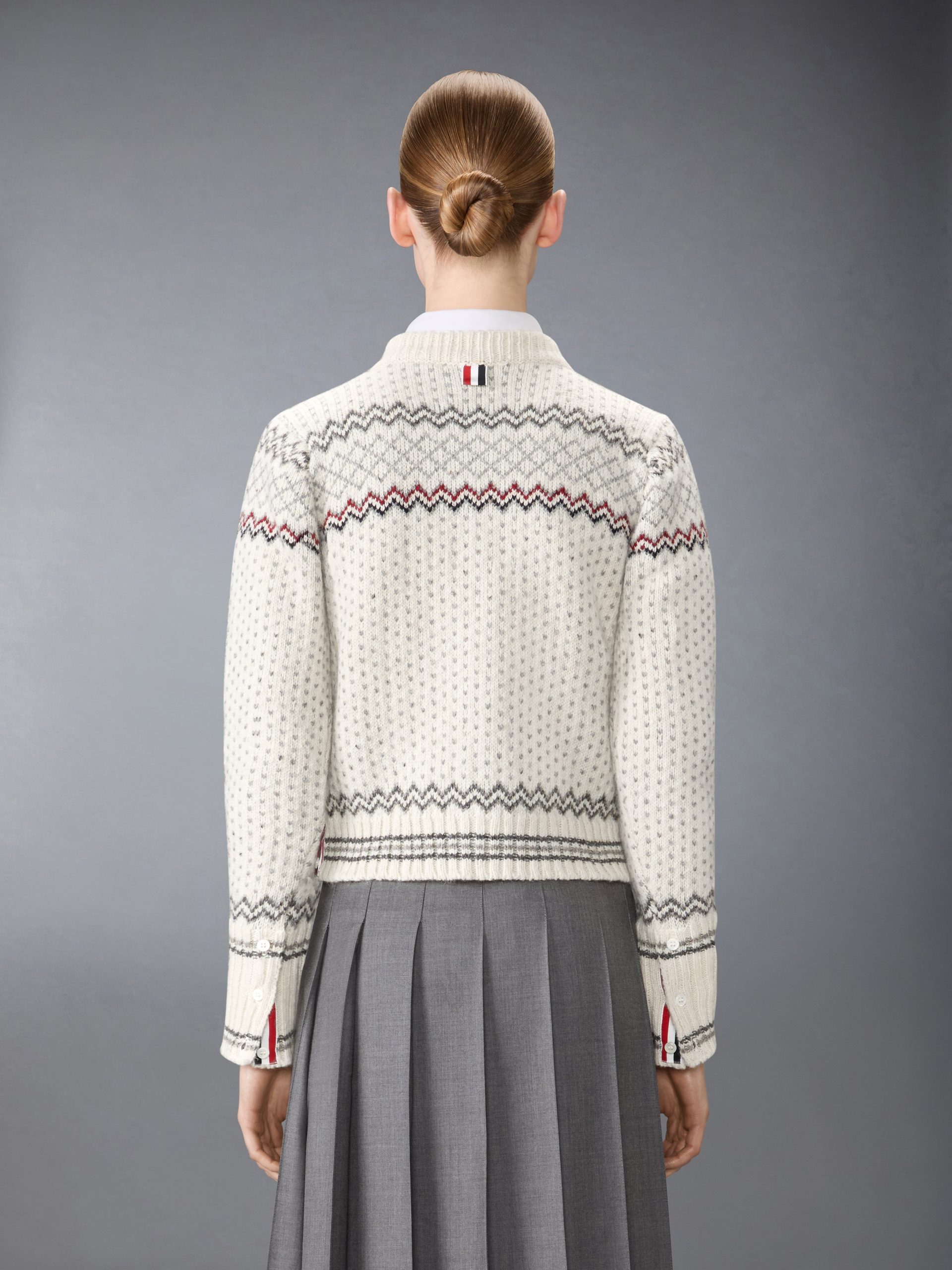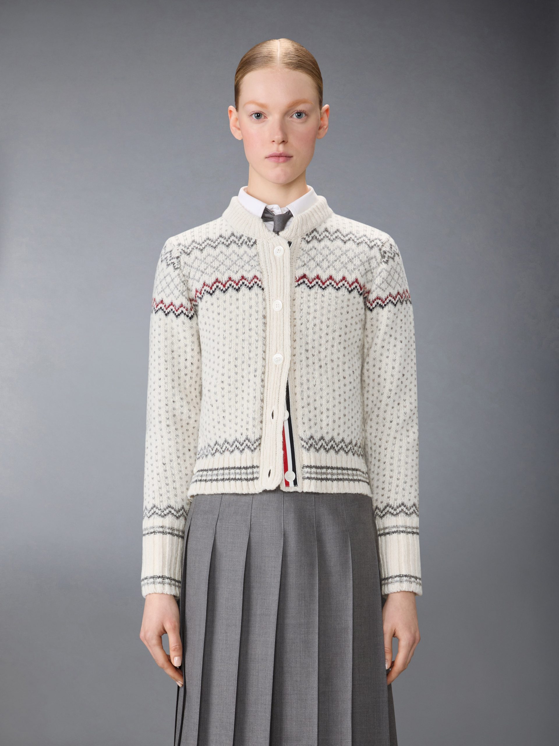 Crafted in a traditional Fair Isle knit. this cozy wool and mohair cardigan is designed to keep you warm all season long. A blend of heritage charm and modern craftsmanship. it features our signature grosgrain trim along the placket. Pair it effortlessly with our Twill Midi Pleated Skirt.
