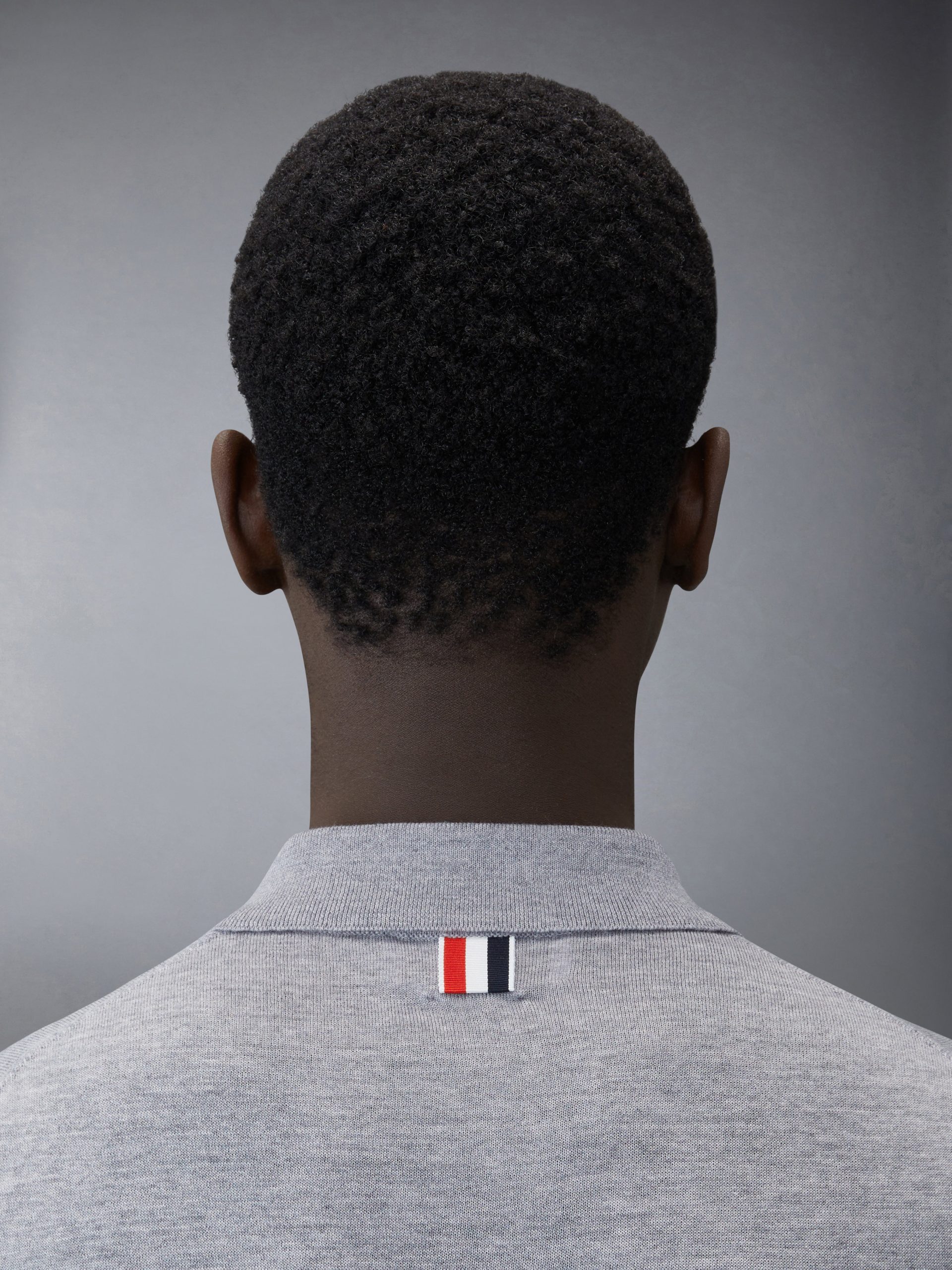 Signature striped grosgrain loop tab at back of neck