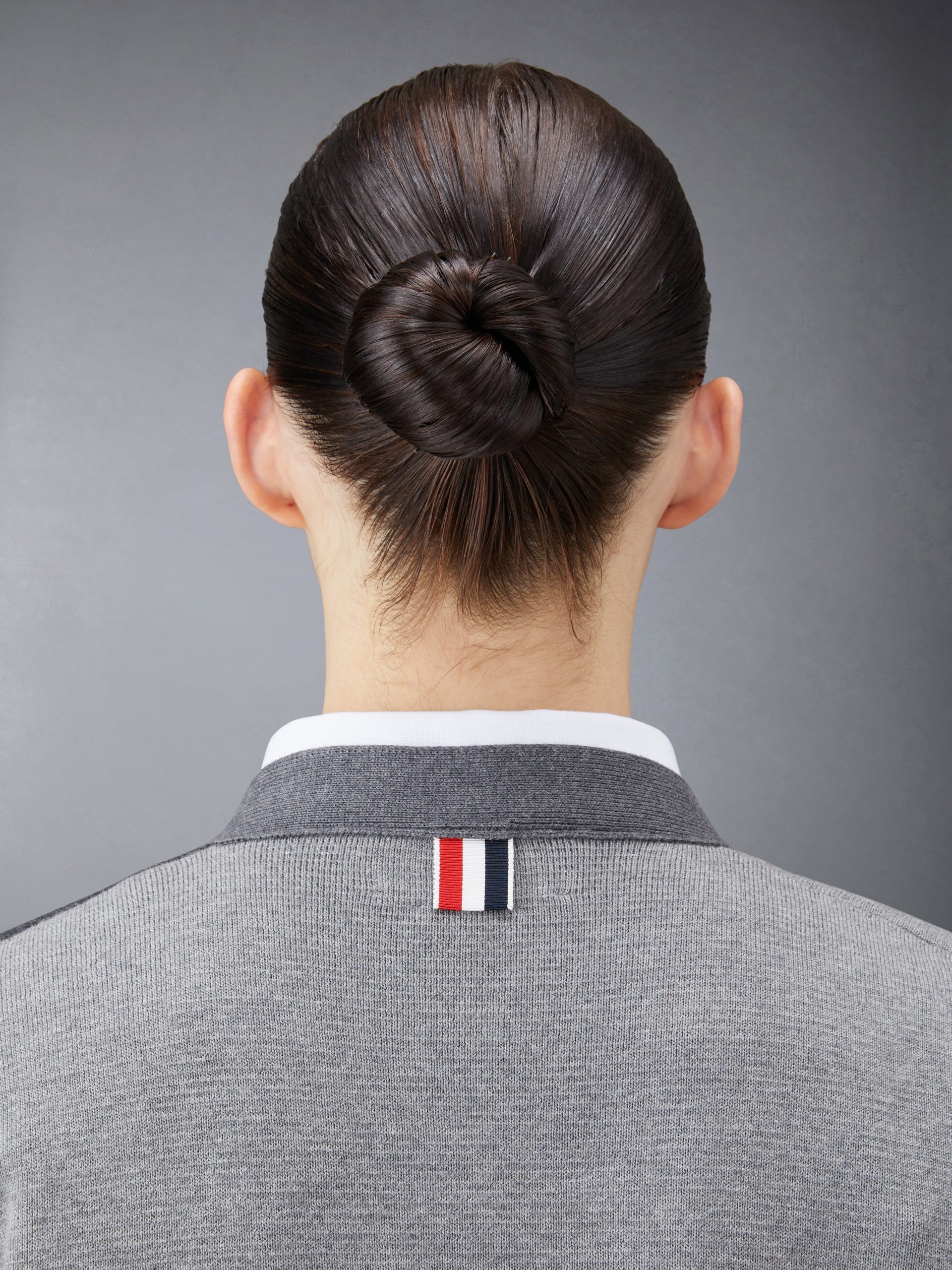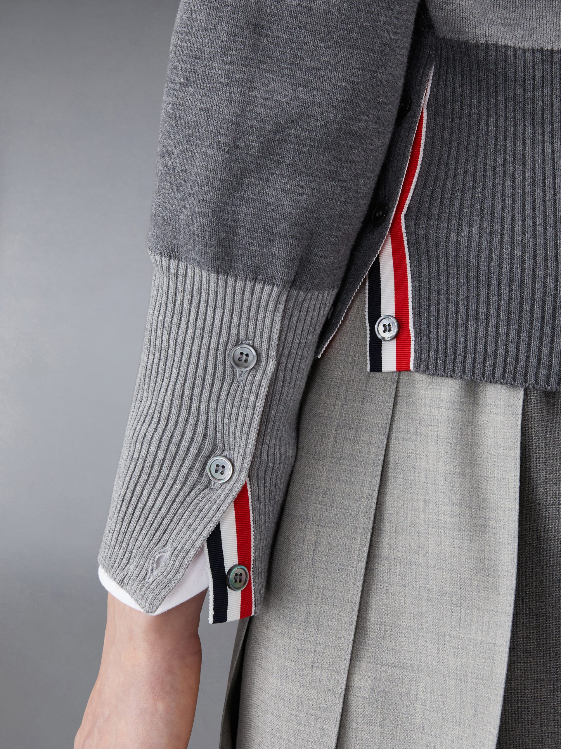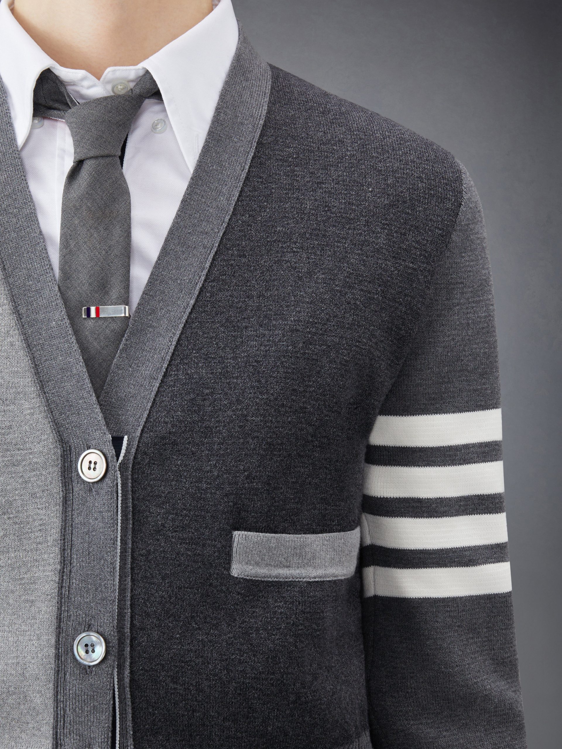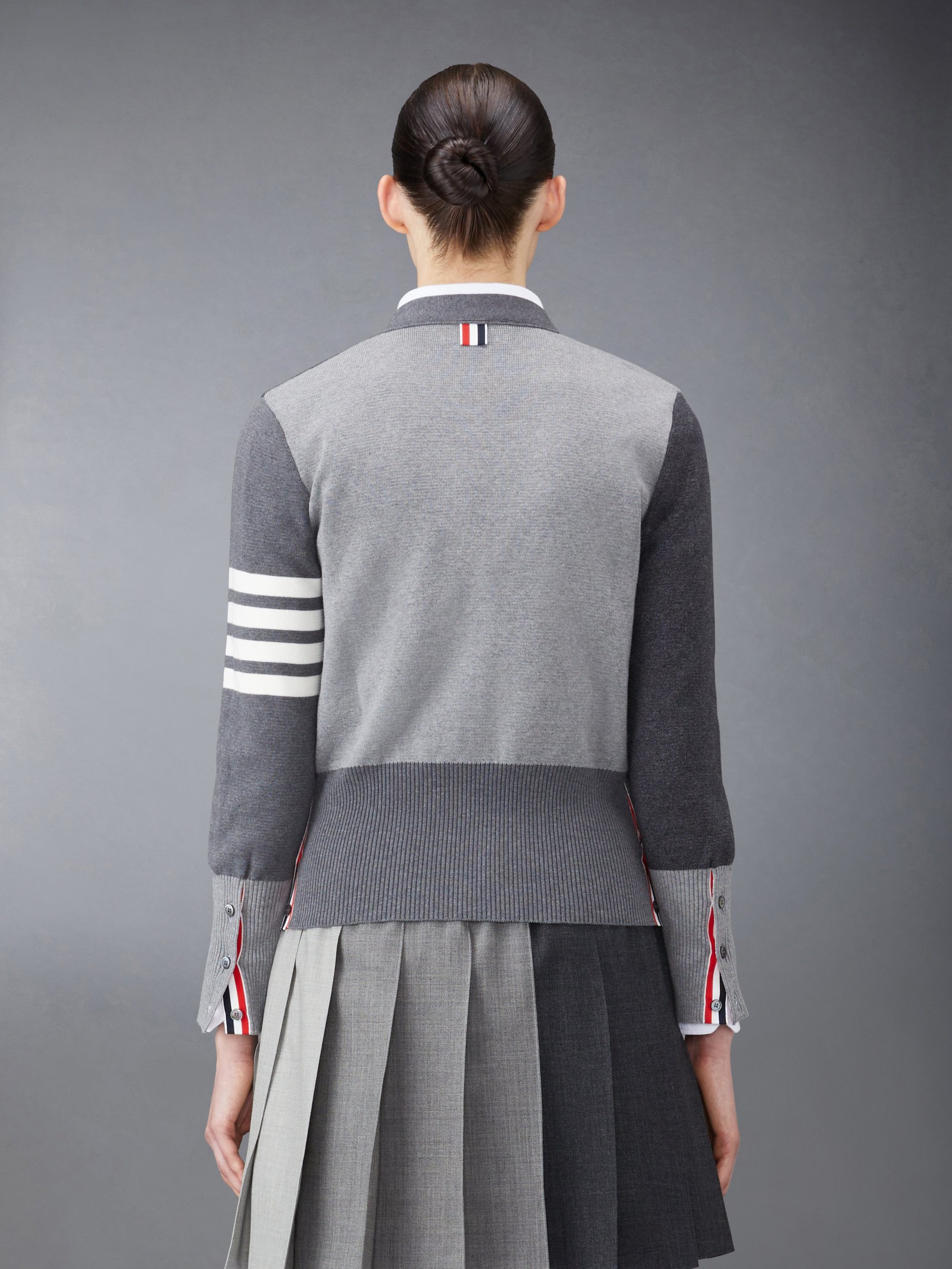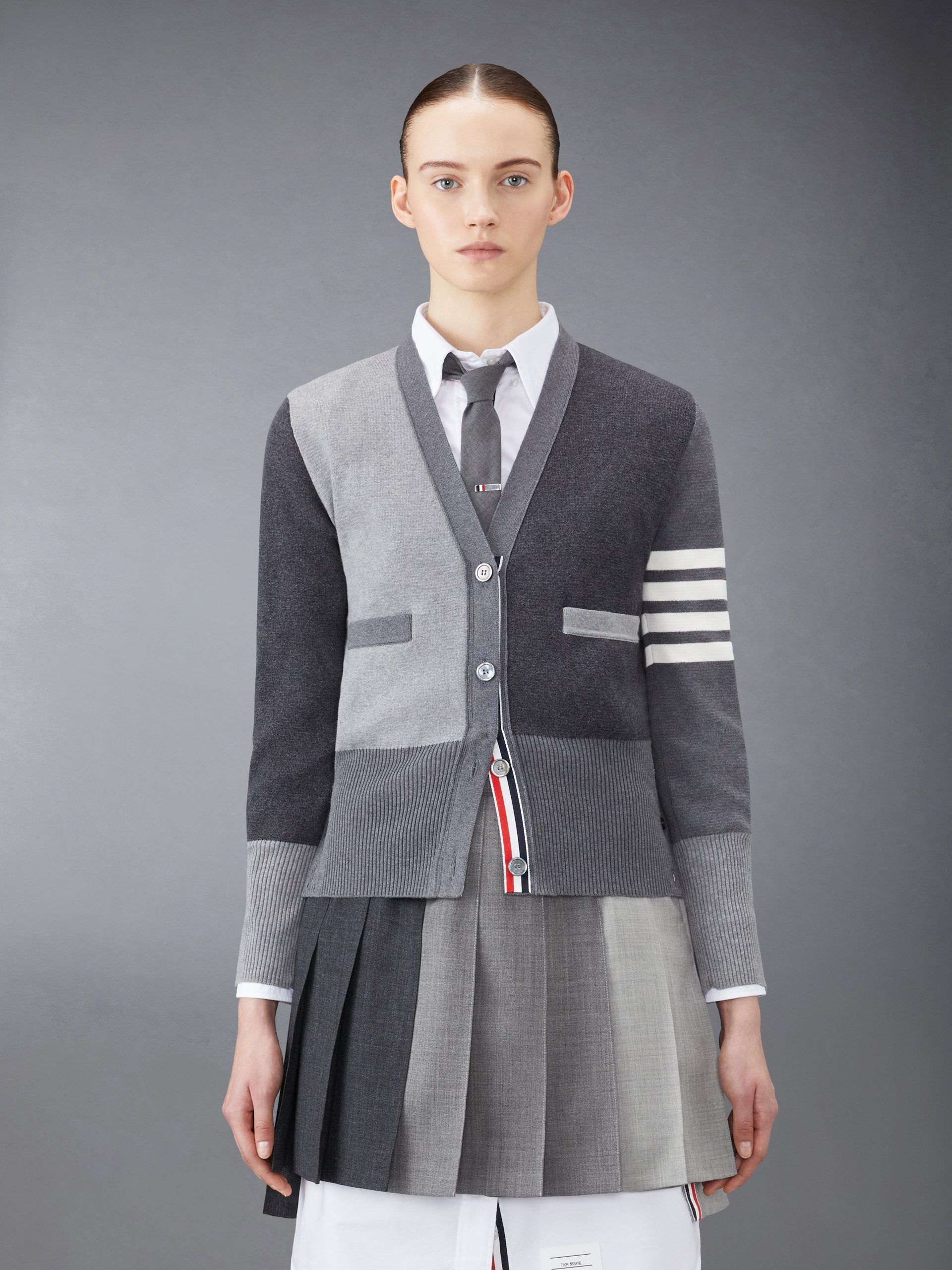 Our Fun-Mix Crepe 4-Bar Cardigan. Shades of fine cotton are woven together in patchwork form amidst two signature Thom Browne emblems ? 4-Bar stripes and grosgrain ribbon.