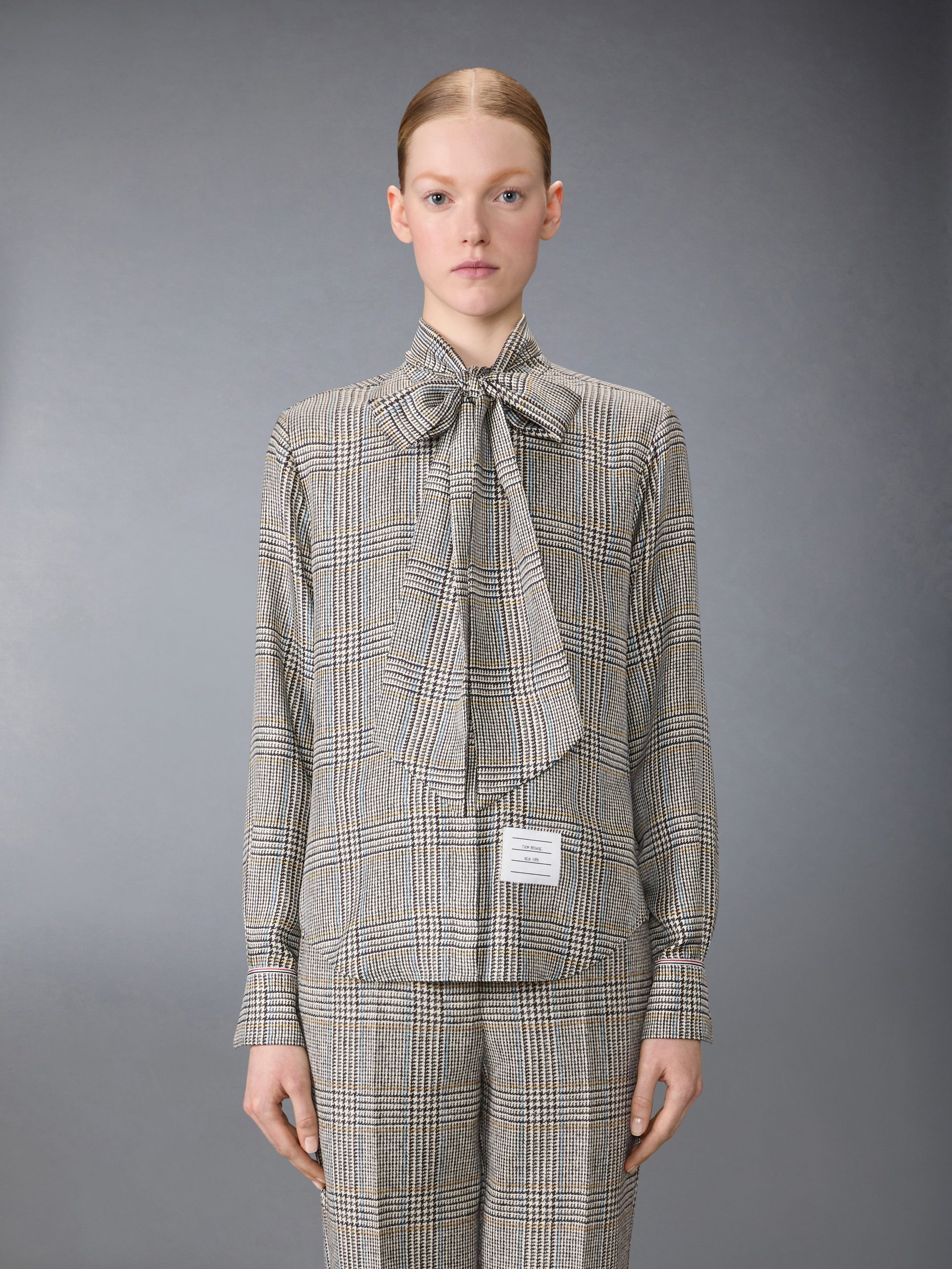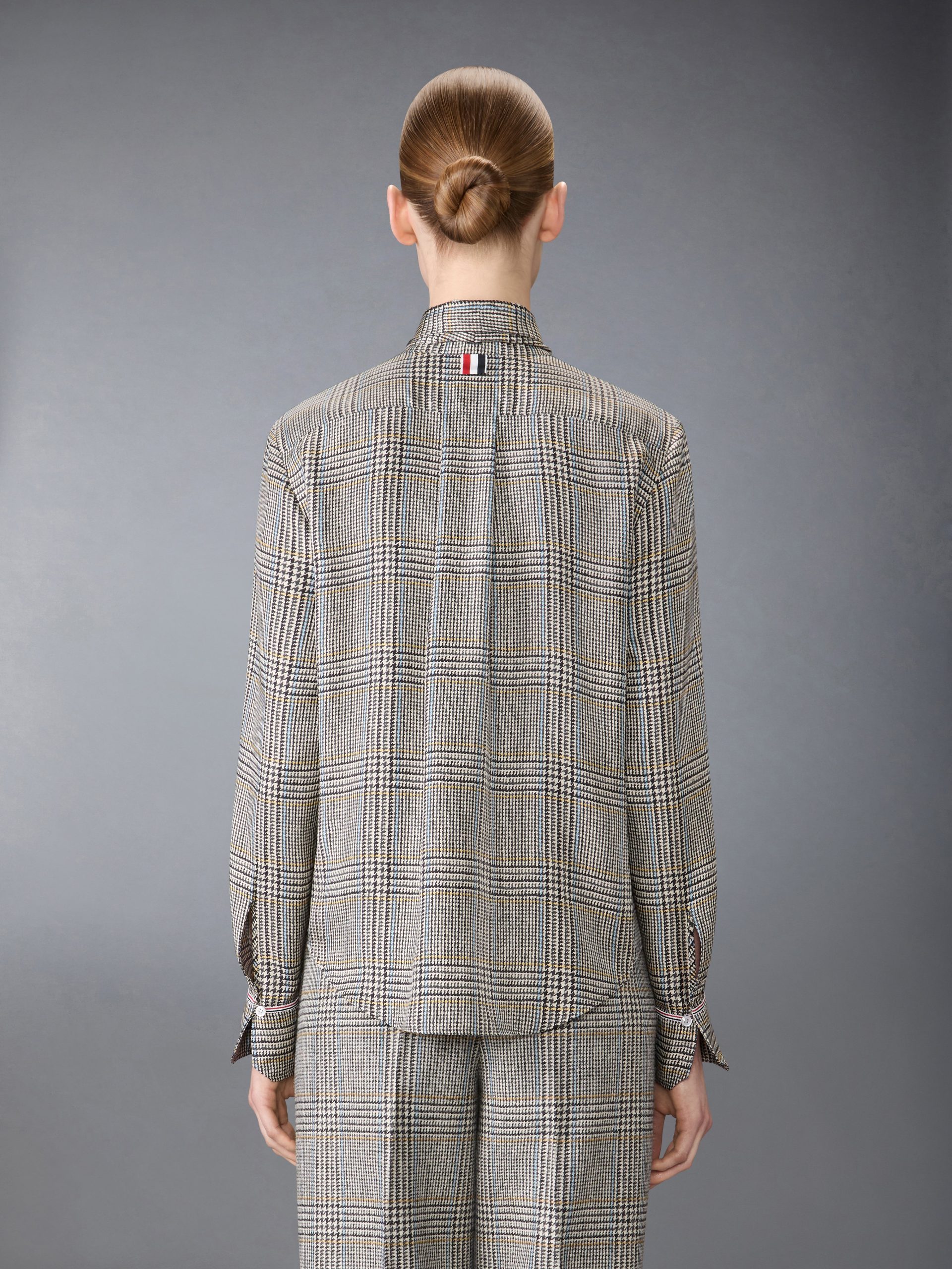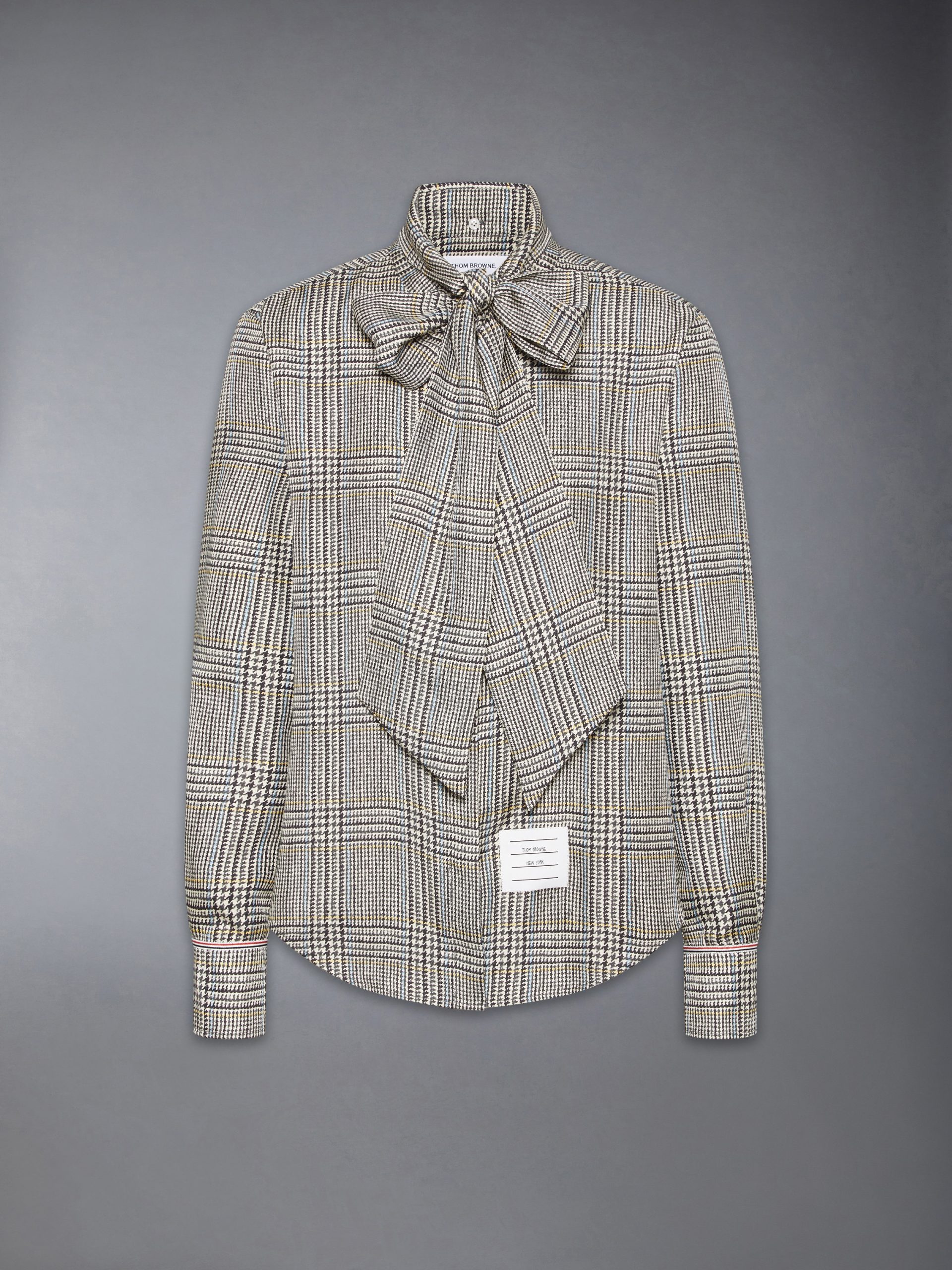 Crafted from heritage Hunting tweed—woven in Scotland using a century-old recipe—this piece carries the weight of tradition yet feels entirely modern. Lightweight silk drapes effortlessly. while ultra-subtle grosgrain trim at the cuffs and our signature name tag appliqué add a distinctive Thom Browne edge. A bow at the collar introduces a touch of elegance and old-world charm. Pair it with our Hunting Tweed Backstrap Trousers.