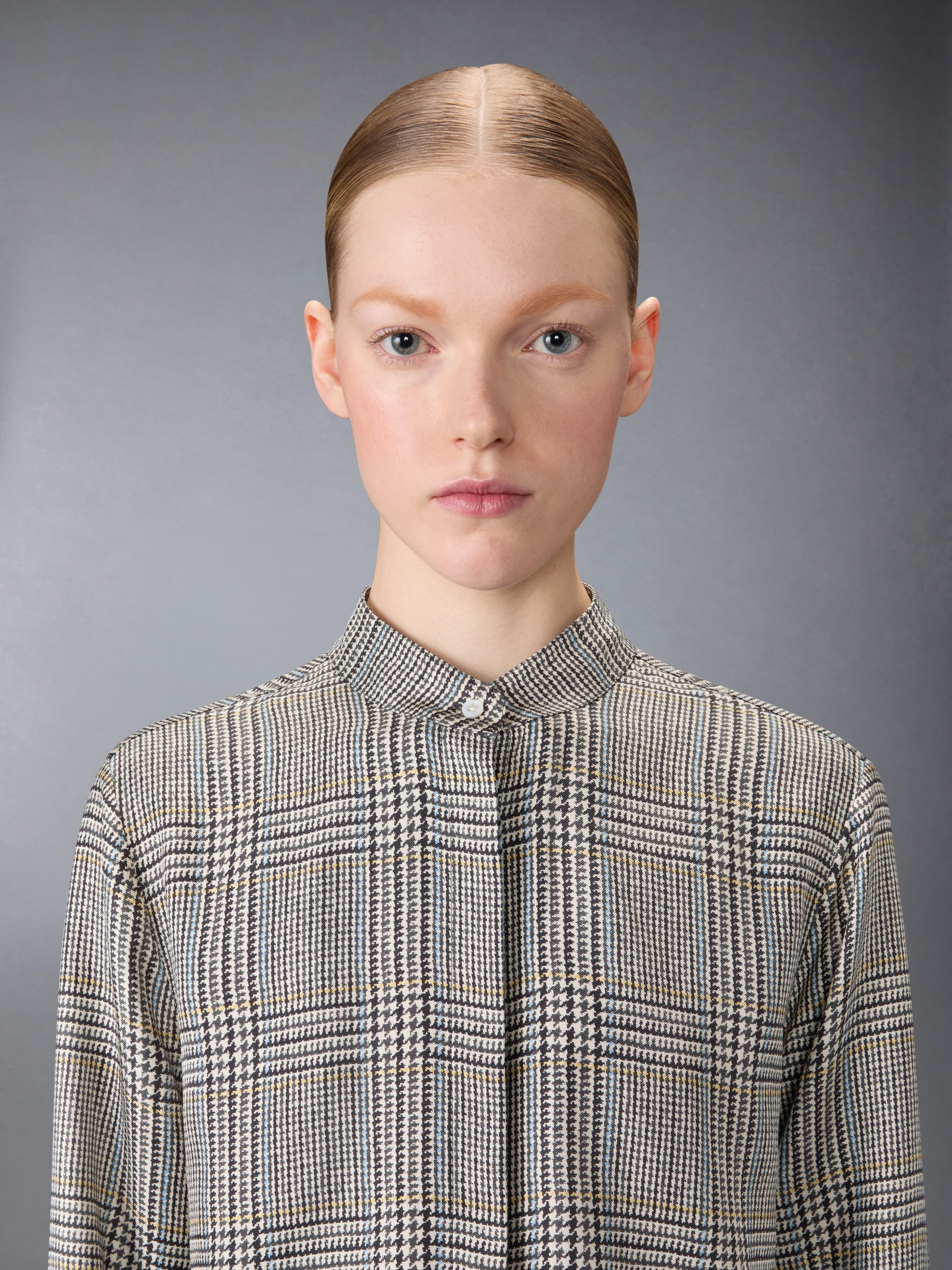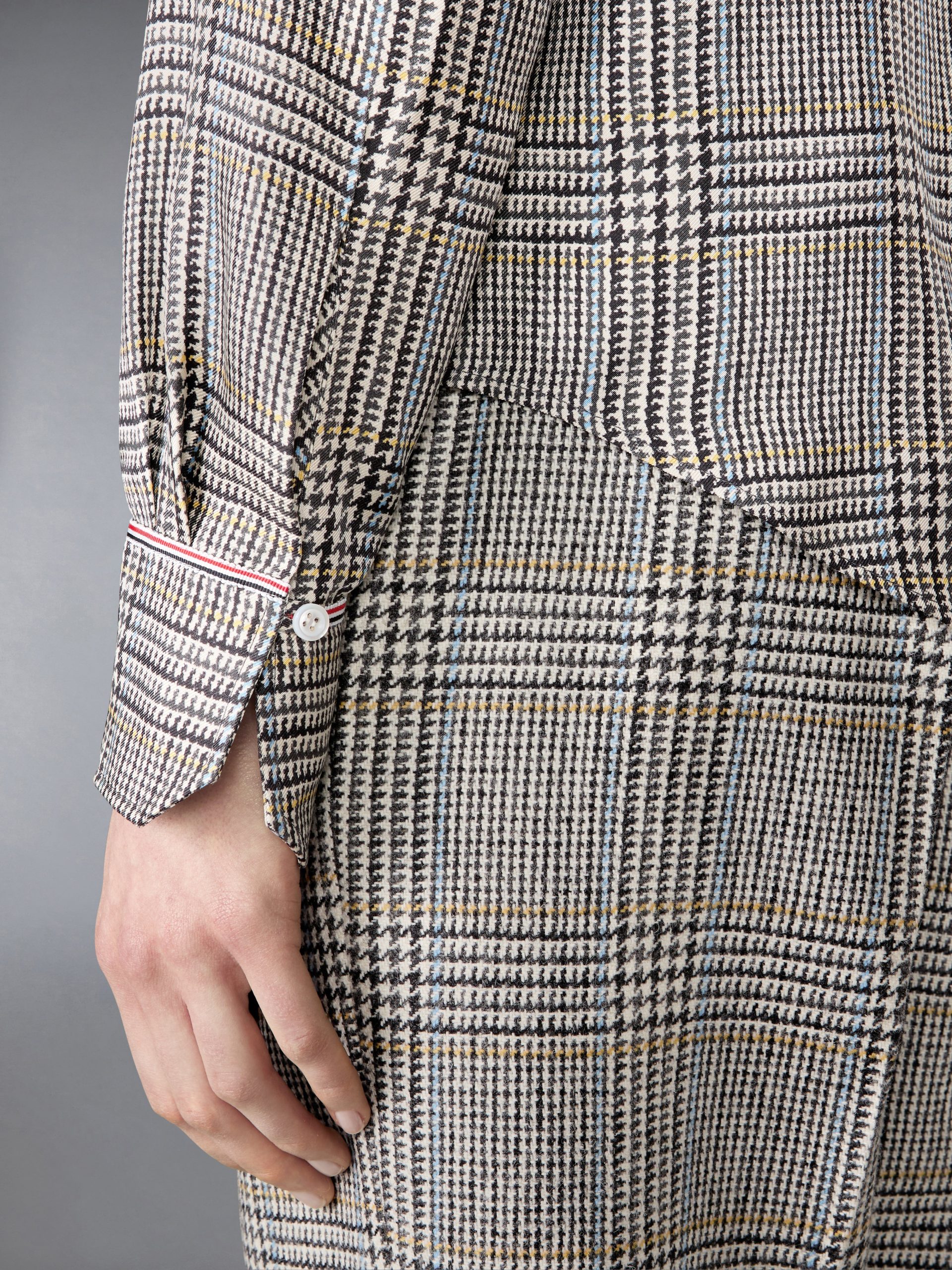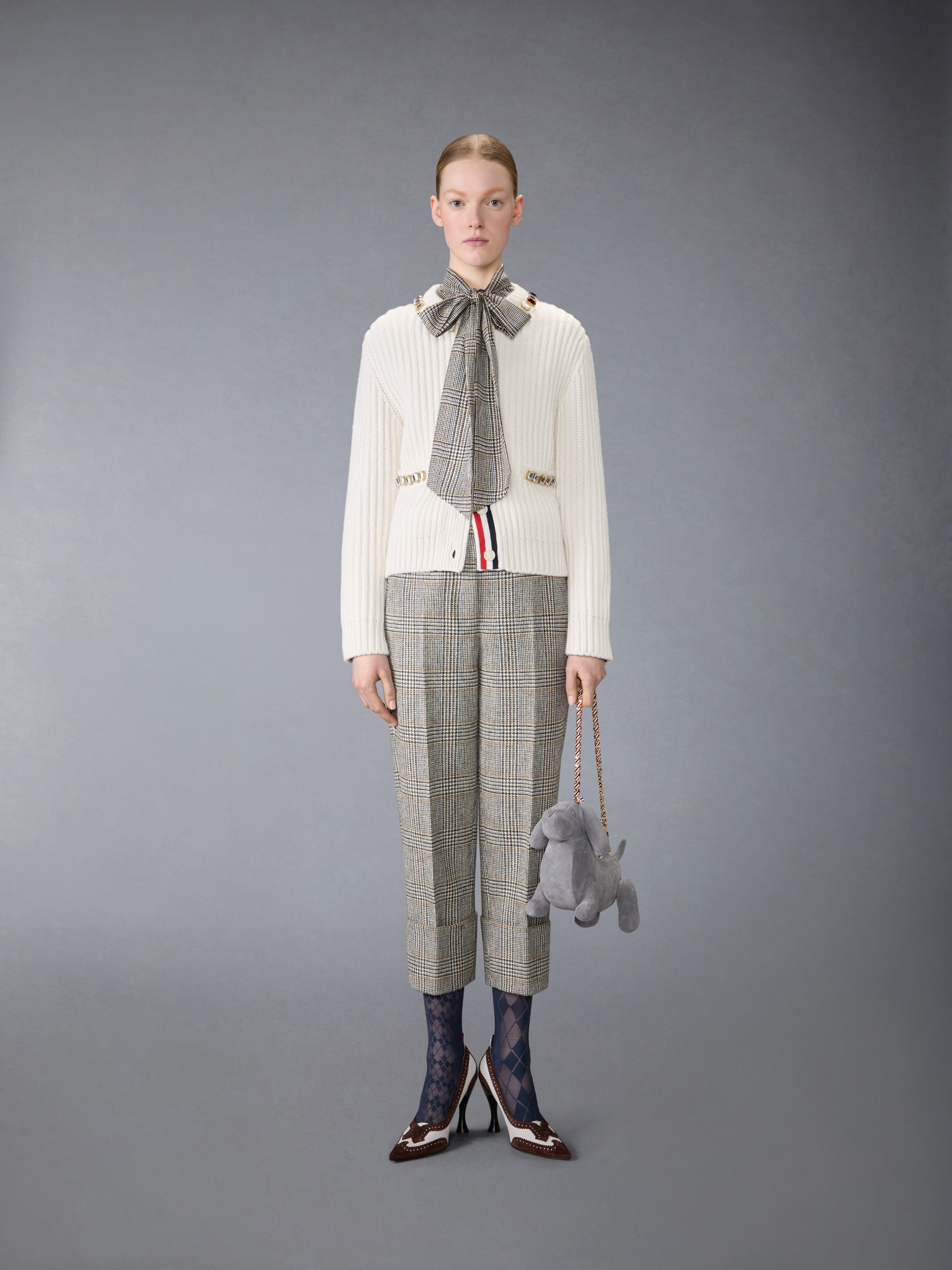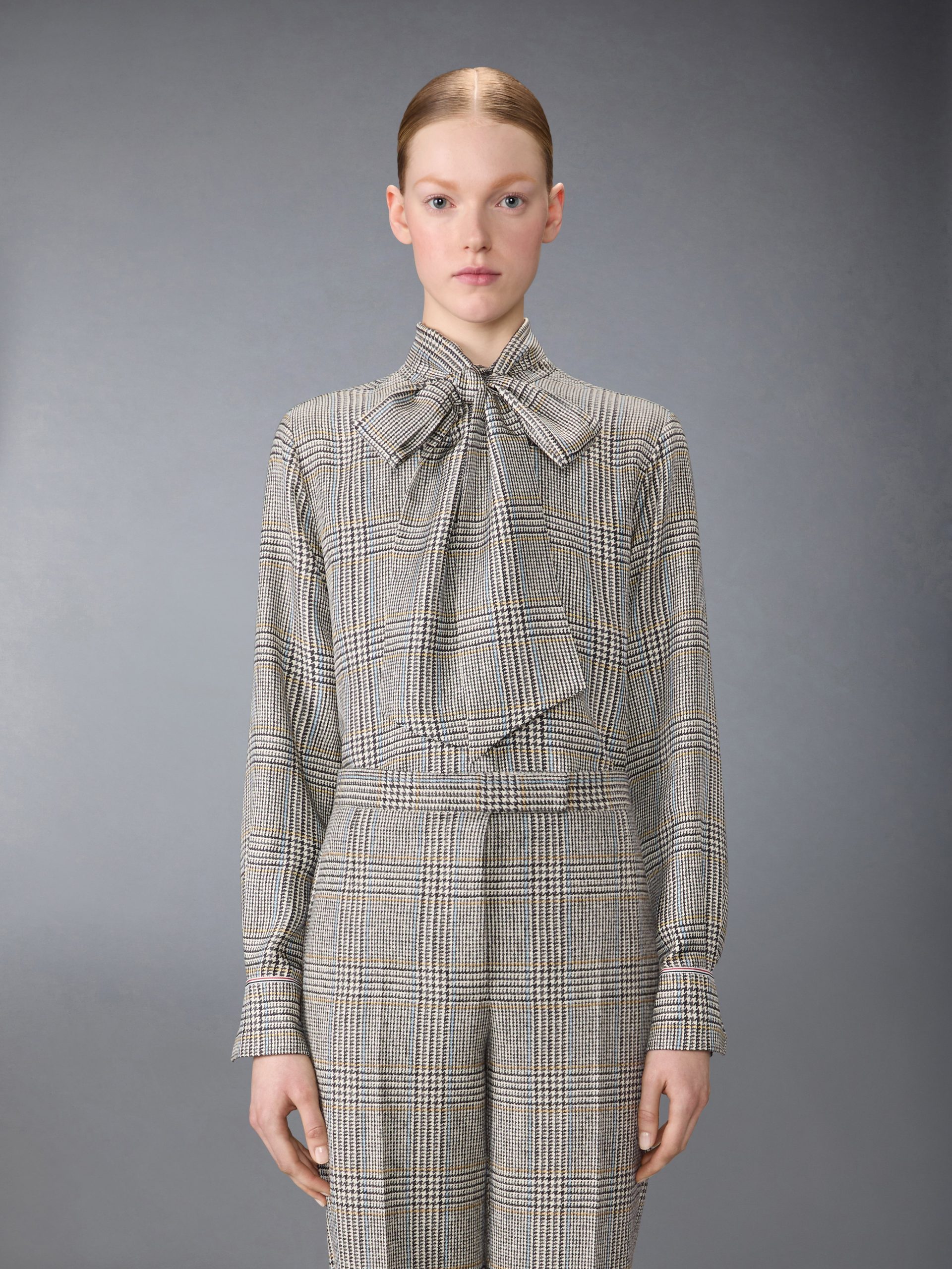 Crafted from heritage Hunting tweed—woven in Scotland using a century-old recipe—this piece carries the weight of tradition yet feels entirely modern. Lightweight silk drapes effortlessly. while ultra-subtle grosgrain trim at the cuffs and our signature name tag appliqué add a distinctive Thom Browne edge. A bow at the collar introduces a touch of elegance and old-world charm. Pair it with our Hunting Tweed Backstrap Trousers.