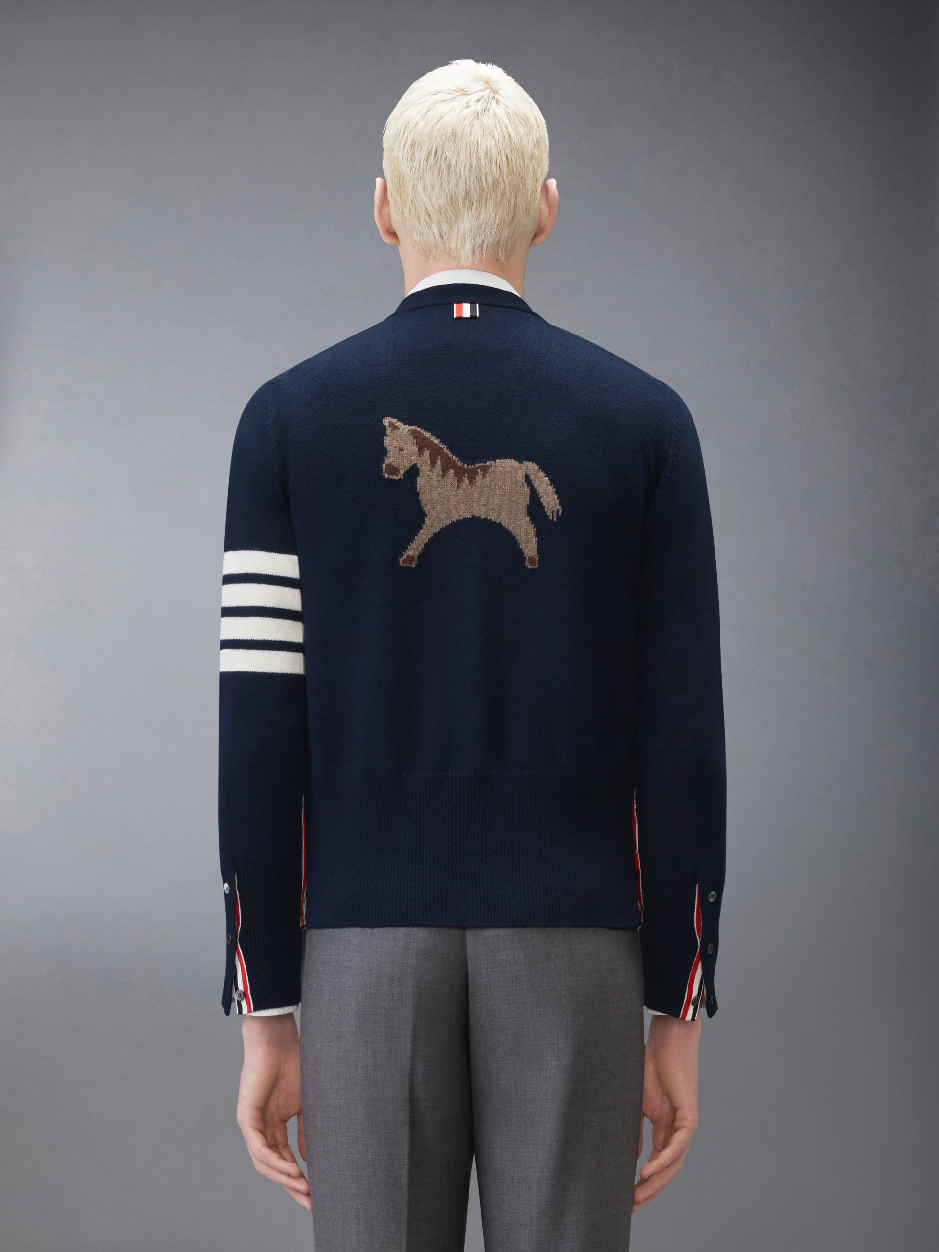 In celebration of the Year of the Horse. this refined cardigan is knit in soft wool and defined by a horse intarsia at the back. symbolizing discipline and forward motion. Engineered with precision and finished with signature details. it reflects the spirit of renewal through considered craftsmanship.