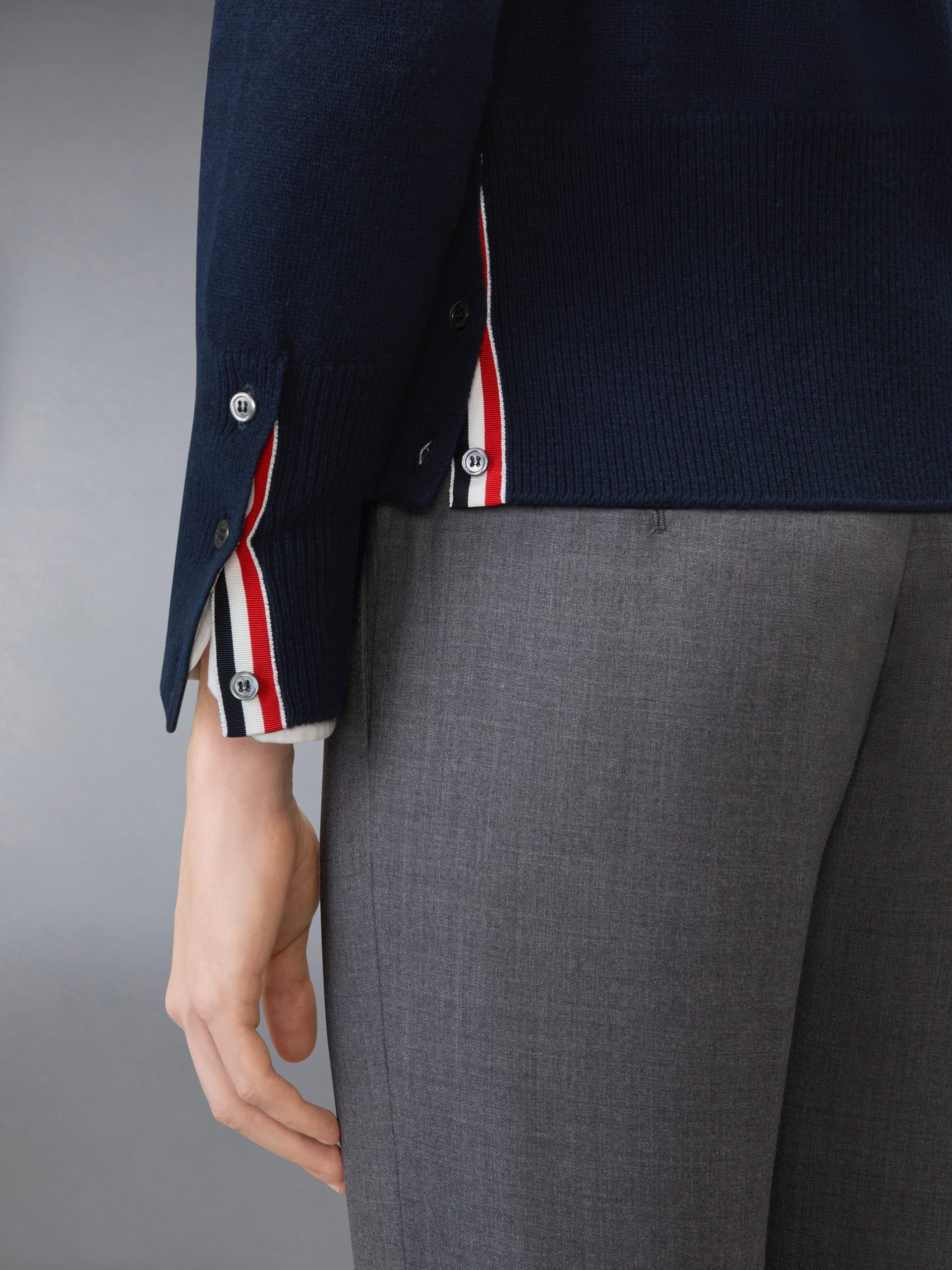 Ribbed buttoned cuffs with RWB grosgrain trim