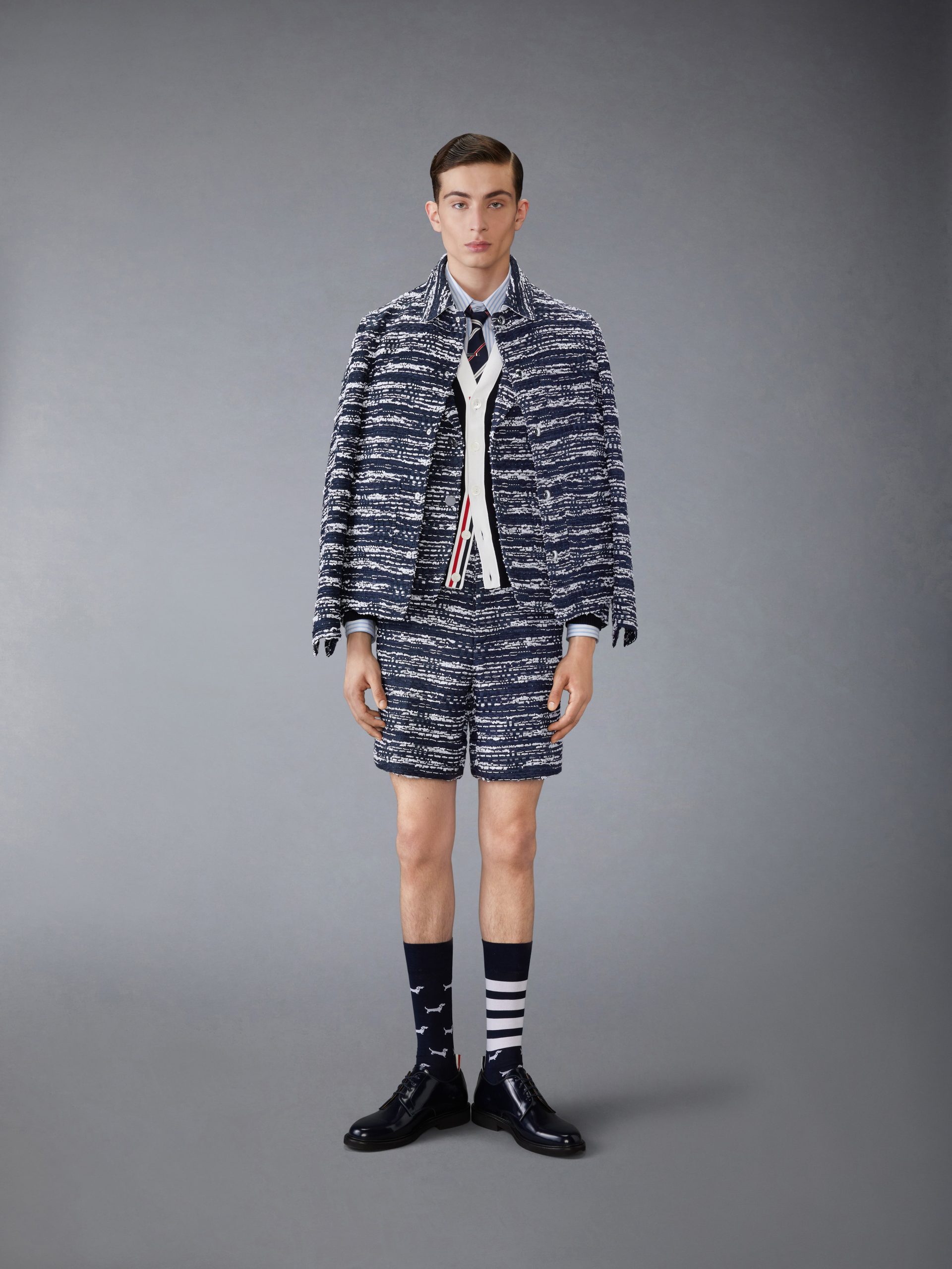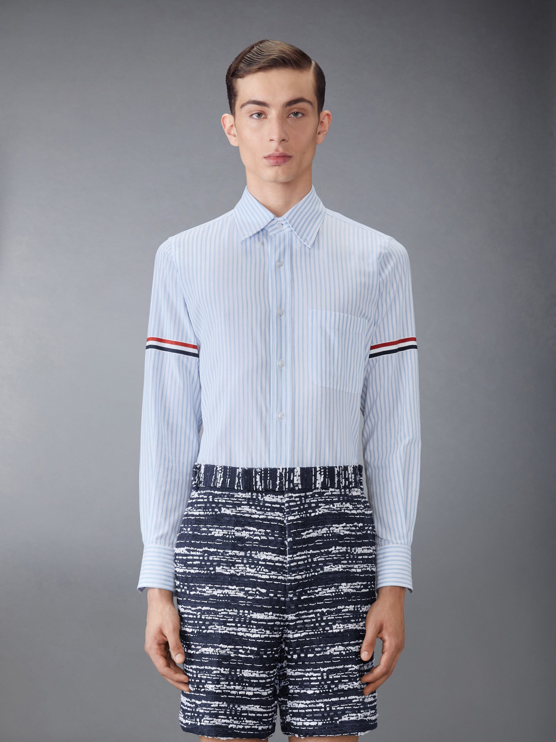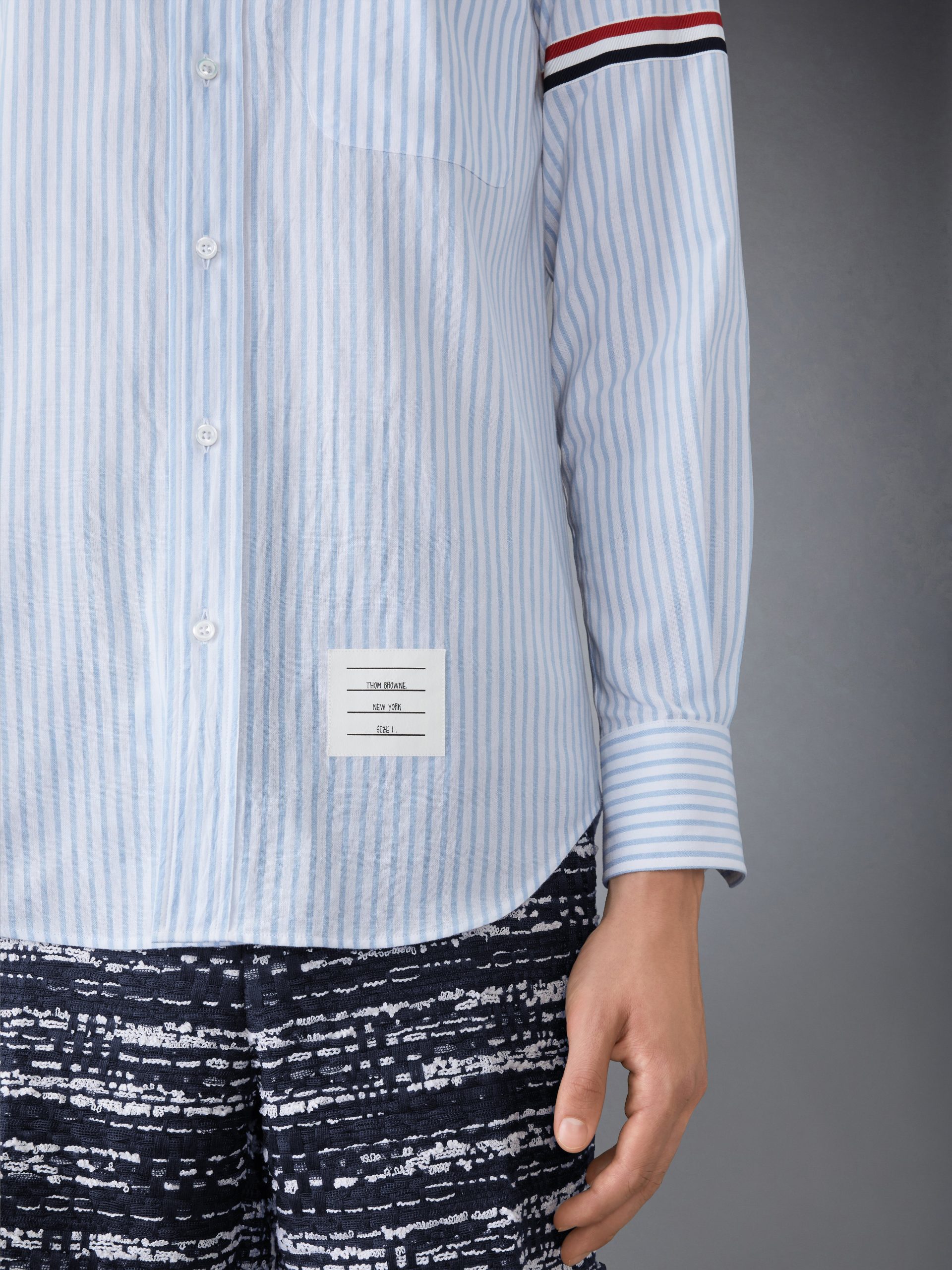 An elevated shirt enriched with signature Thom Browne emblems.