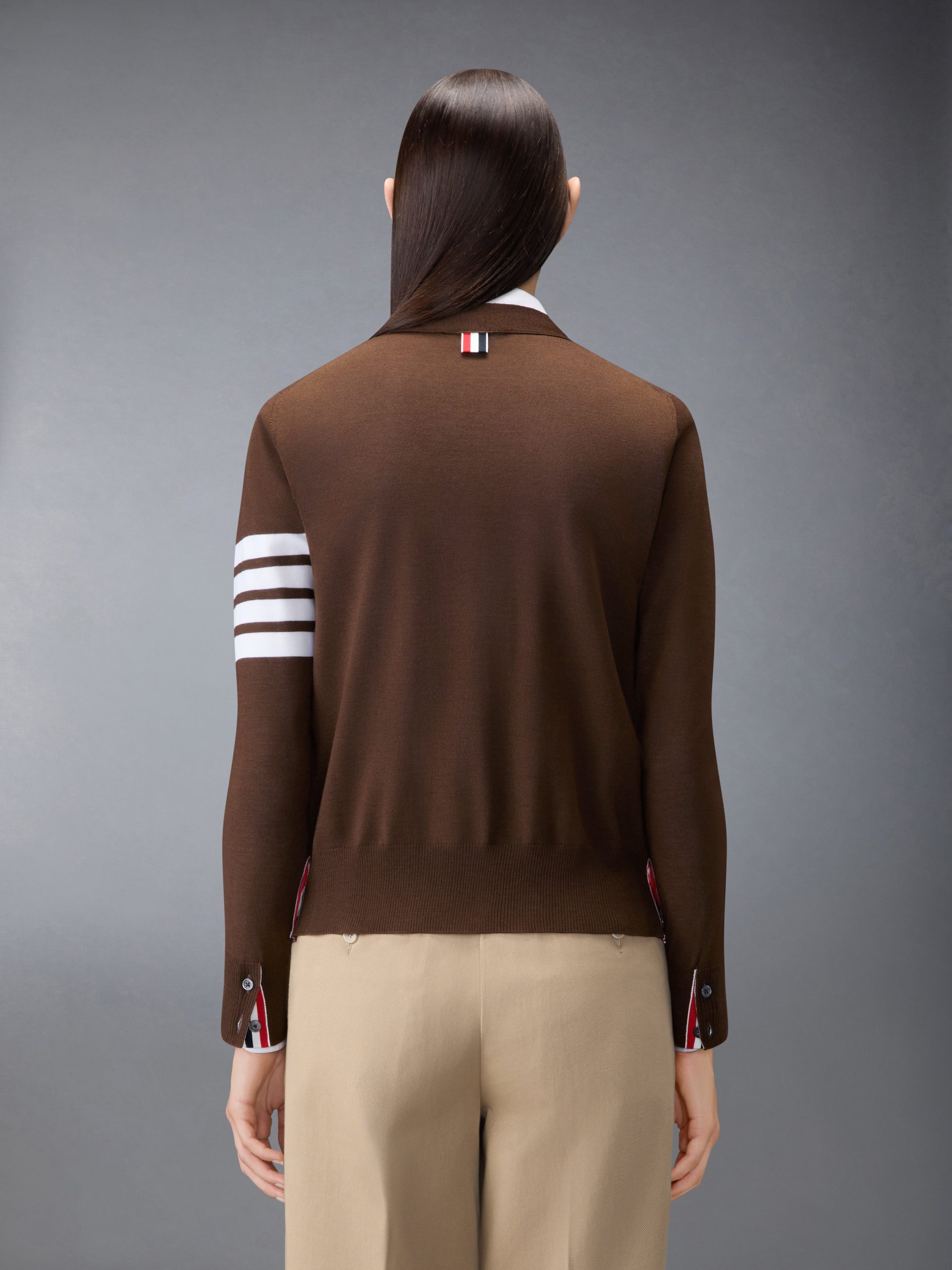 Two Thom Browne emblems define our Wool 4-Bar V-neck Cardigangrosgrain trim and 4-Bar stripe detailing. both synonymous with the brand. Presented in fine virgin merino wool fabric. this roomy cardigan exudes sophistication.