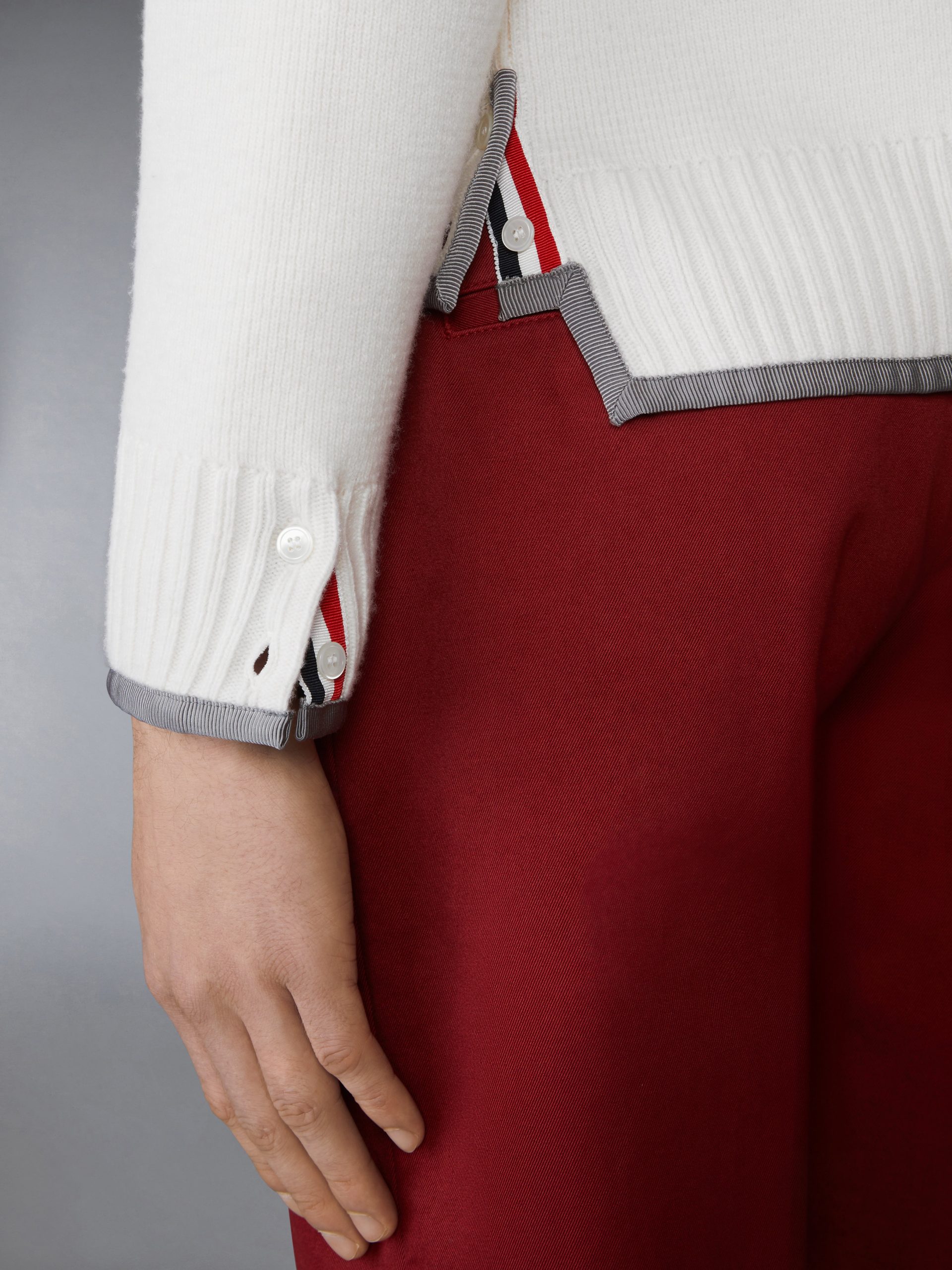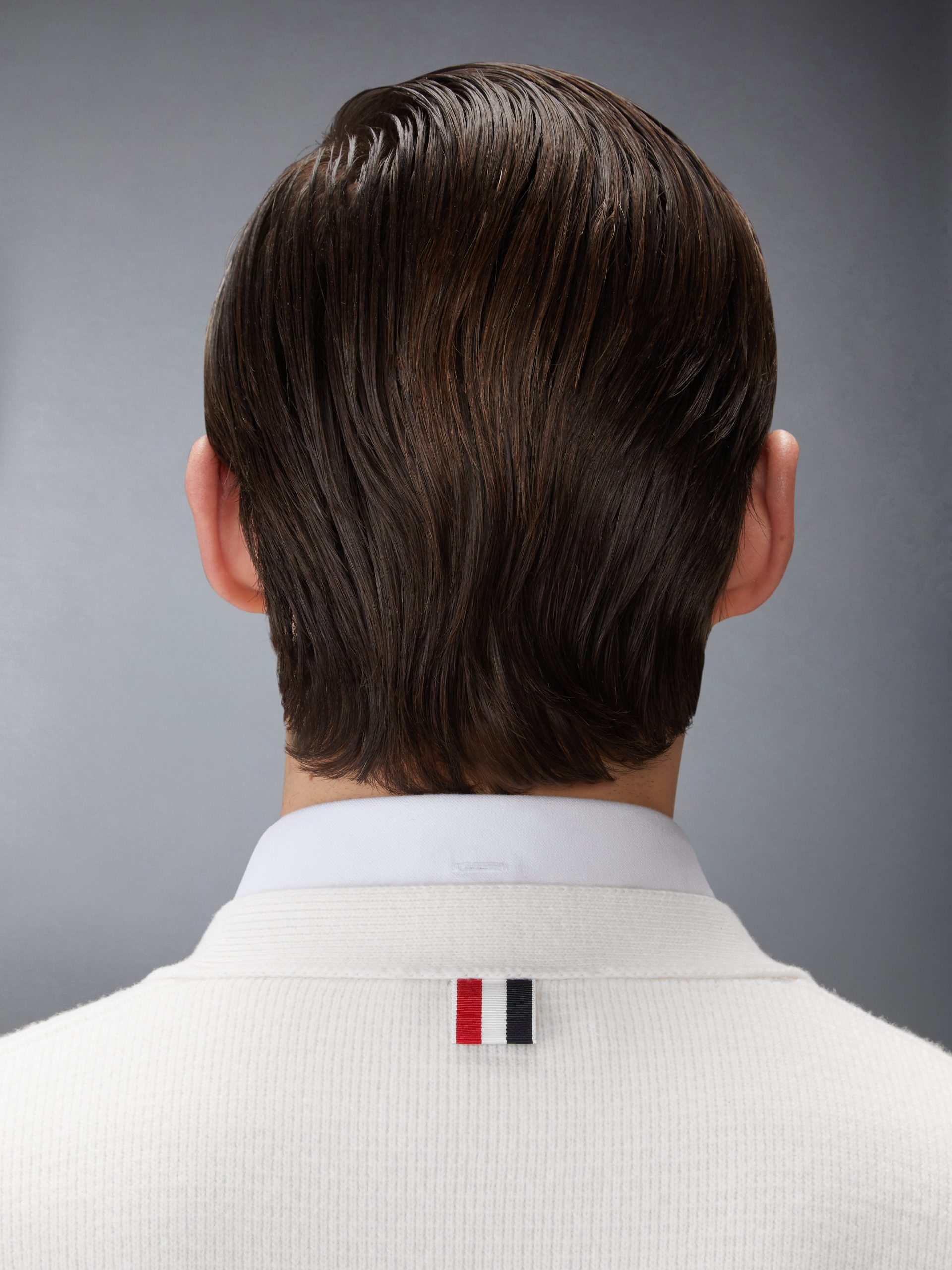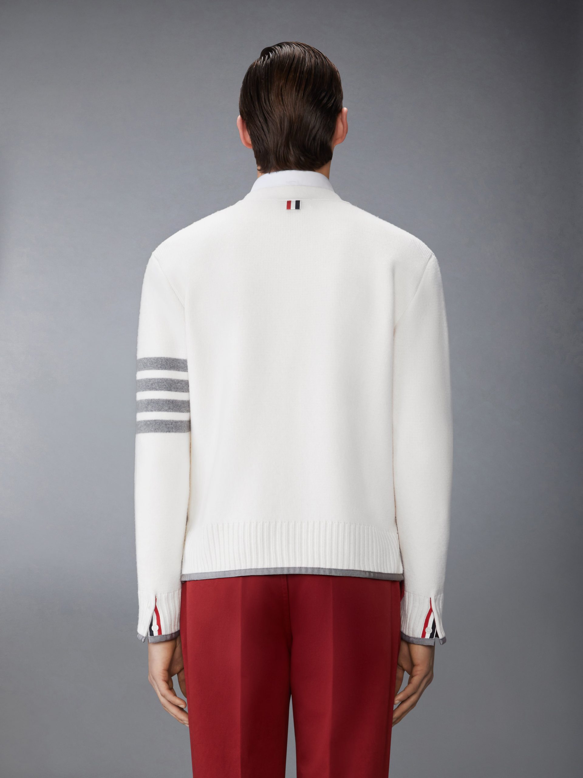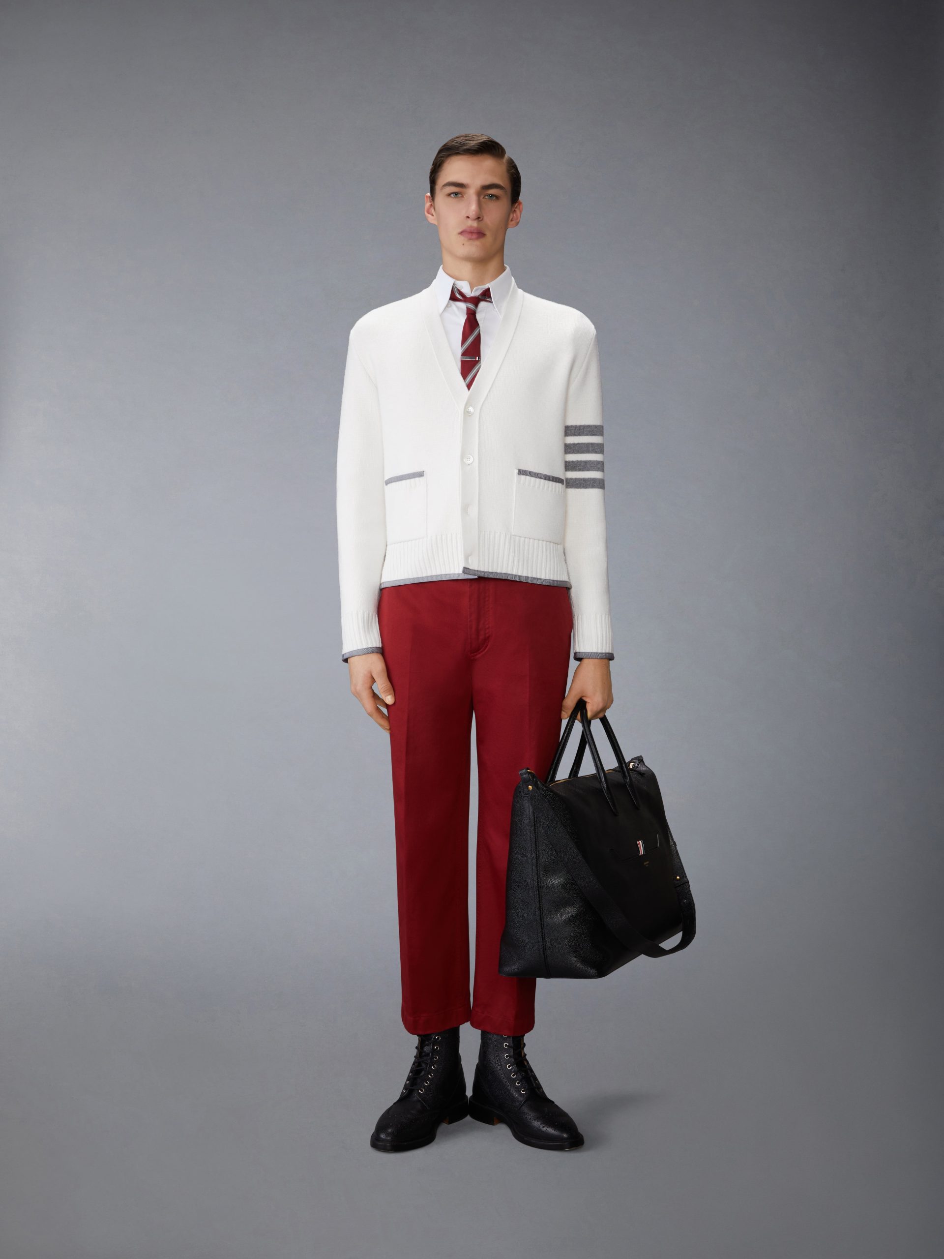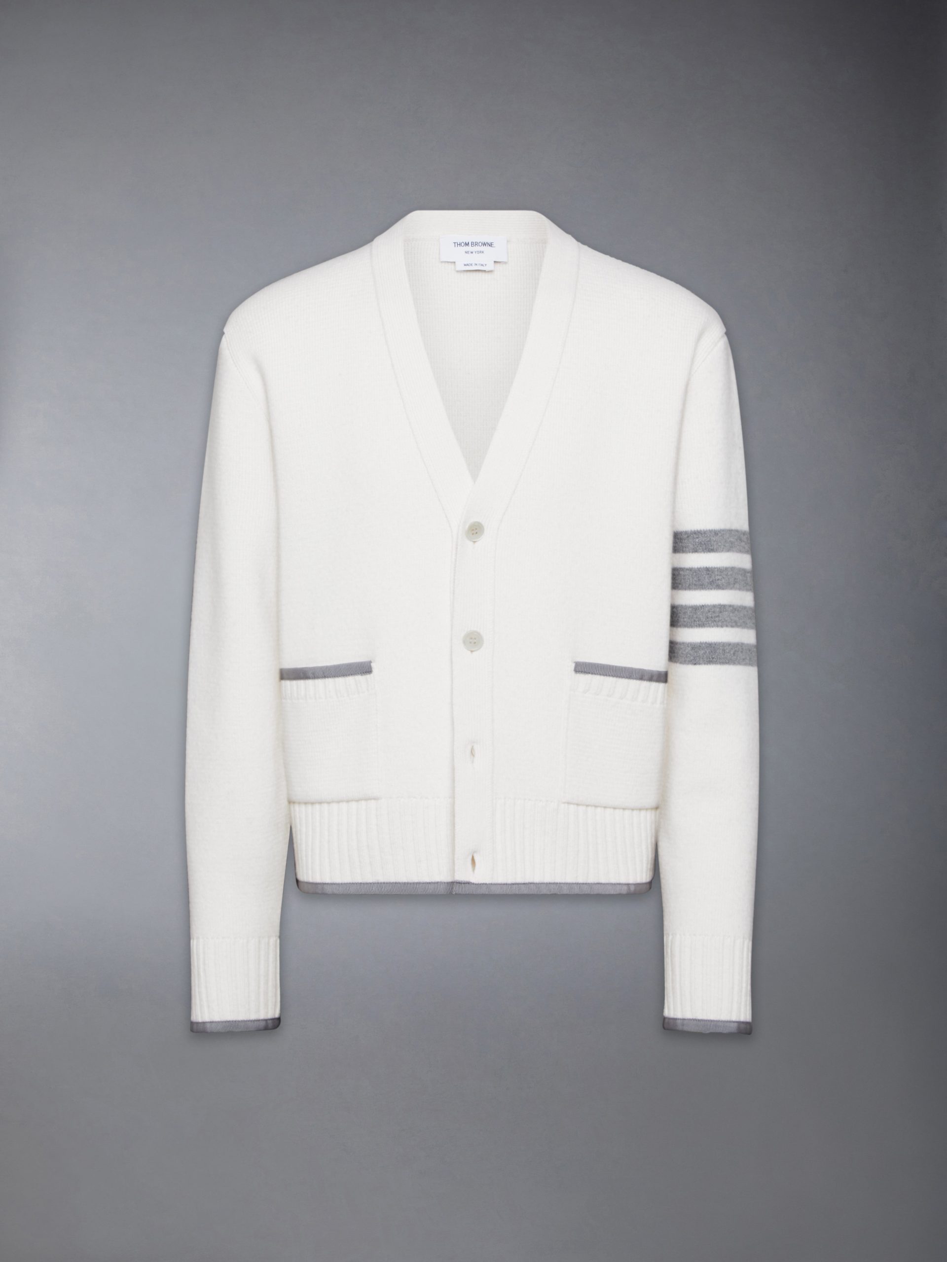 This luxuriously soft cardigan is thoughtfully crafted from fine merino wool. It features signature striped grosgrain trim at the cuffs and side vents. and our beloved 4-bar detailing. Equipped with convenient pockets for carrying your essentials.