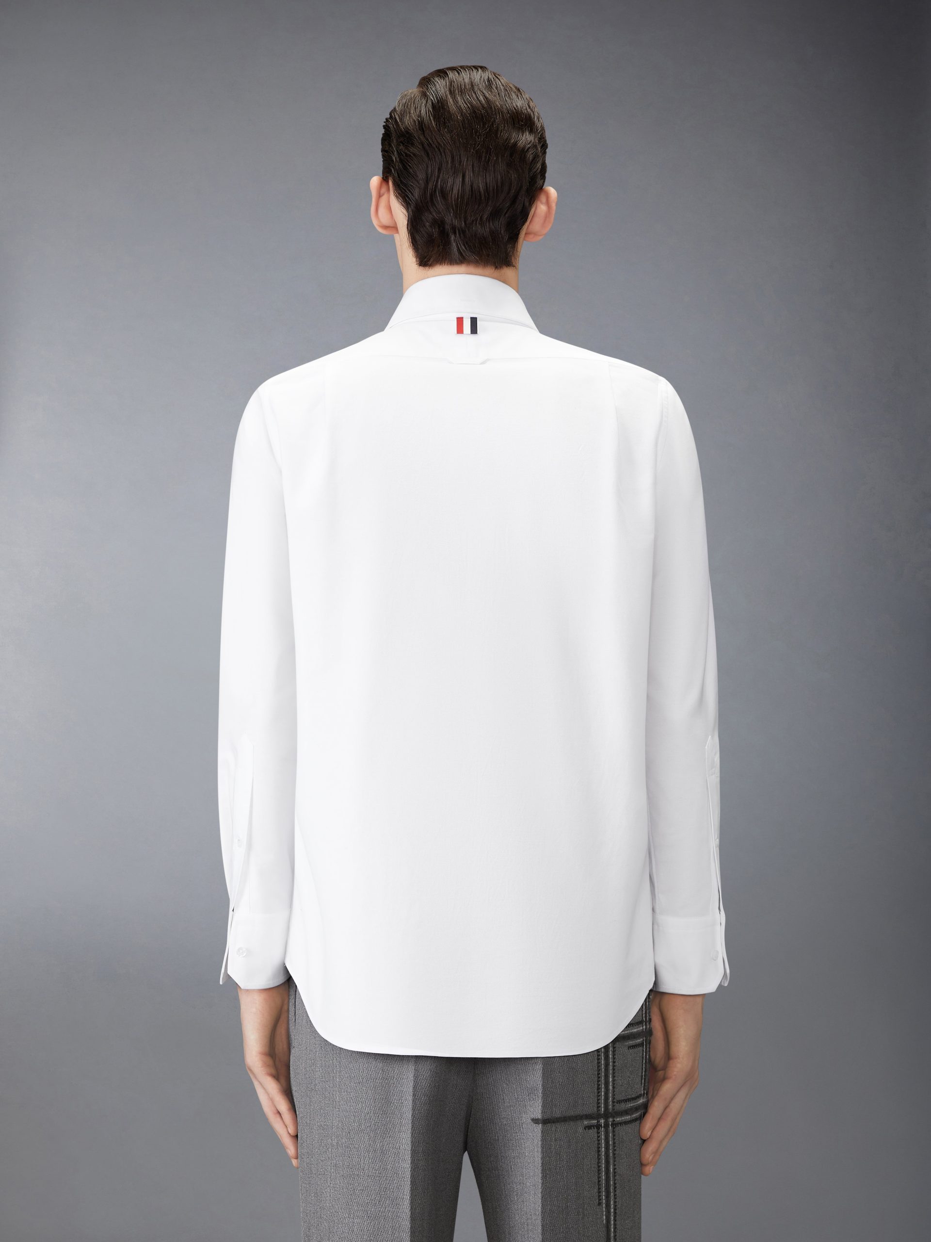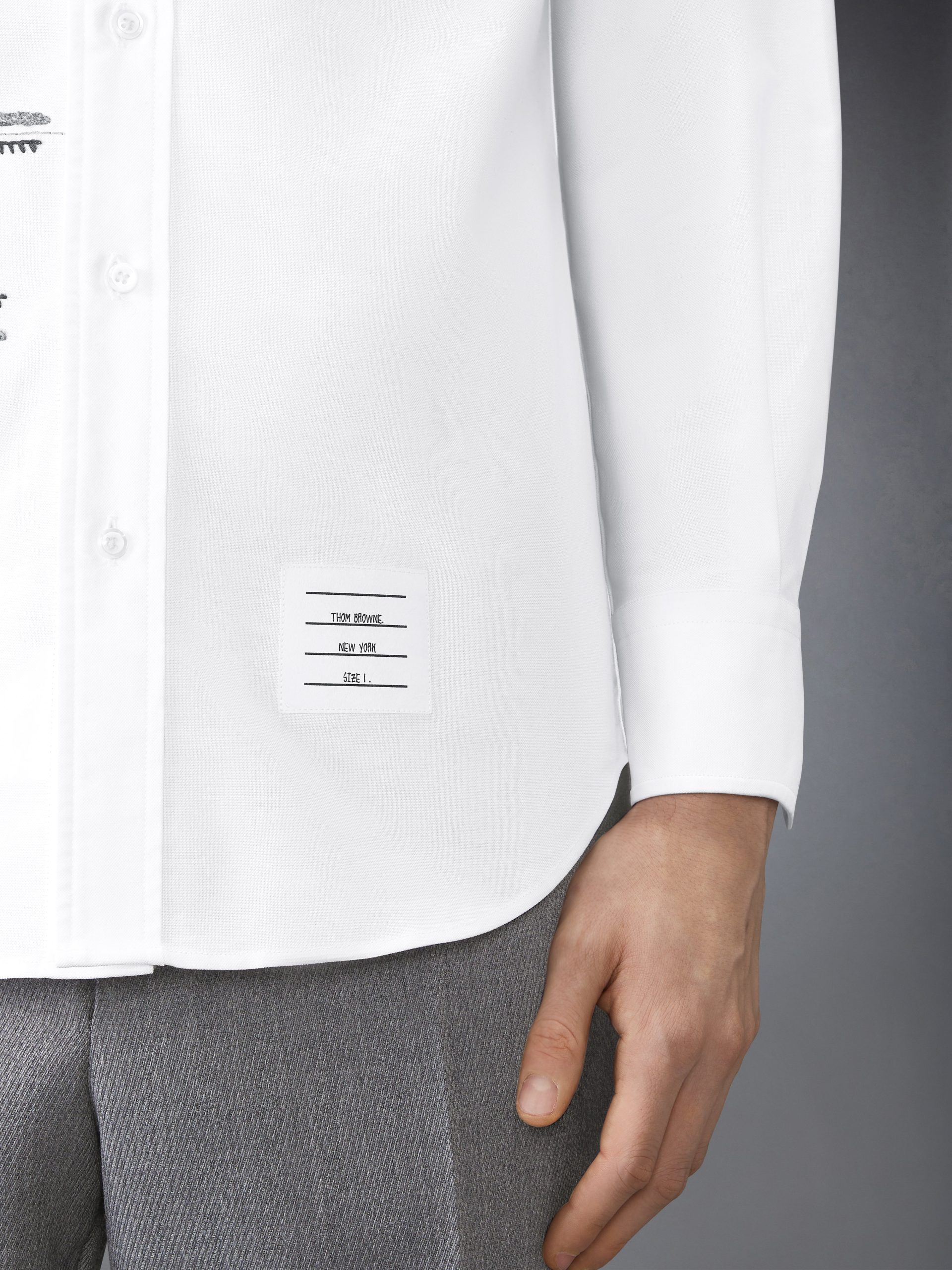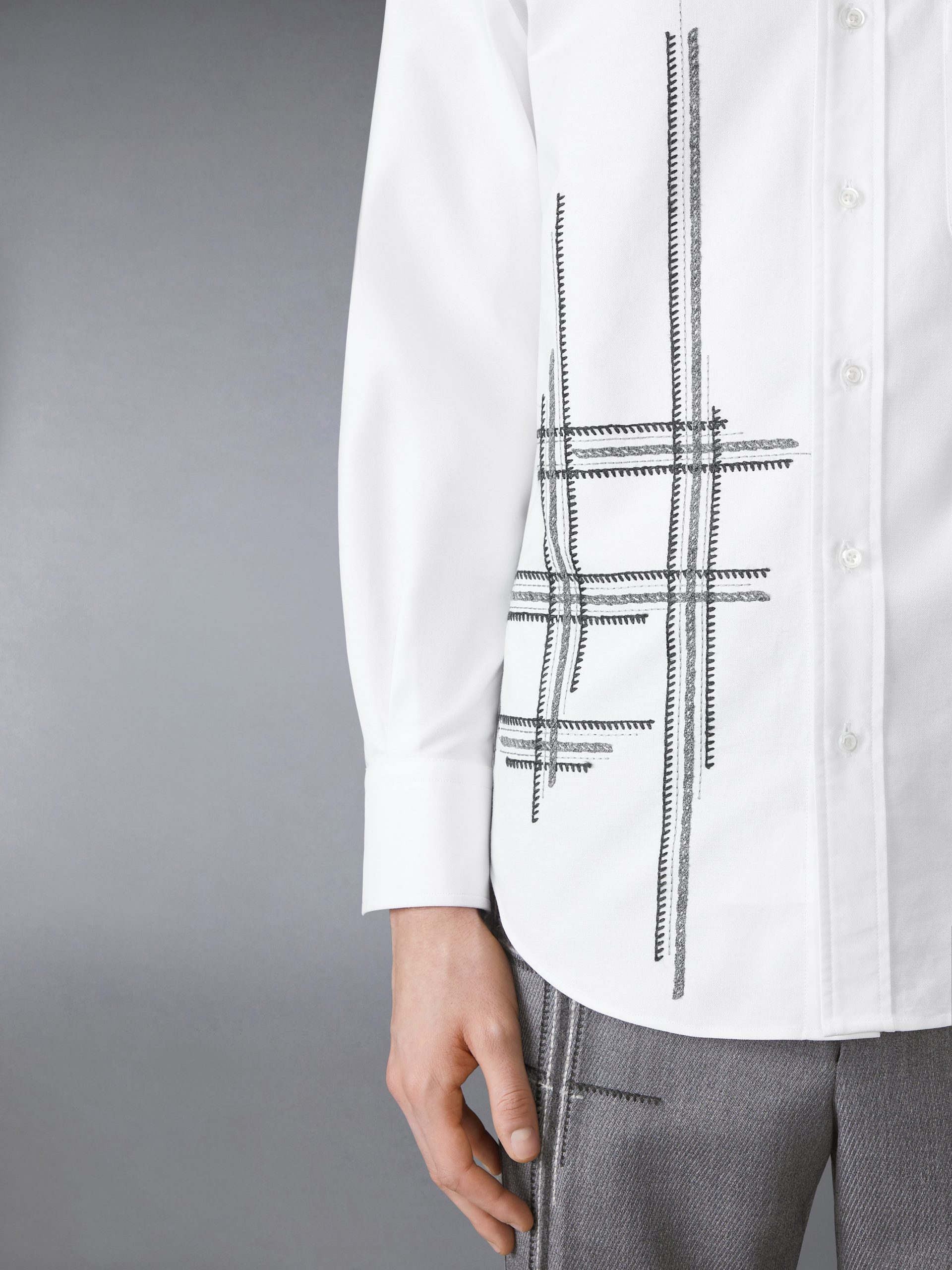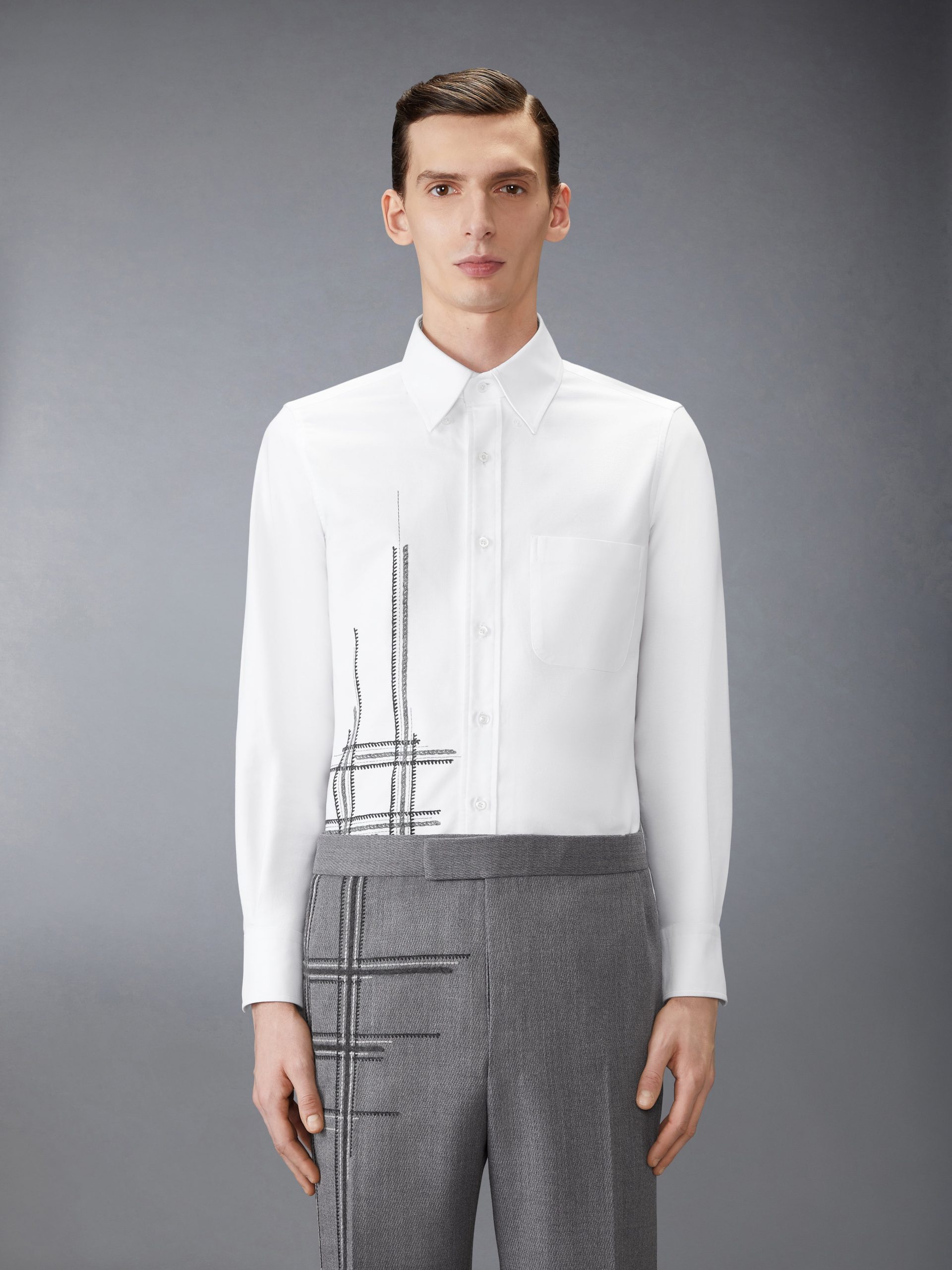 In every stitch lies a story. Blanket and chain stitching form incomplete boxes—evoking cages and the act of breaking free. A metaphor for shedding constraints and stepping into individuality. this shirt is as symbolic as it is luxurious. crafted with meticulous Thom Browne tailoring and breathable Oxford fabric. Pair it with our Low Rise Wool School Uniform Trousers.
