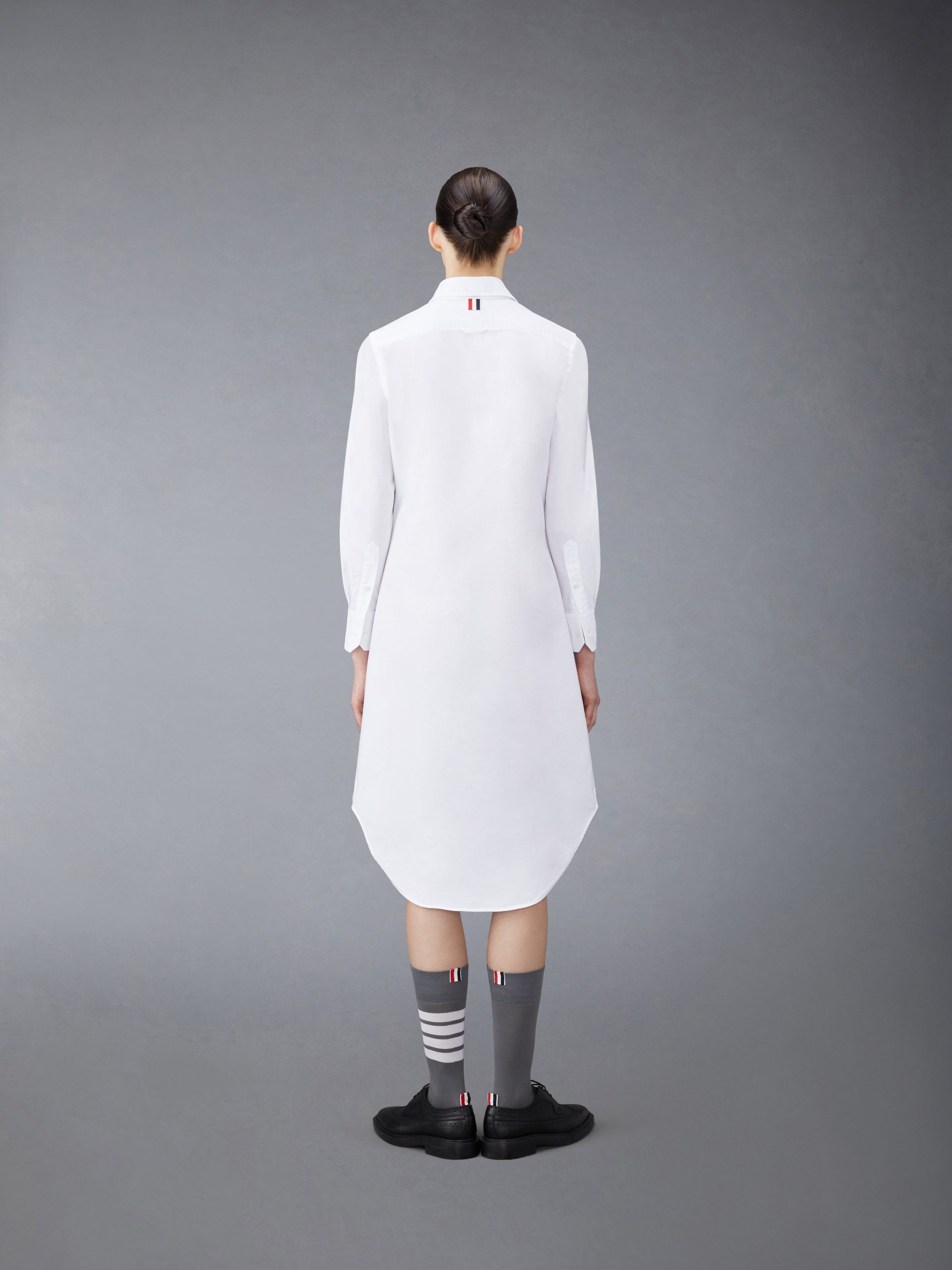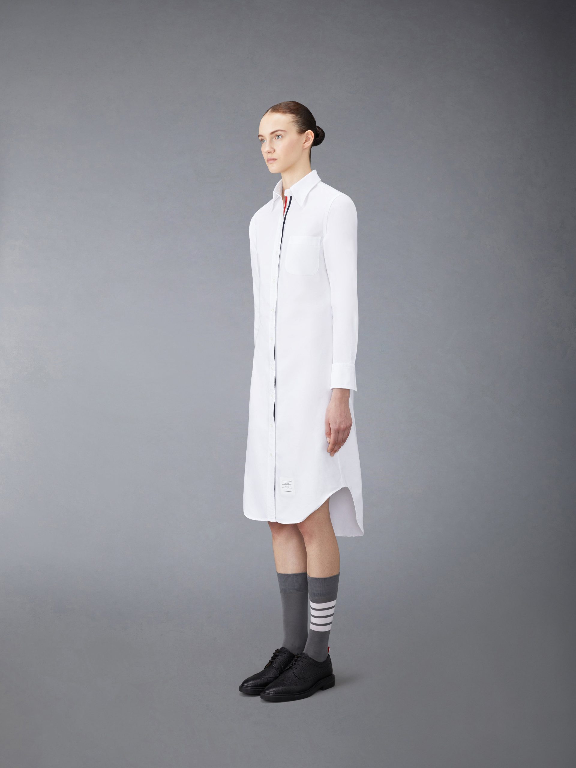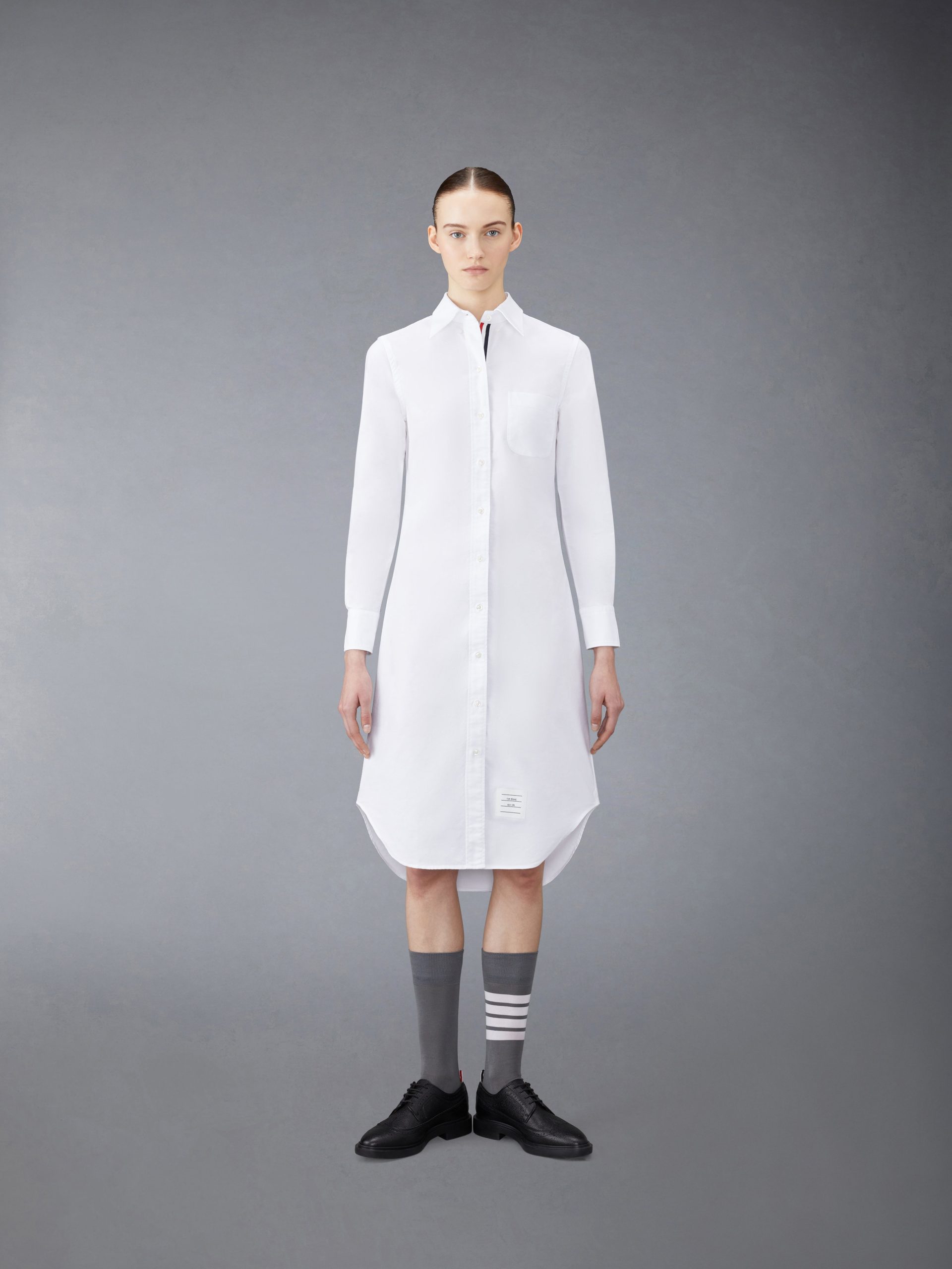 Our Oxford Grosgrain Placket Knee length Point Collar Shirtdress. Crafted from the finest fabric. wear this silhouette alone as an everyday staple or as a base layer for suiting.