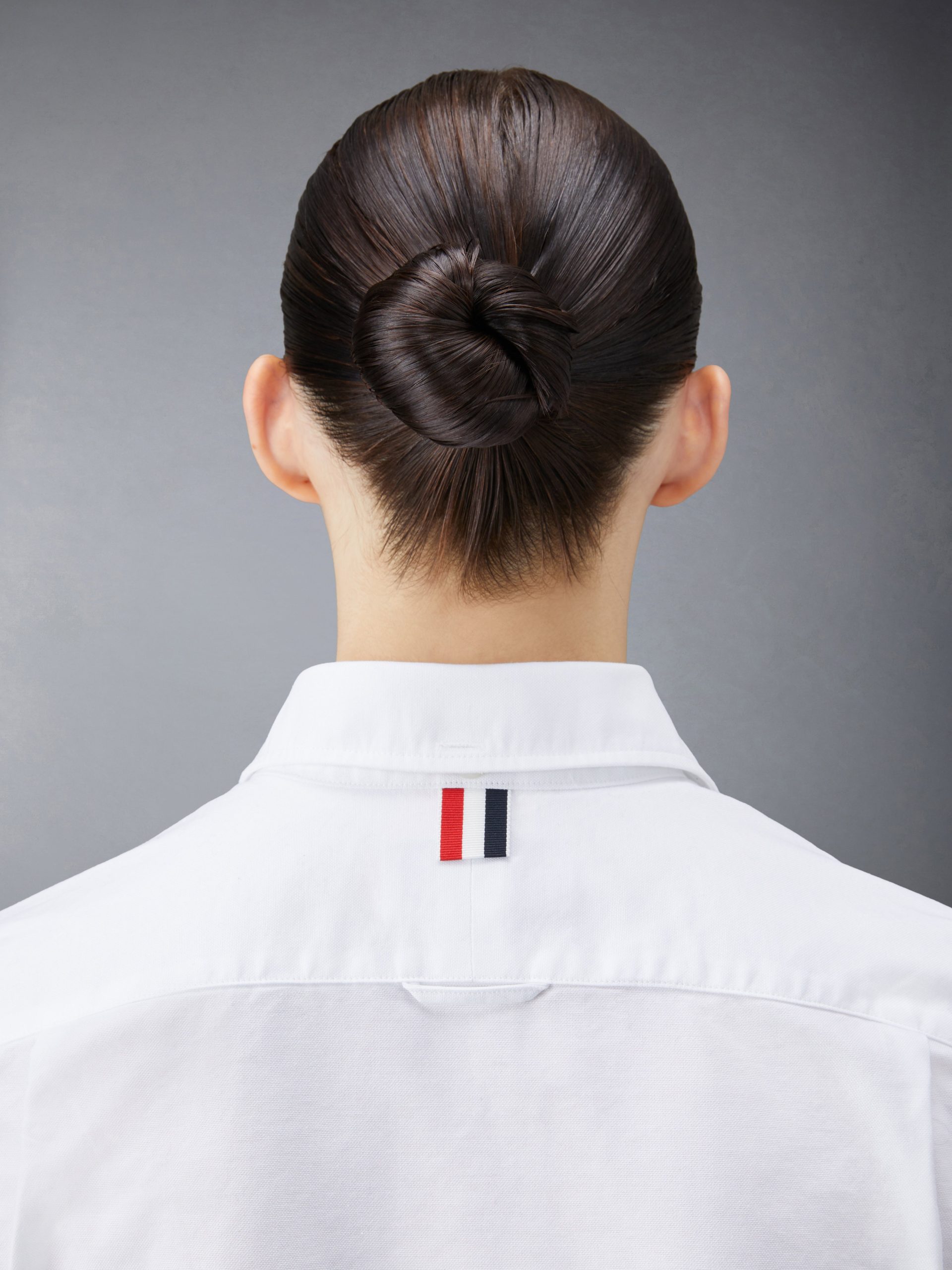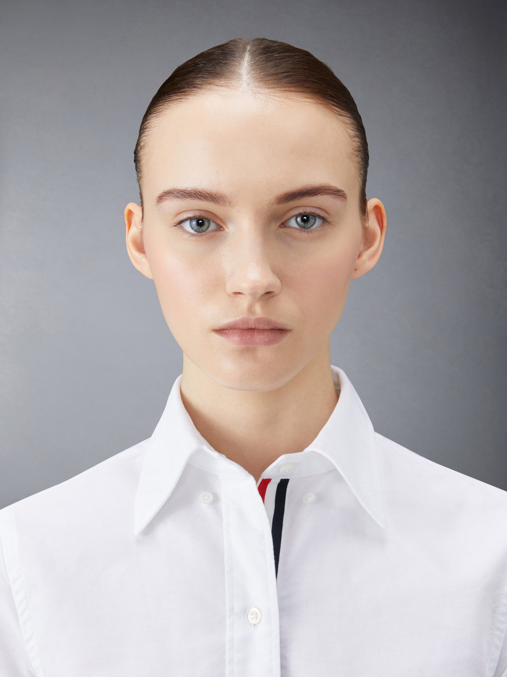Front button closure with striped grosgrain placket