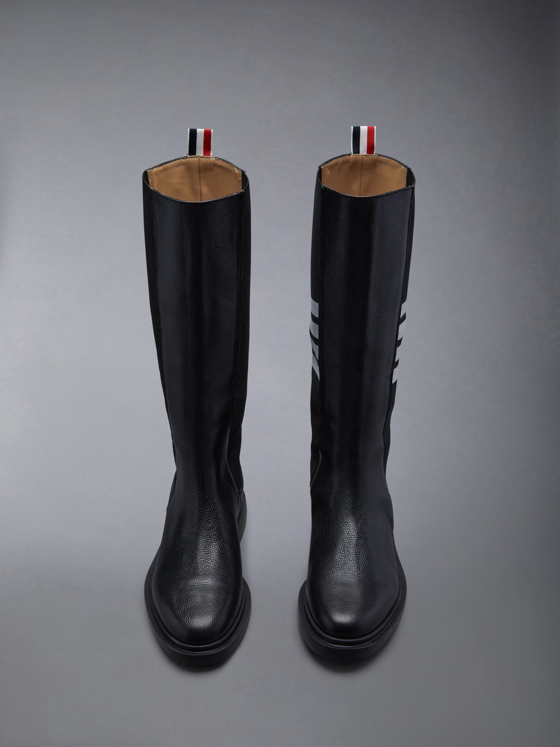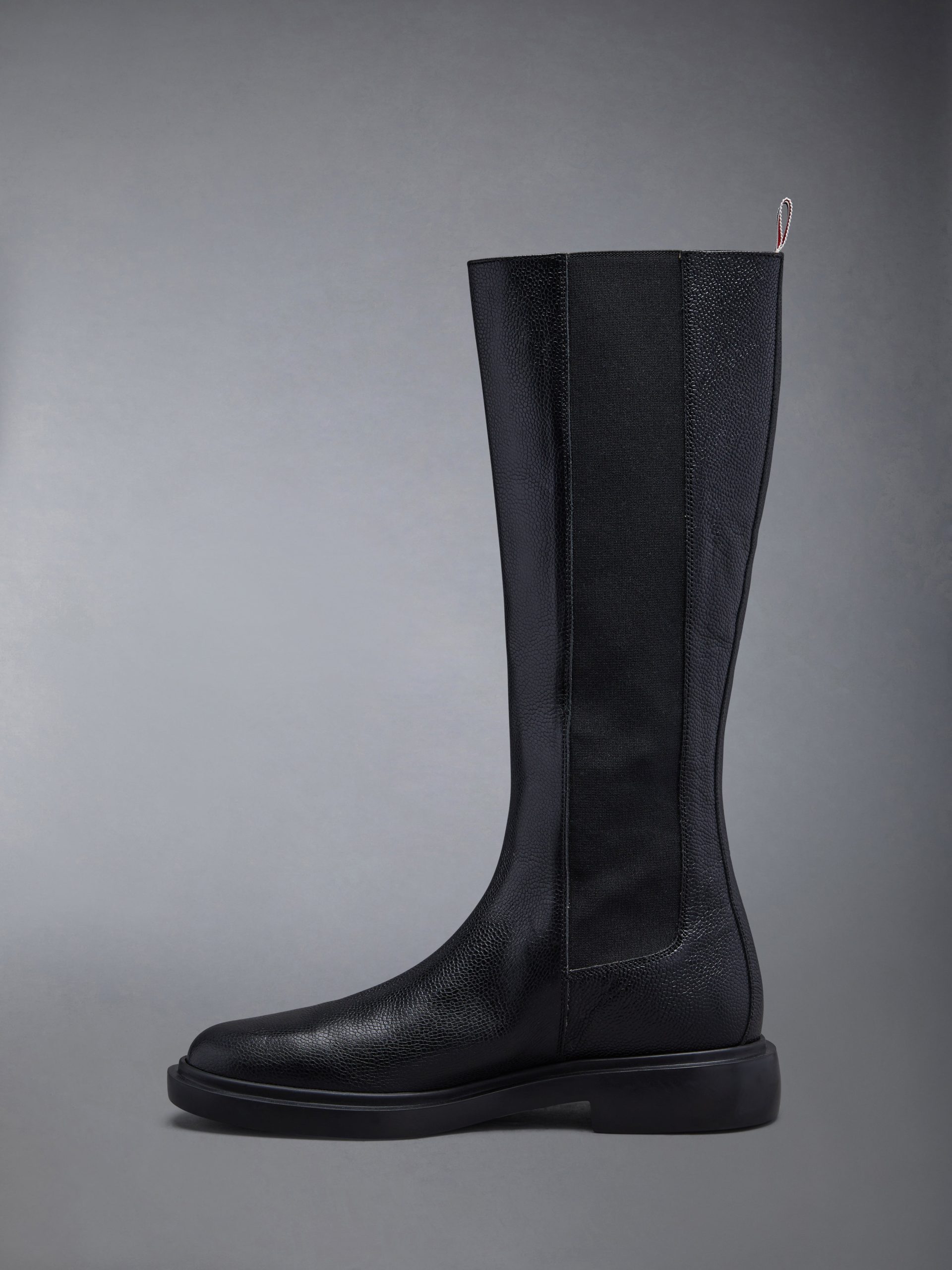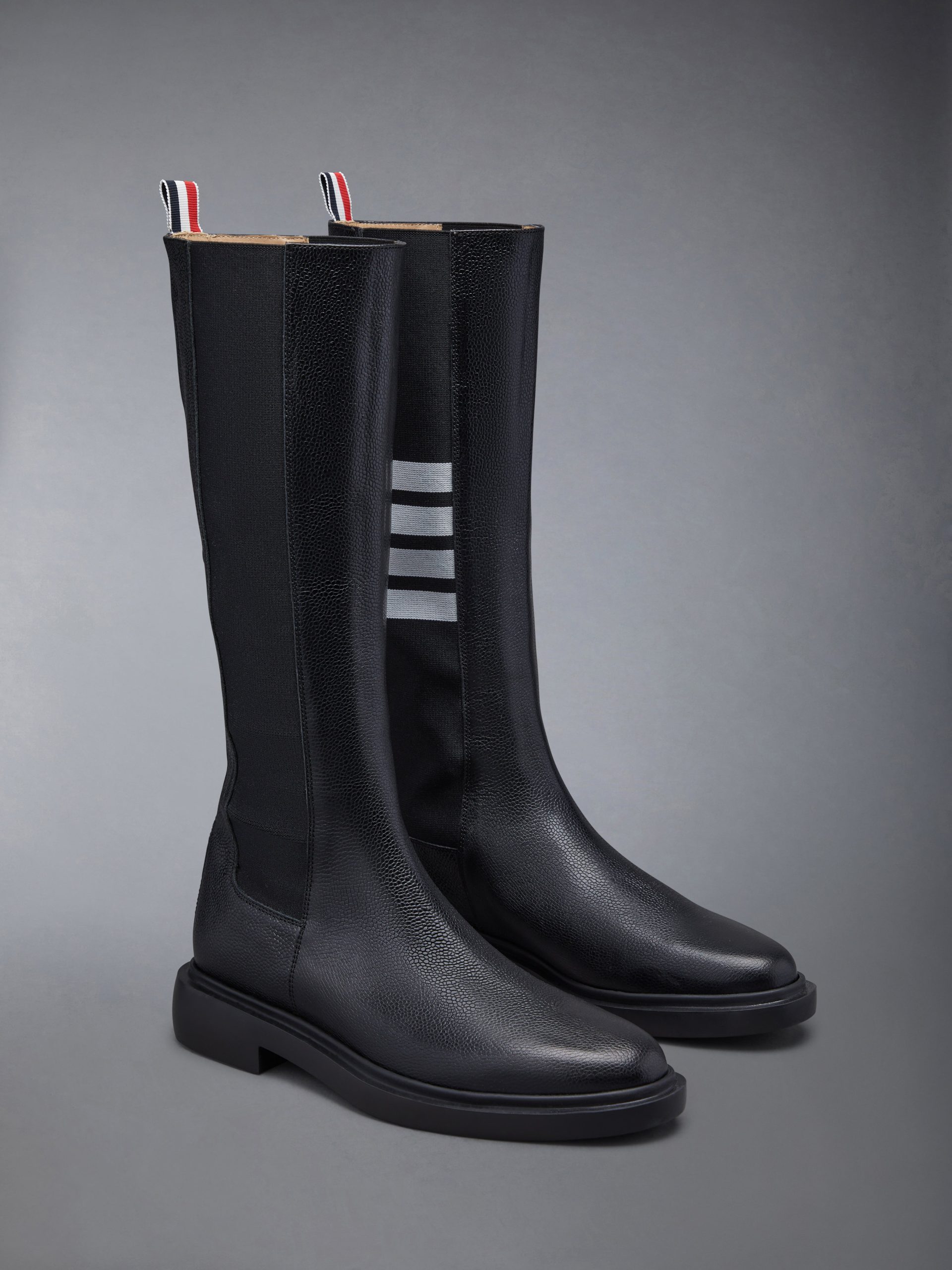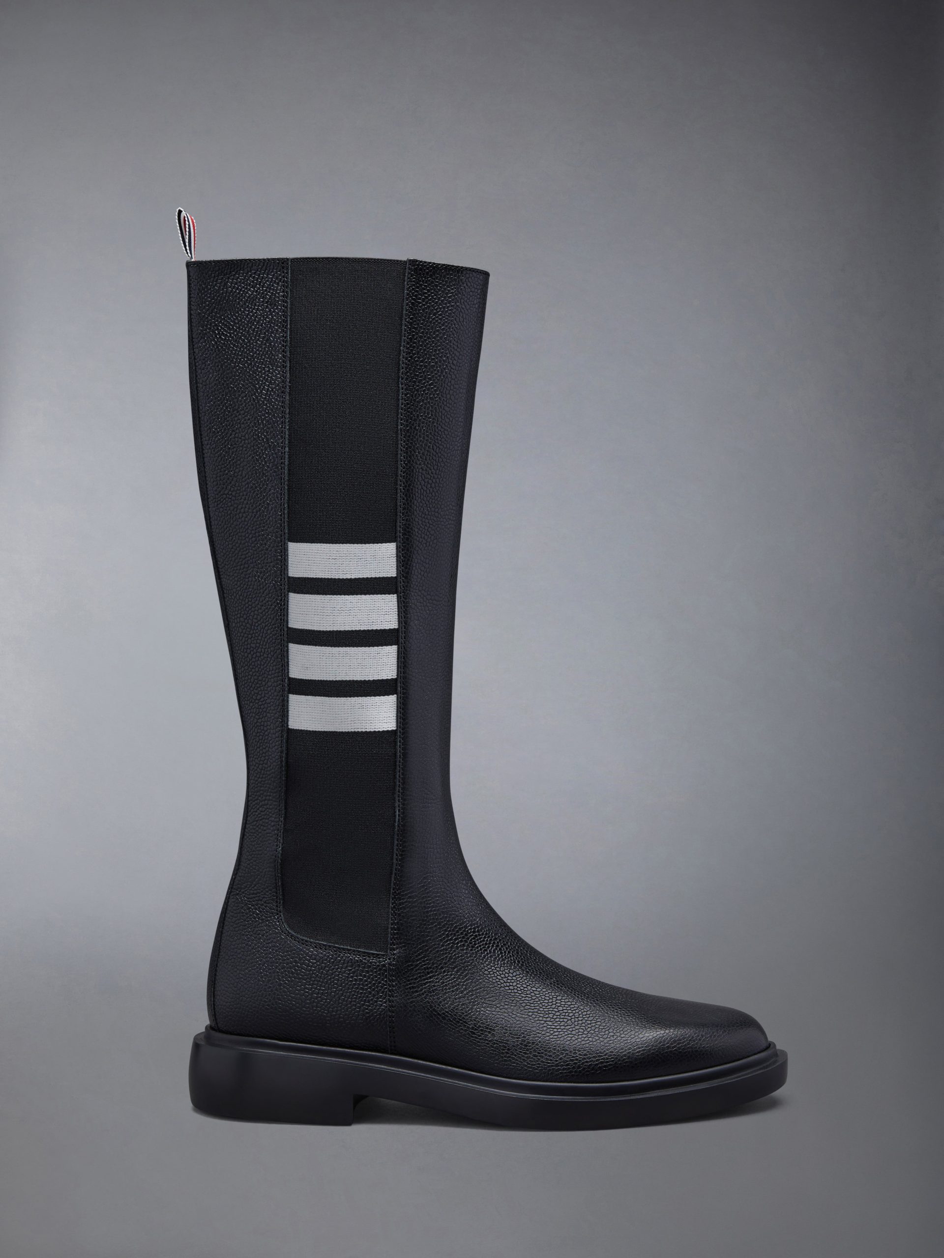 Crafted with the highest quality of classic shoemaking. our Pebble Grain 4-Bar Knee High Chelsea Boot is a staple in Thom Browne’s legacy.