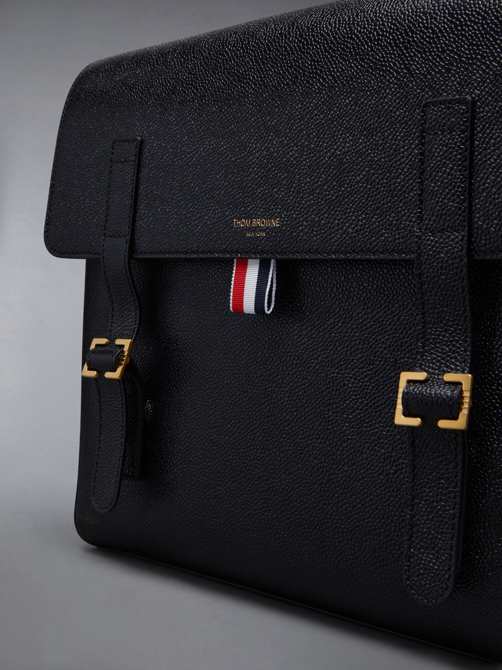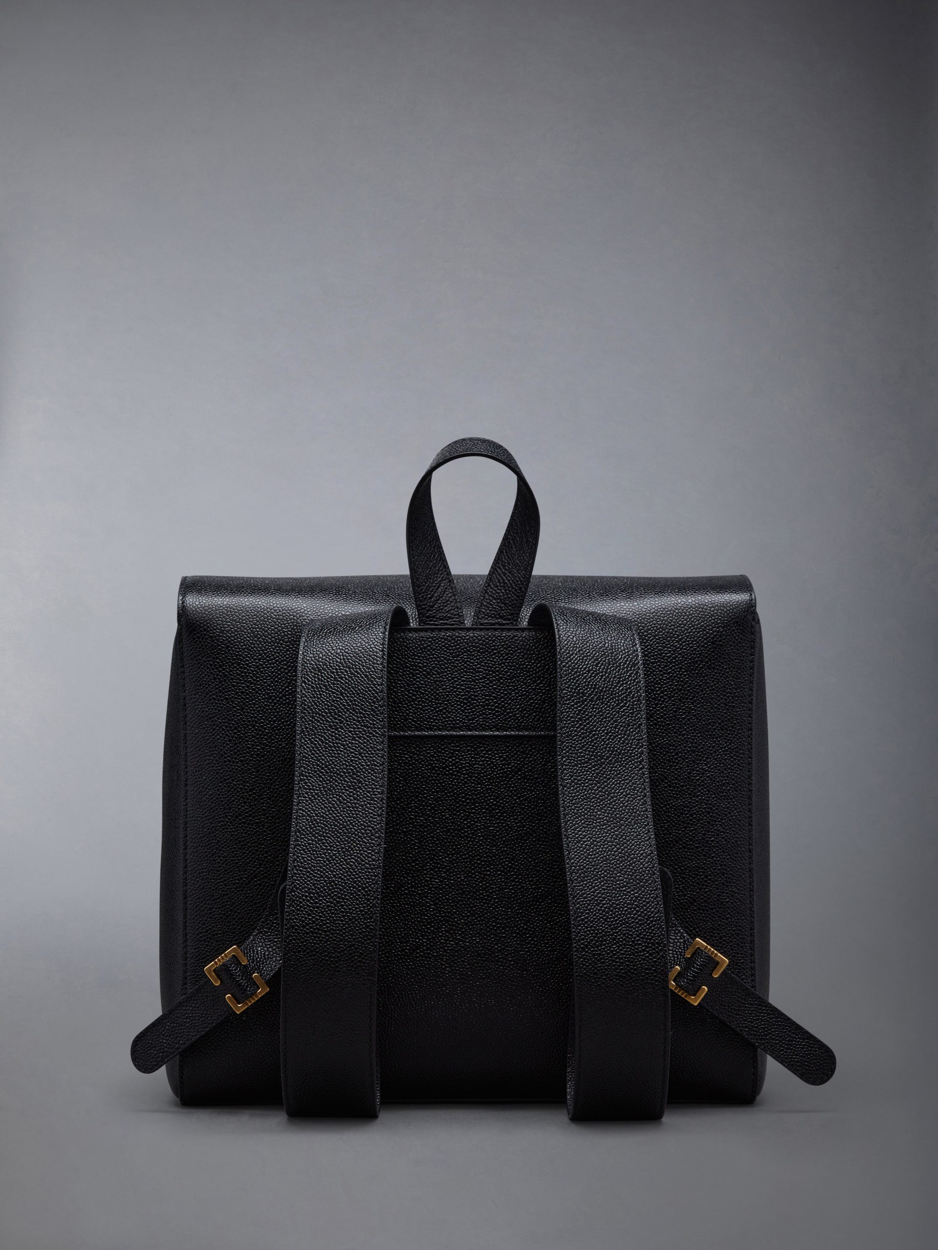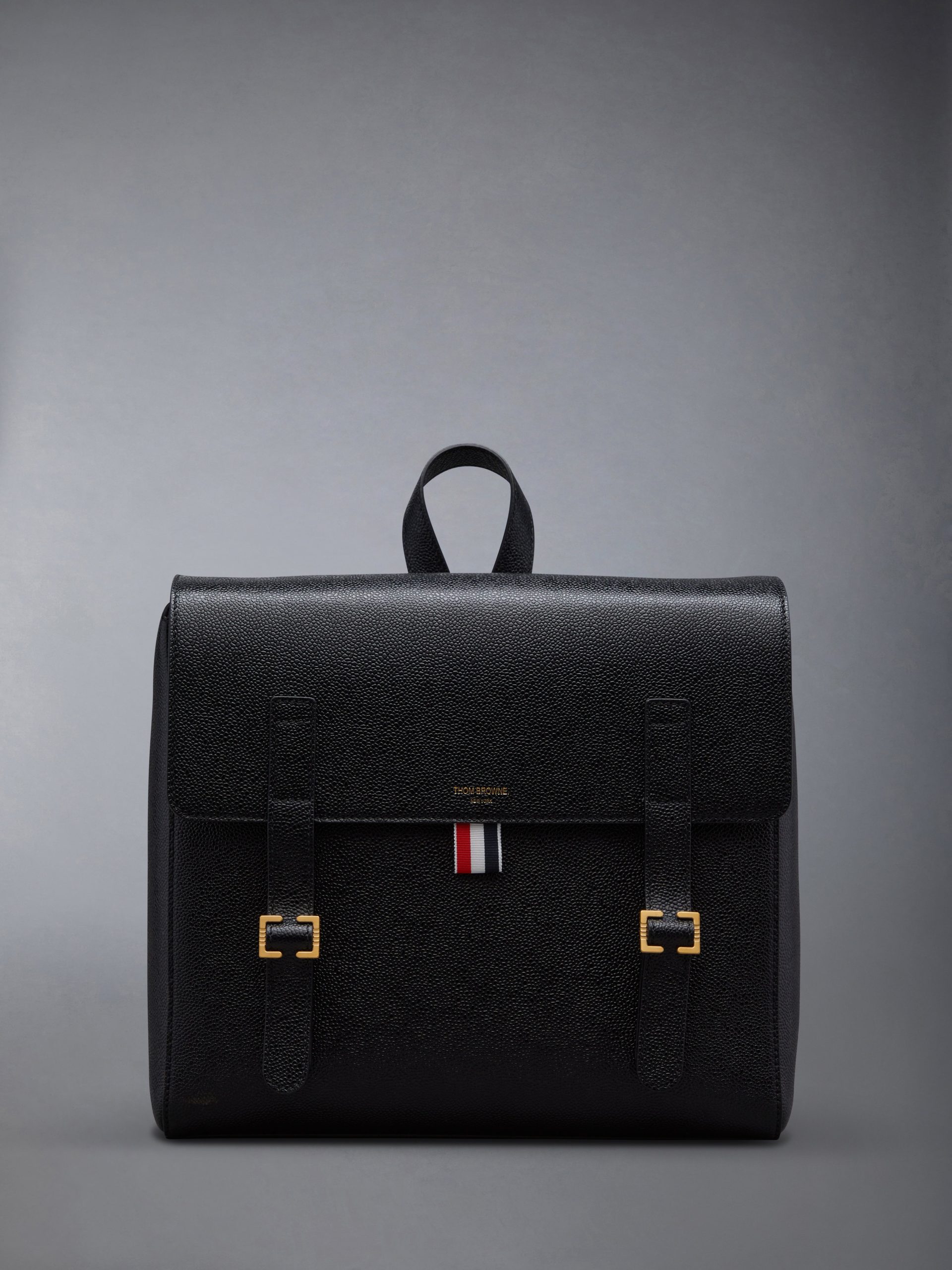 Functionality meets sophistication in our Pebble Grain Book Bag. A sharp accessory to any Thom Browne suit. this silhouette is adorned with two brass buckle closures and an adjustable leather backpack strap.