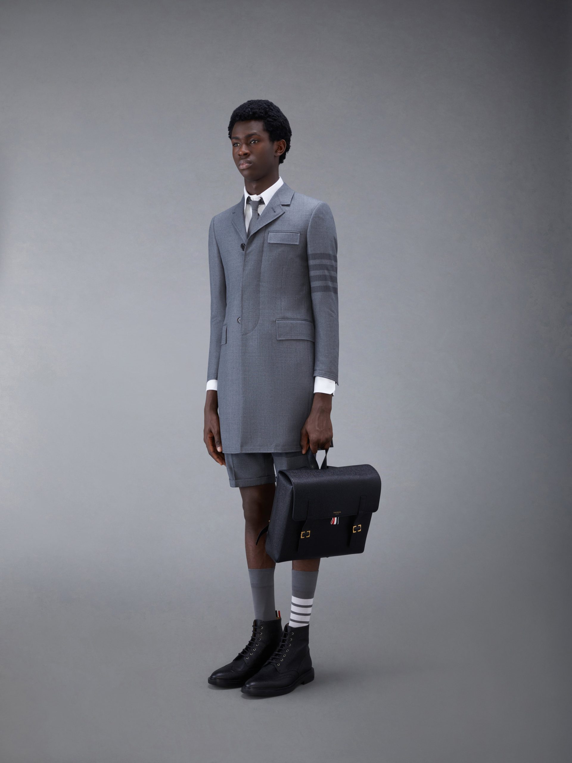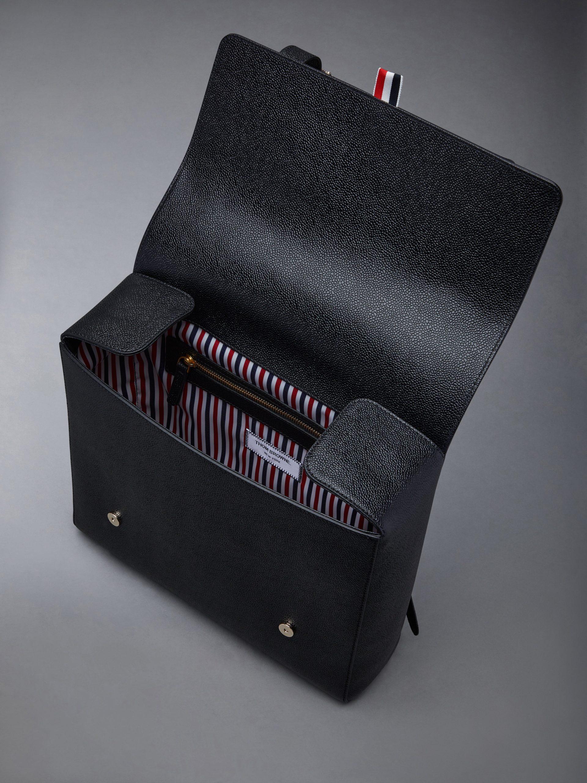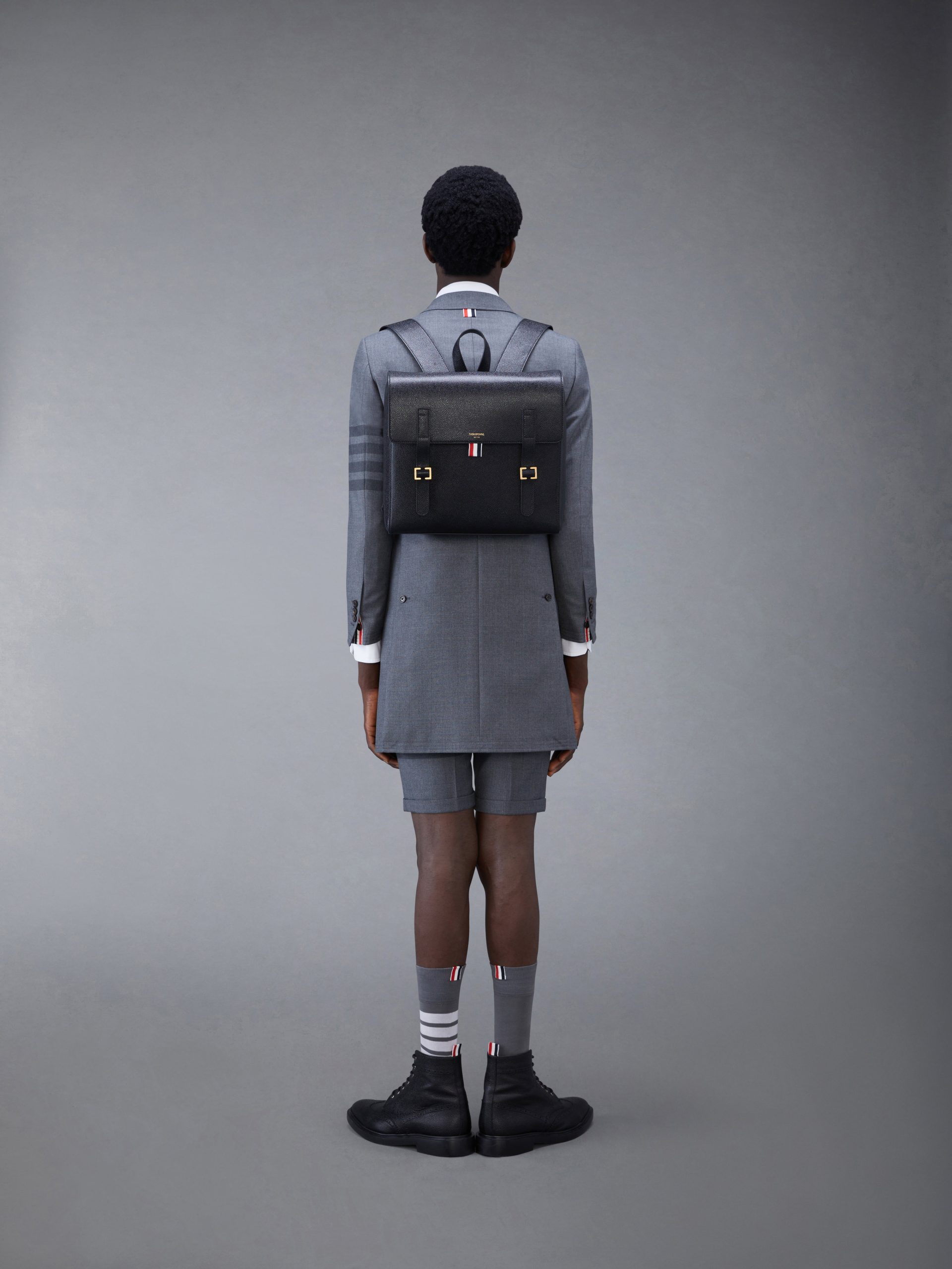 Functionality meets sophistication in our Pebble Grain Book Bag. A sharp accessory to any Thom Browne suit. this silhouette is adorned with two brass buckle closures and an adjustable leather backpack strap.