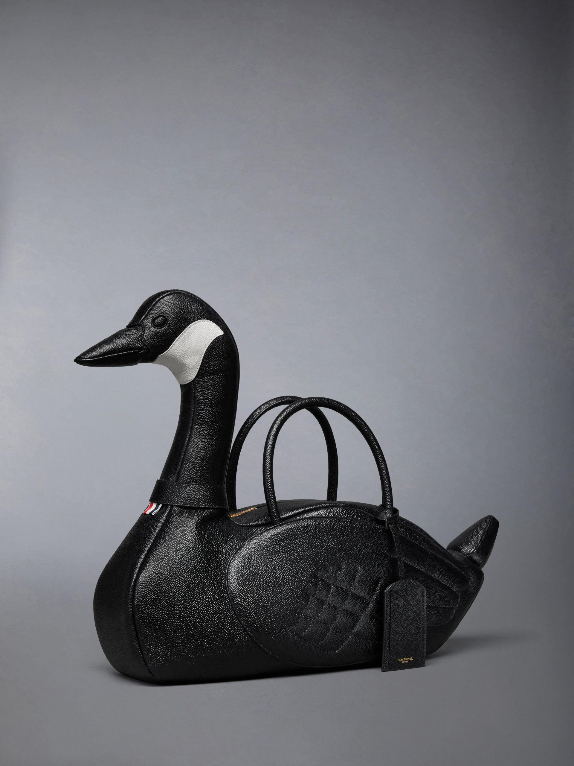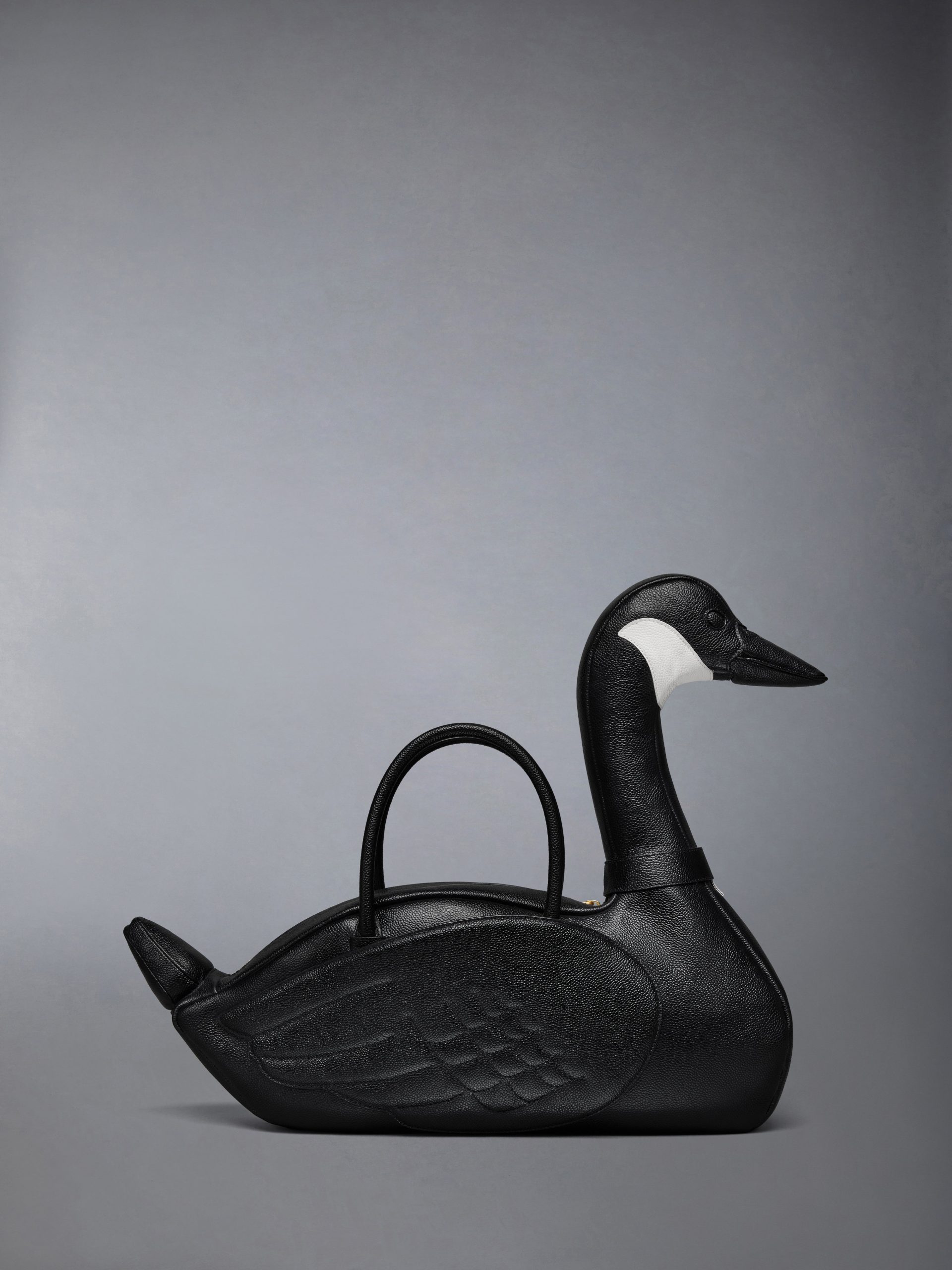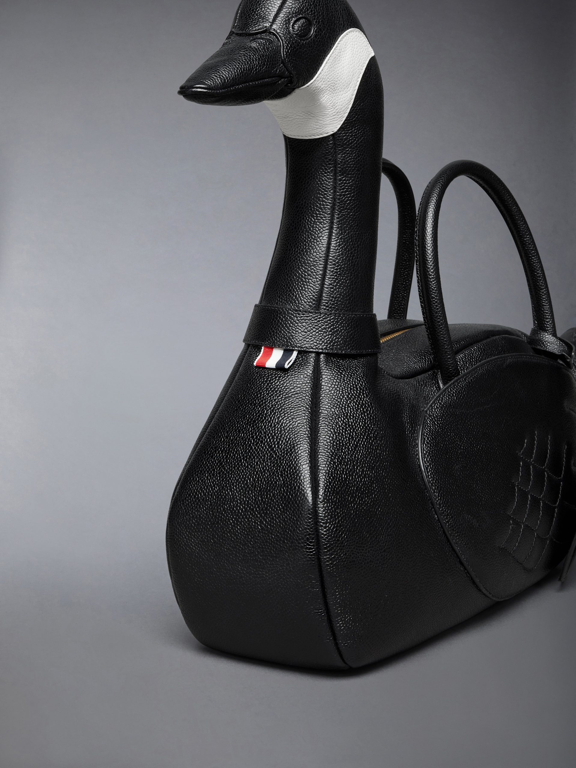 Introducing the Goose Bag. a whimsical addition to Thom Browne’s celebrated collection of animal bags. Meticulously crafted from durable pebble grain leather. it celebrates the remarkable migratory journeys geese take. symbolizing change and new beginnings.