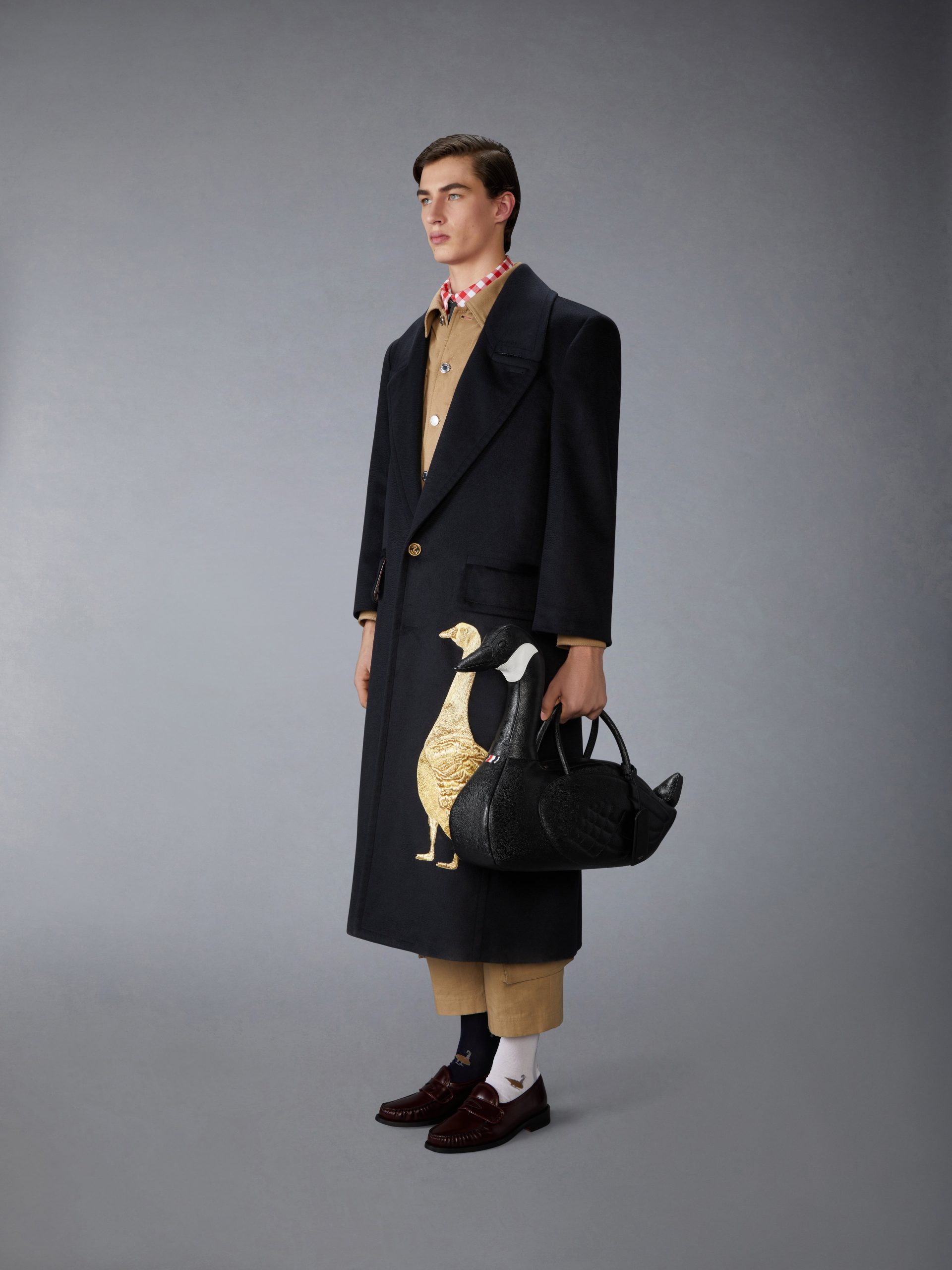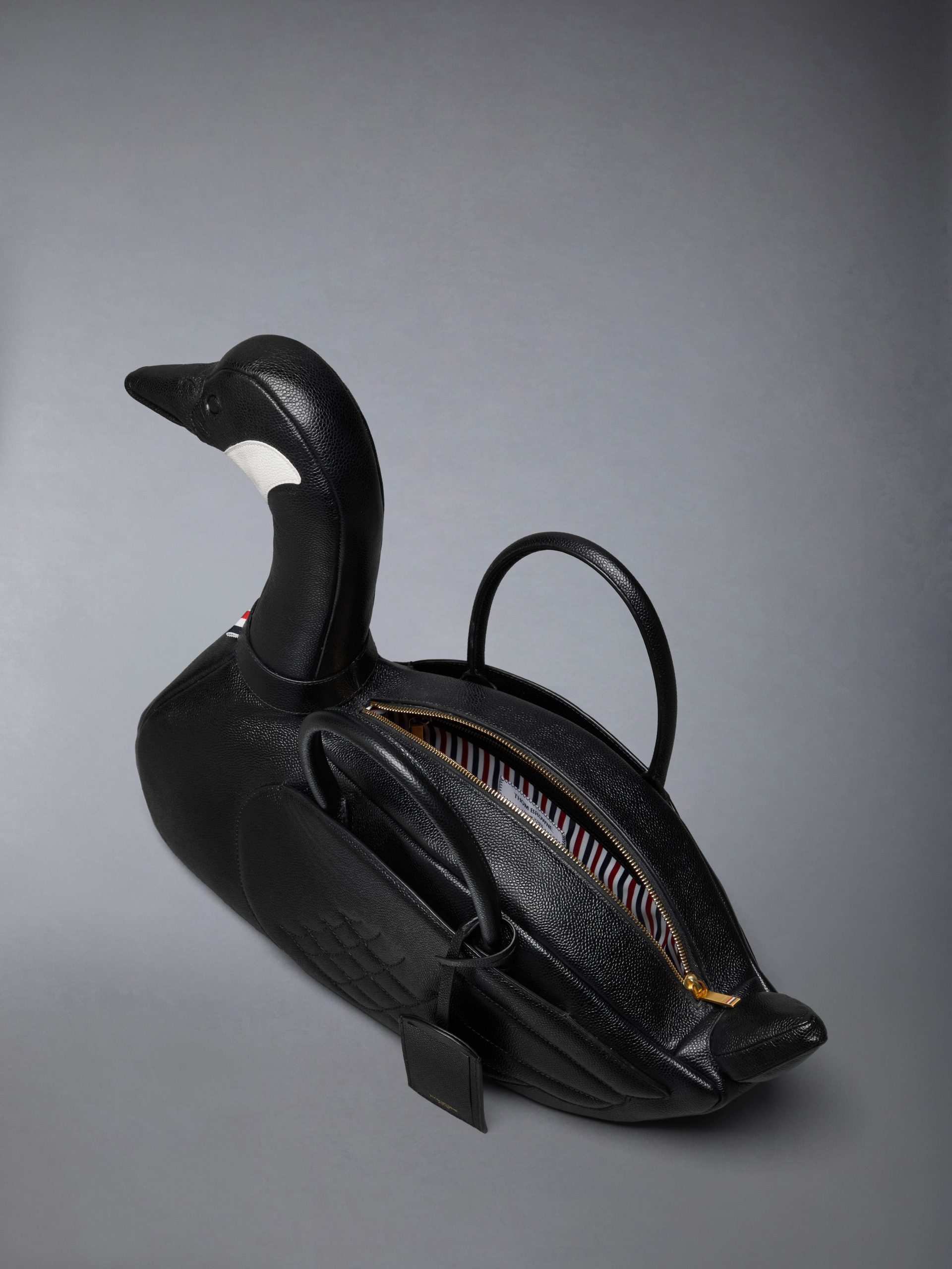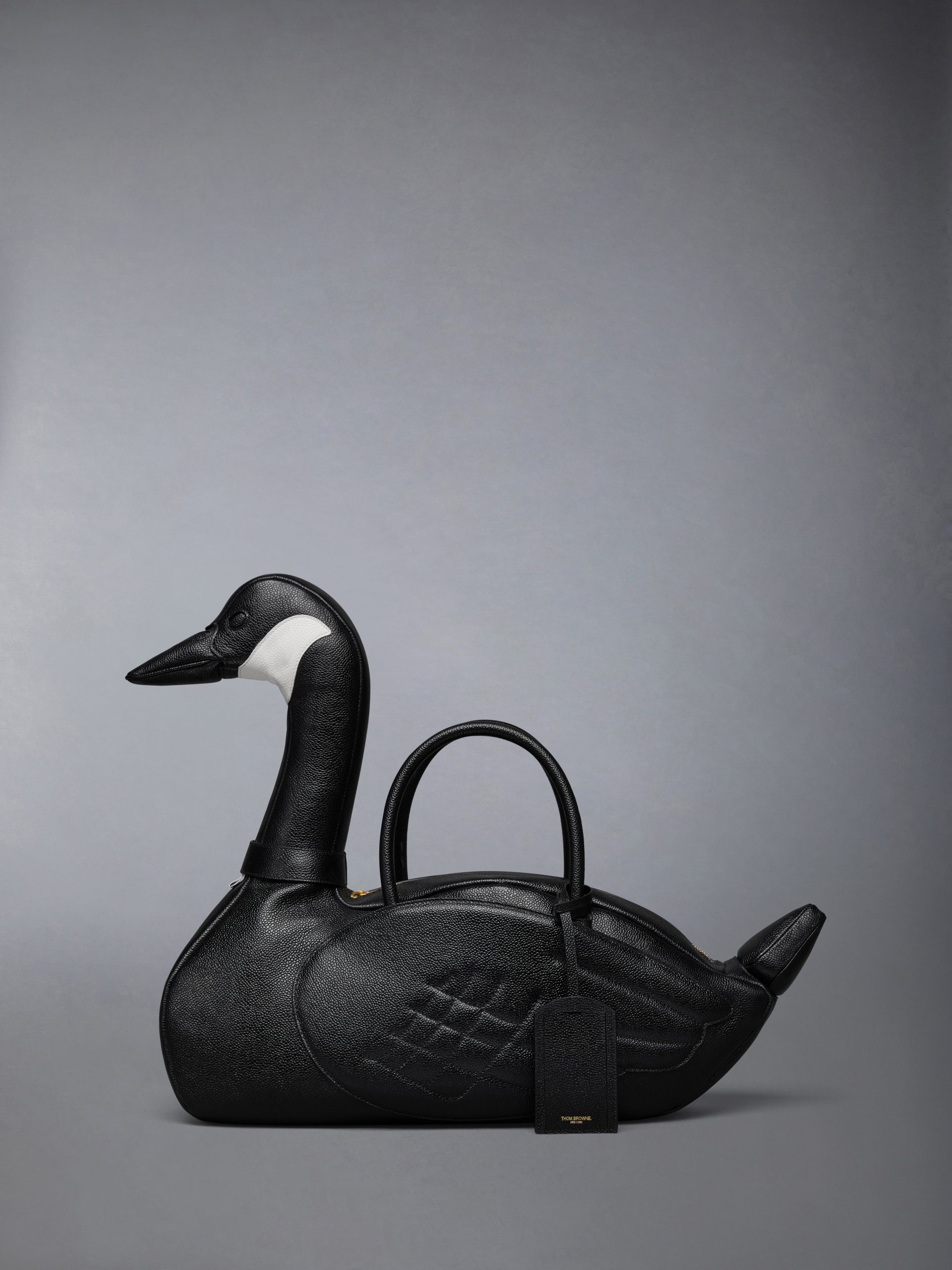 Introducing the Goose Bag. a whimsical addition to Thom Browne’s celebrated collection of animal bags. Meticulously crafted from durable pebble grain leather. it celebrates the remarkable migratory journeys geese take. symbolizing change and new beginnings.