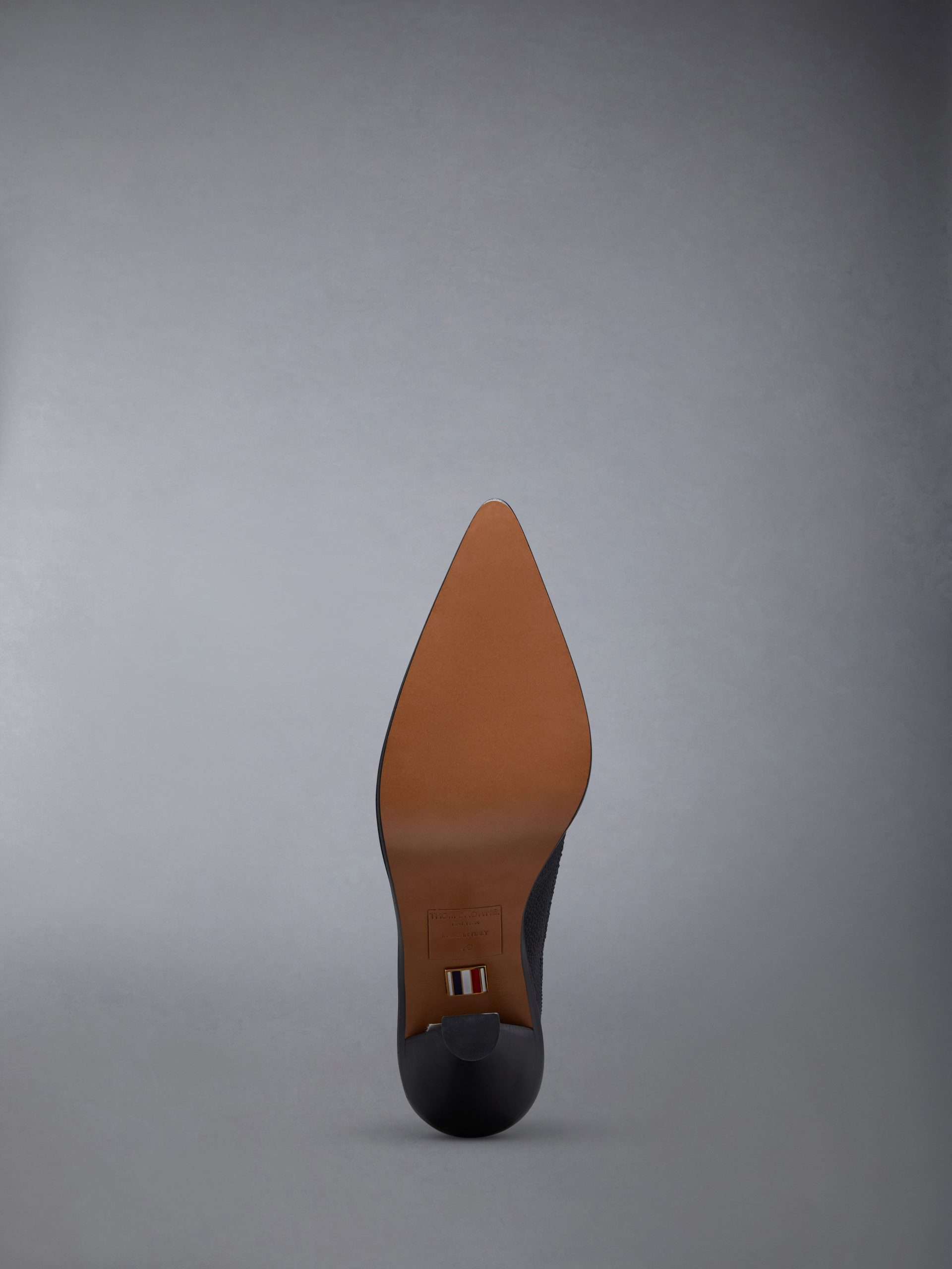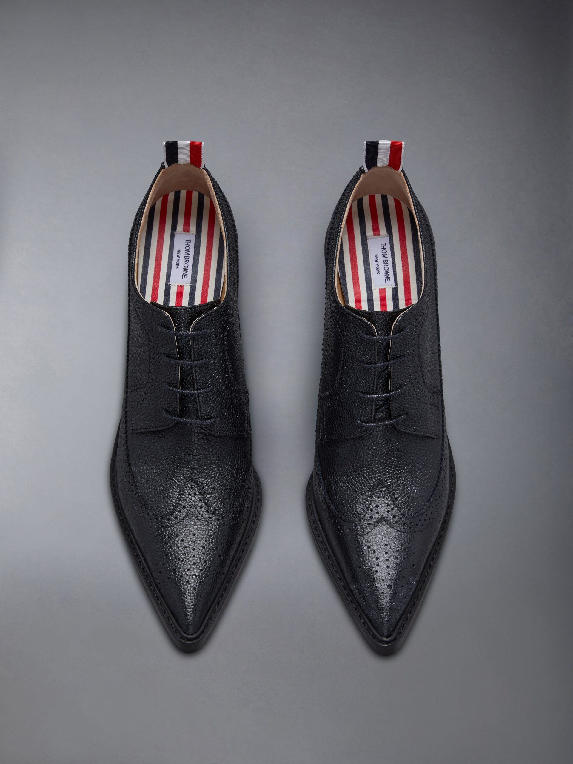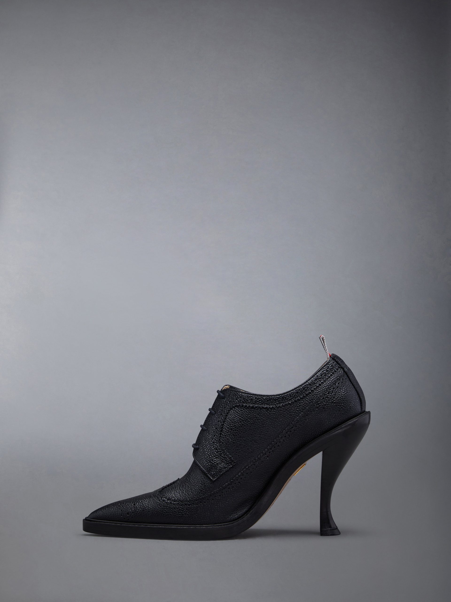 Crafted with the highest quality of classic shoemaking. our Pebble Grain Heeled Longwing Brogue is a staple in Thom Browne’s legacy. Features an elongated toe. leather sole. and 105mm curved heel.