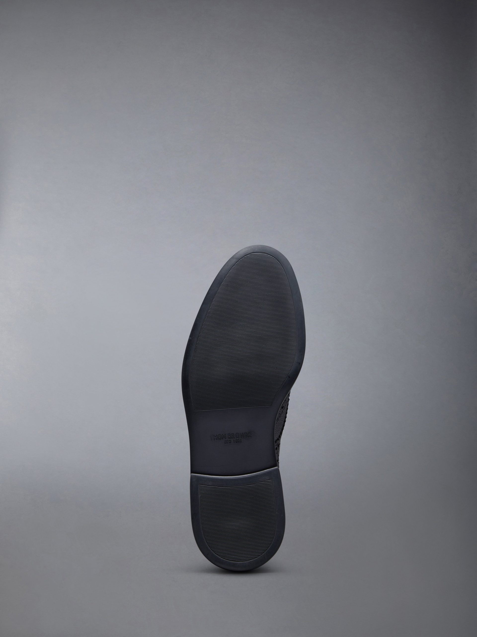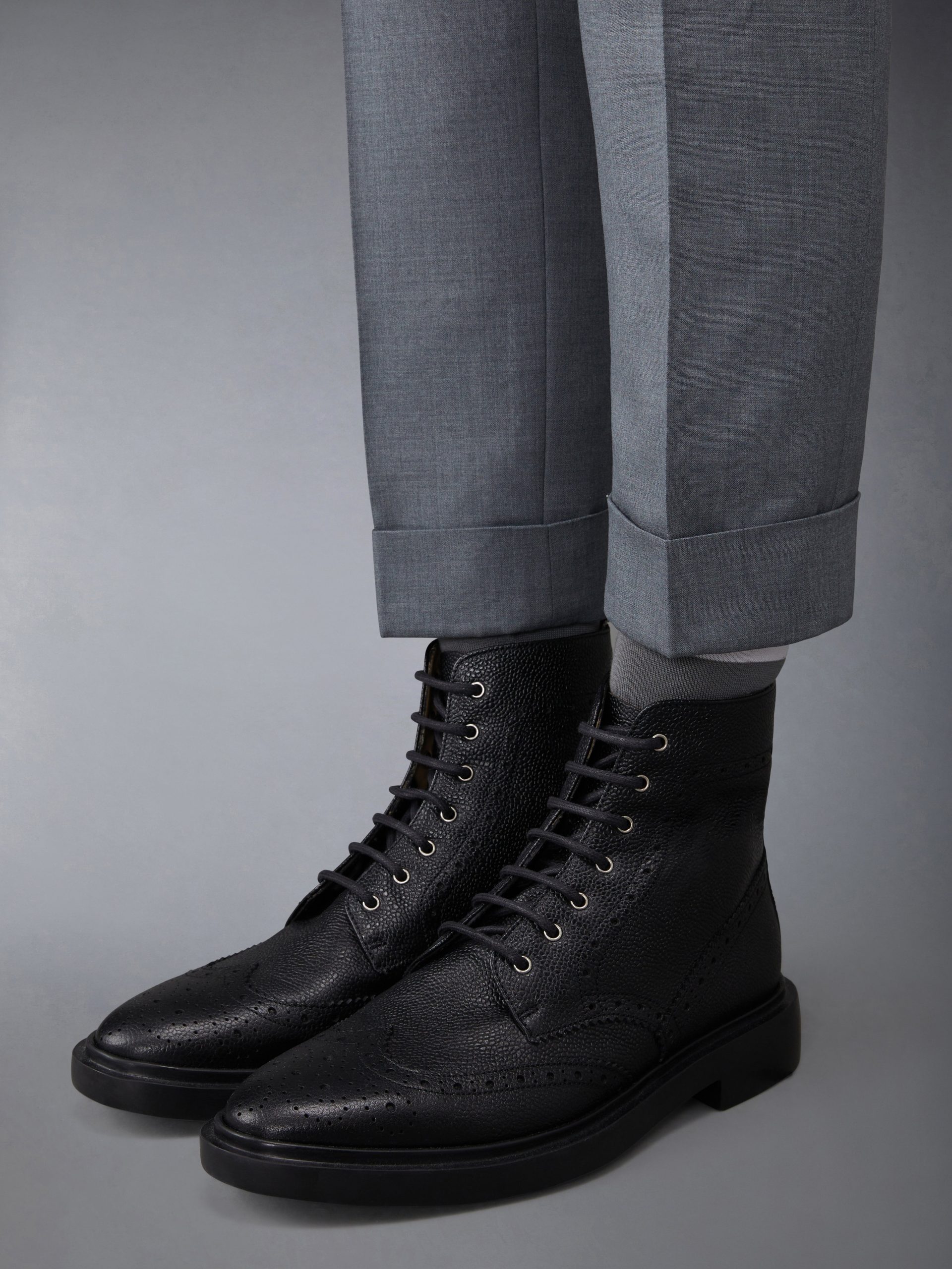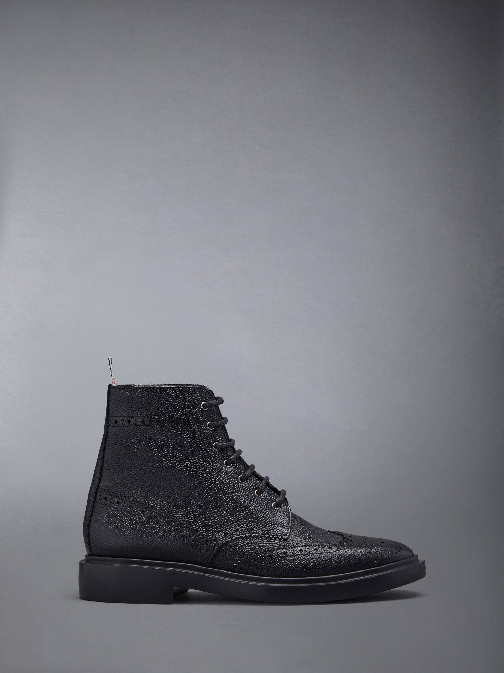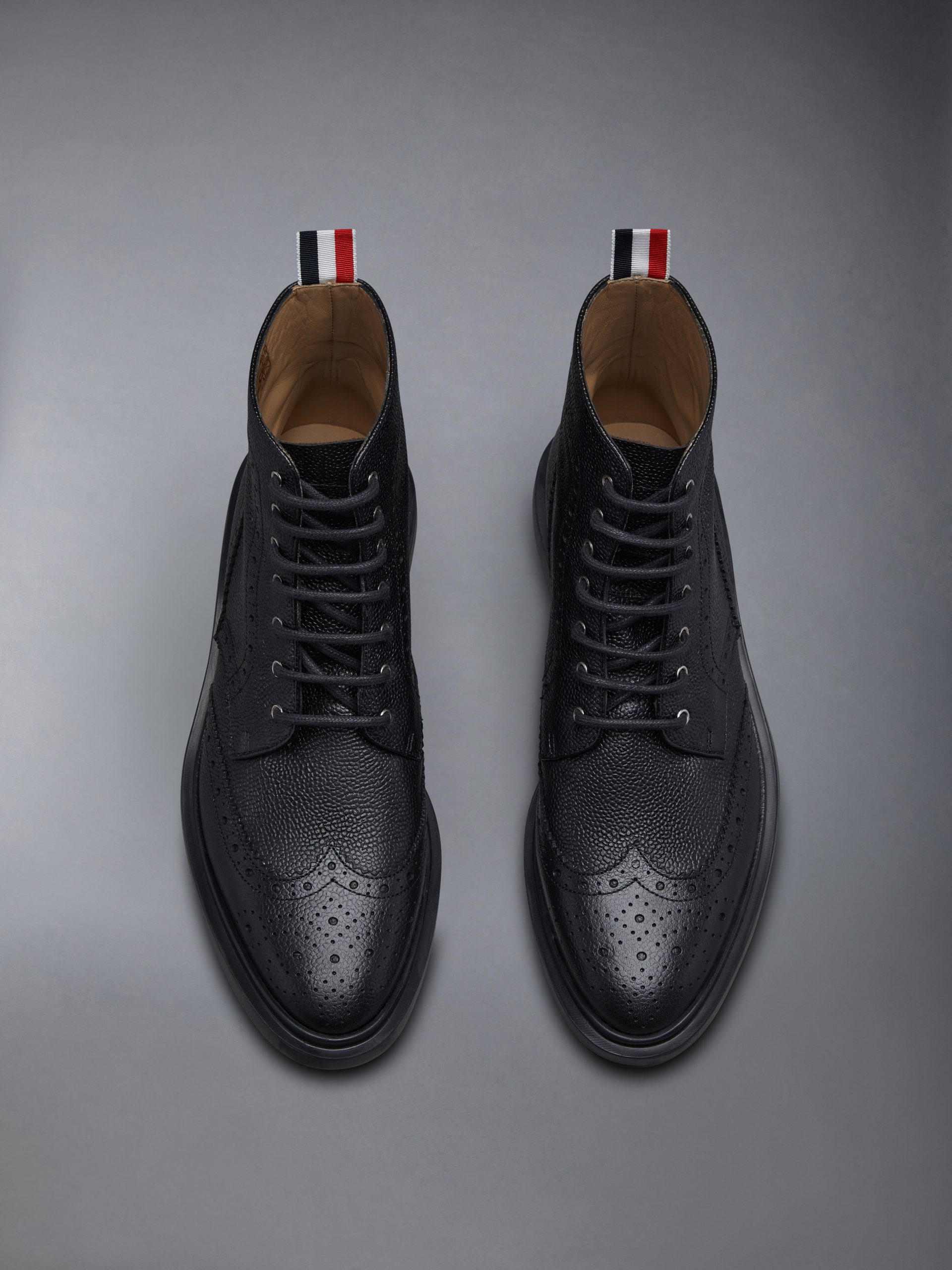 Crafted with the highest quality of classic shoemaking. our Pebble Grain Wingtip Boot is a staple in Thom Browne’s legacy. Features an elongated toe. lightweight rubber sole. and streamlined silhouette.