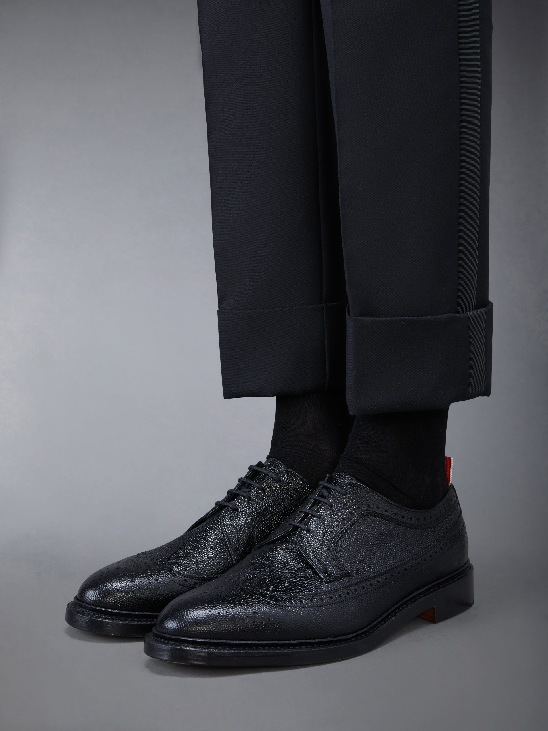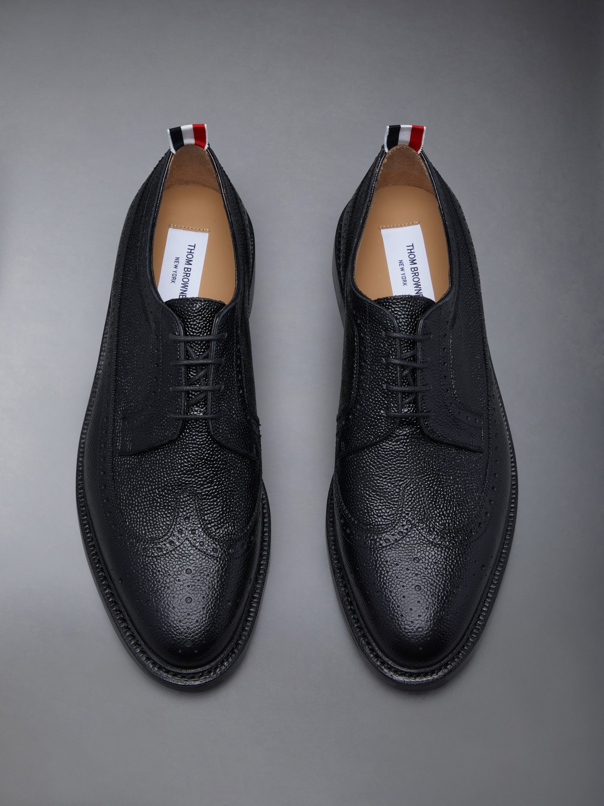 Crafted with the highest quality of classic shoemaking. our Pebble Grain Longwing Brogue Lucido Leather is a staple in Thom Browne’s legacy. Features an elongated toe. goodyear leather sole. and streamlined silhouette.