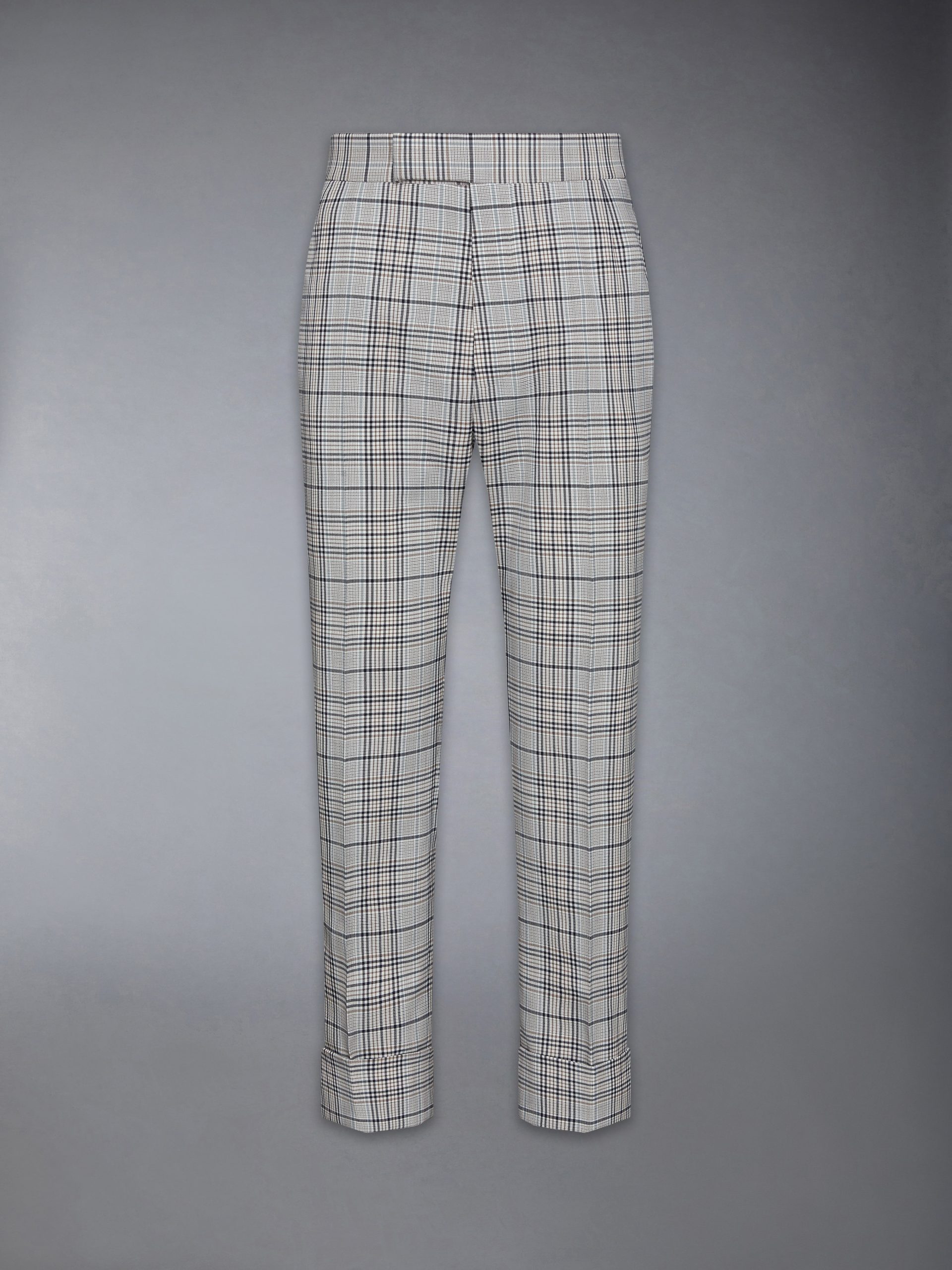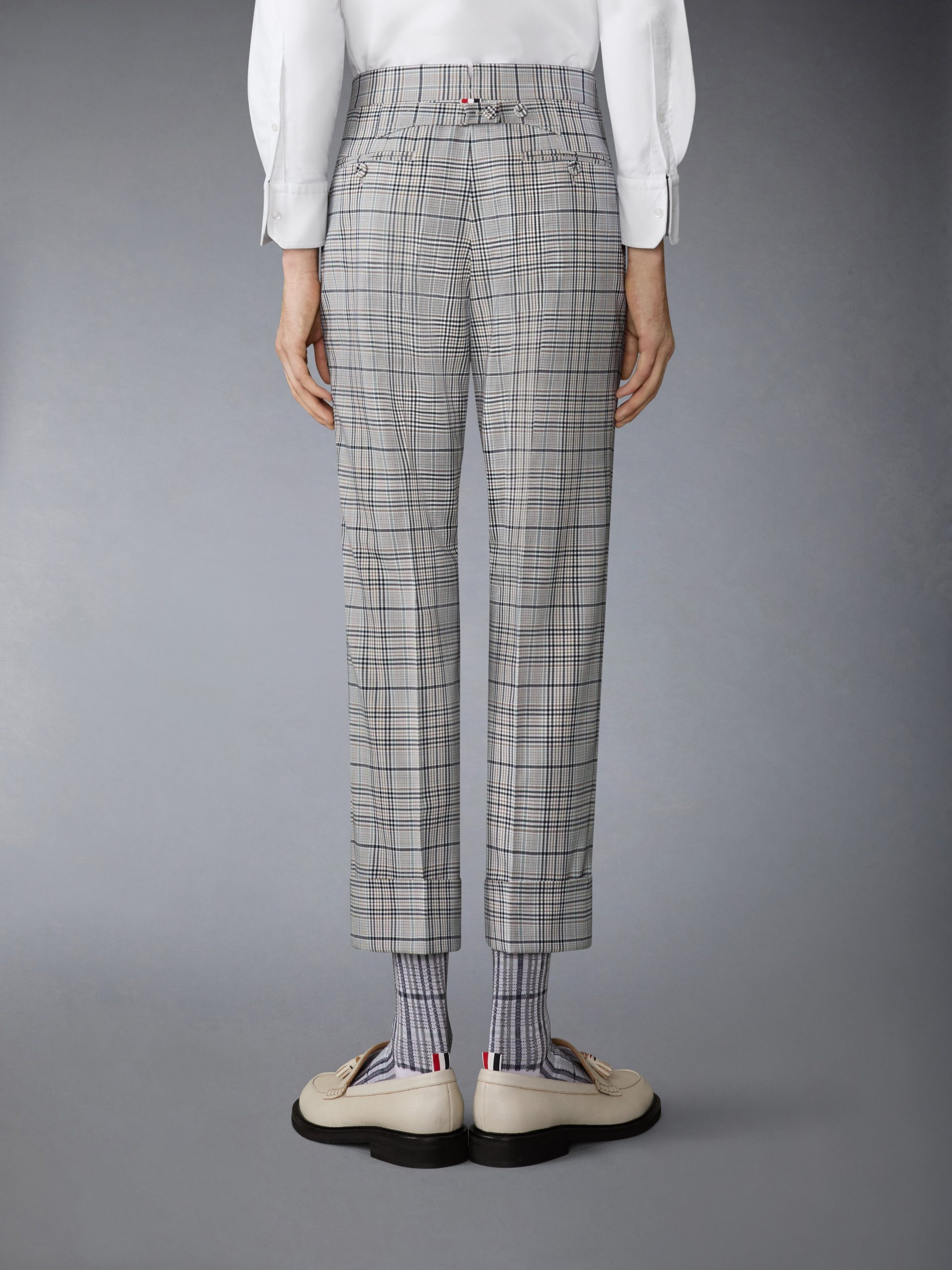 Thom Browne’s iconic backstrap trouser returns this season in cool wool. woven in a plain weave from high-twist yarns for lasting structure and a refined finish. The bold plaid check reinterprets a classic tailoring motif. while crisp creasing and a cropped hem ground the silhouette in modern versatility.