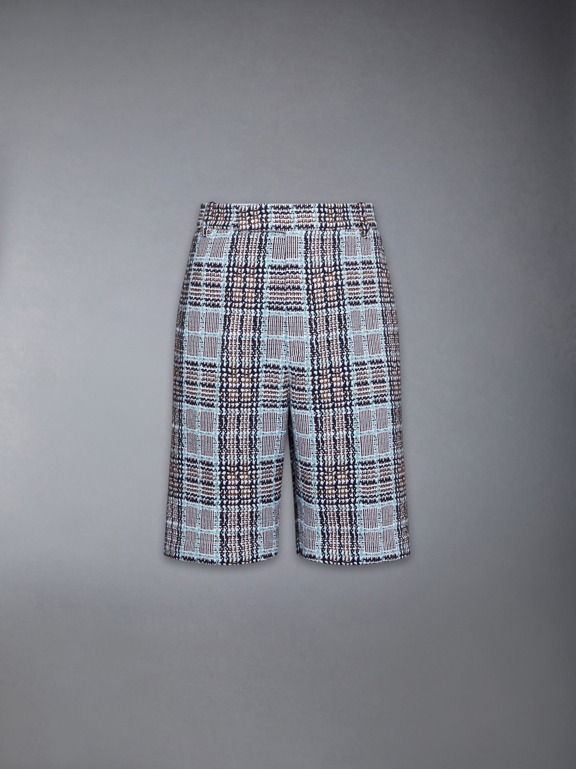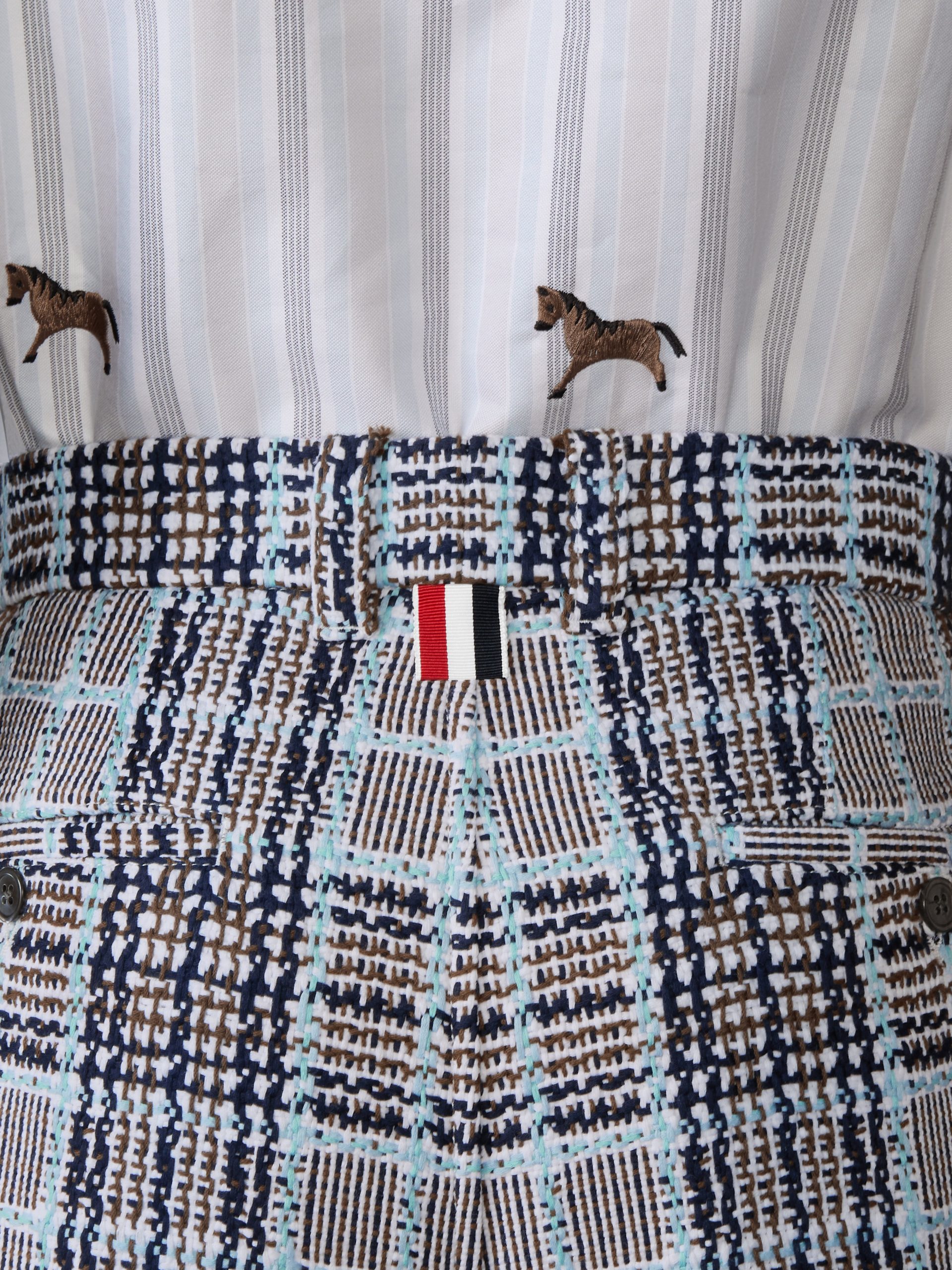 Tailored in lightweight summer tweed with a subtle plaid check. these utility chino shorts refine casual structure with textural depth. Finished with Thom Browne signatures. the clean silhouette bridges seasonal polish and uniform ease. Coordinate with the Plaid Check Summer Tweed Sport Coat.
