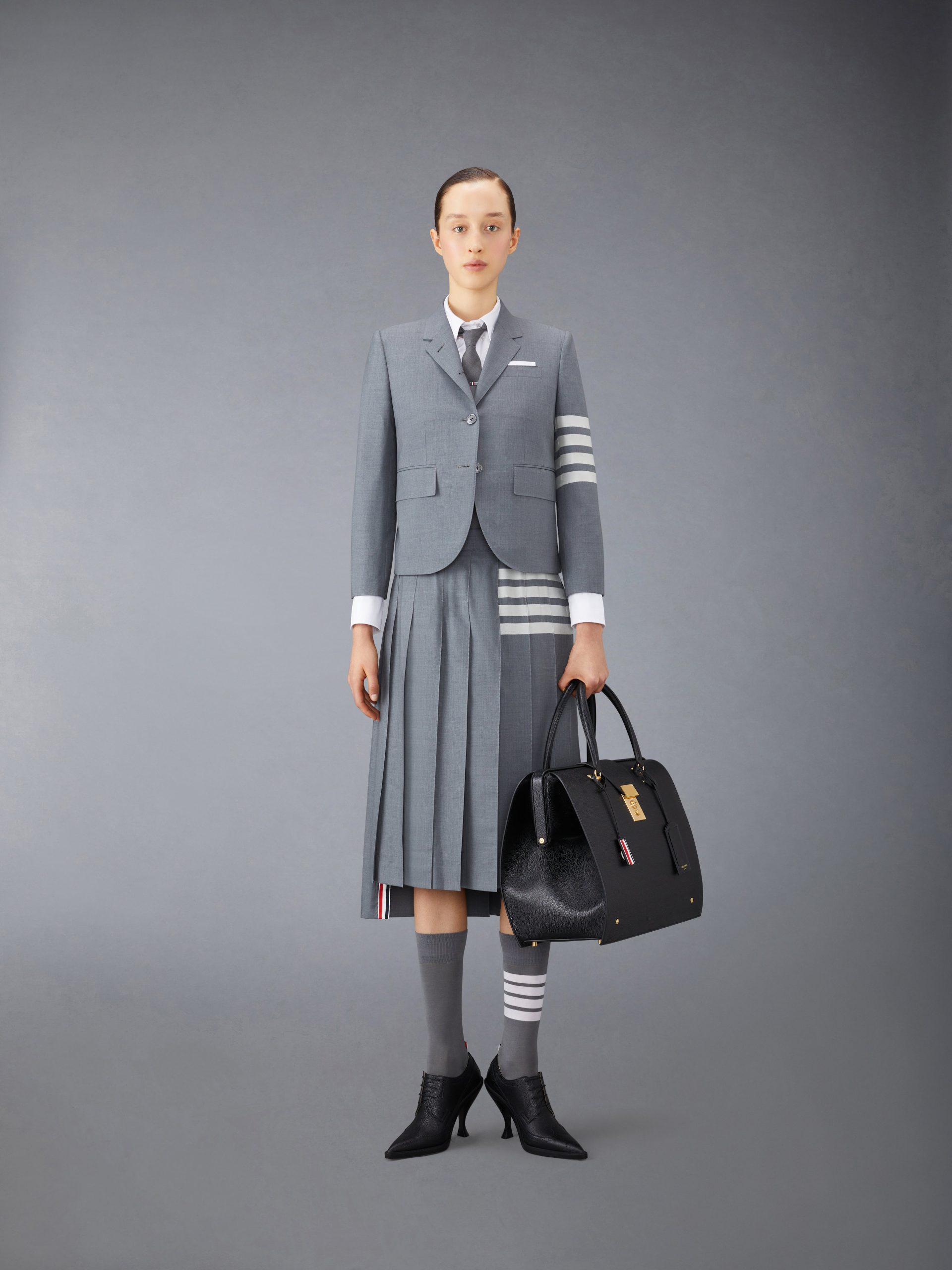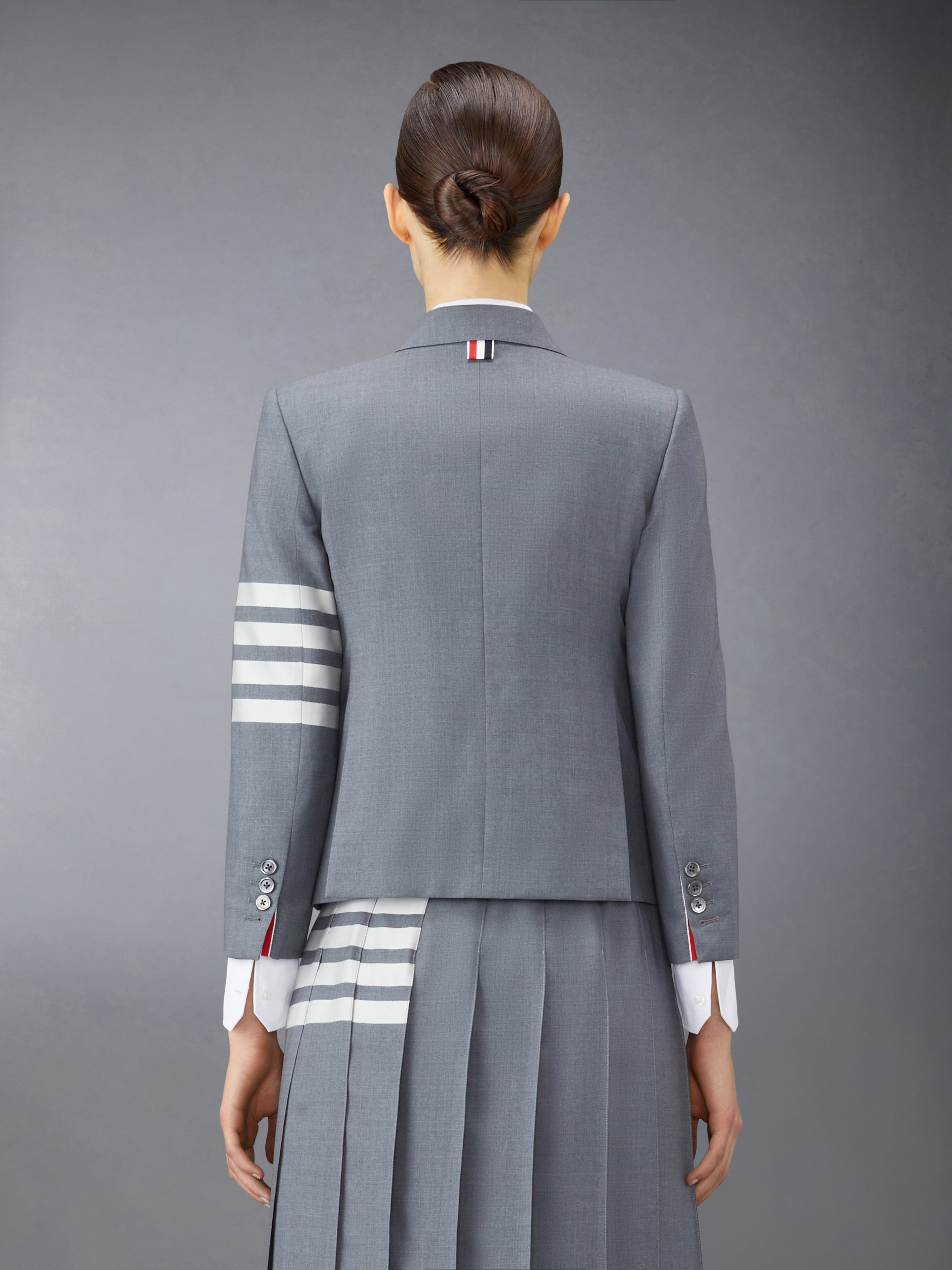 Our Plain Weave Suiting Engineered 4-Bar High Armhole Sport Coat embraces a slimmer fit taken from punk influences. while remaining true to Thom Browne’s classic heritage. Pair with our Plain Weave Suiting Skirts or Trousuers.
