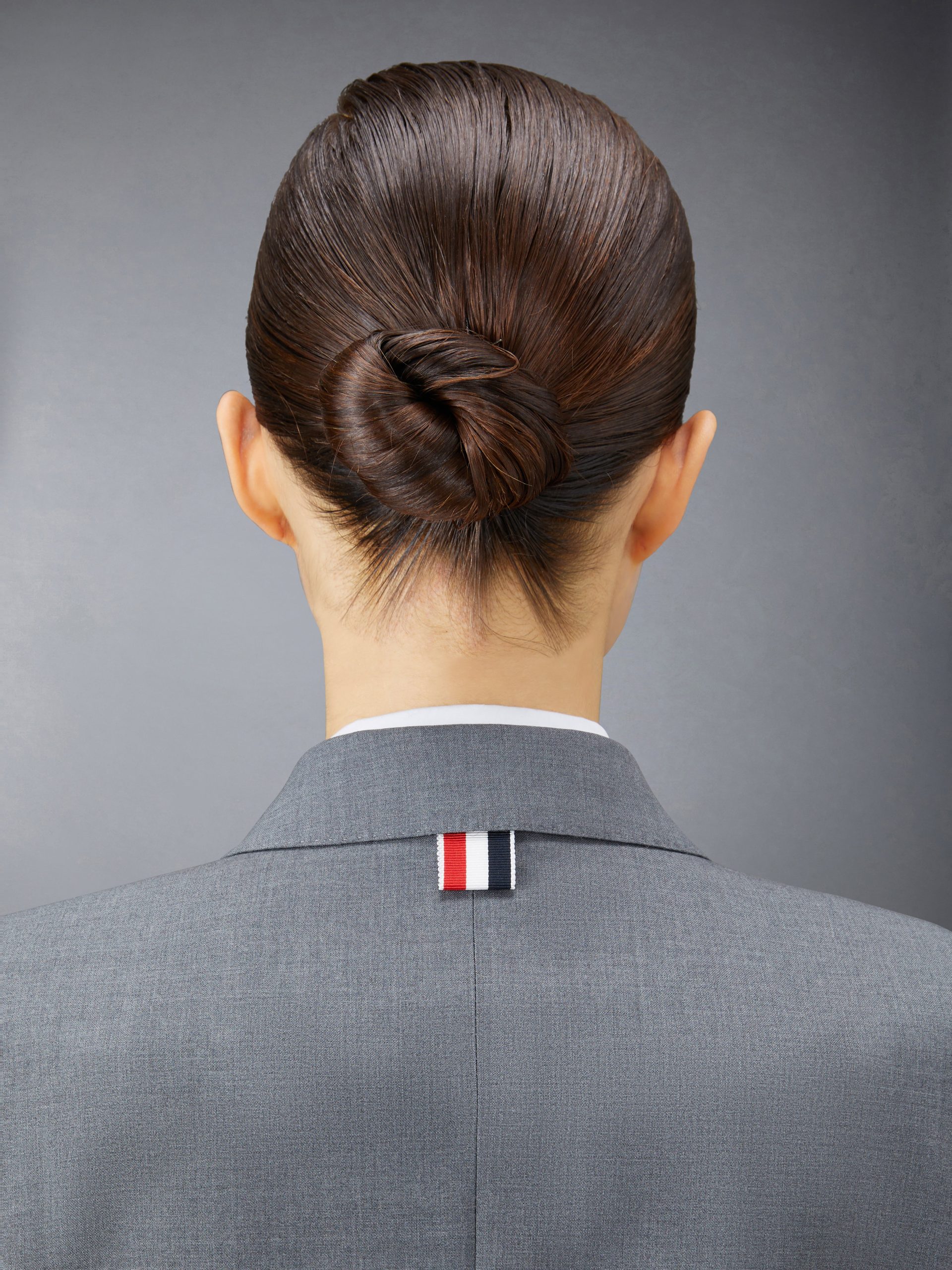 Signature striped grosgrain loop tab at back of neck