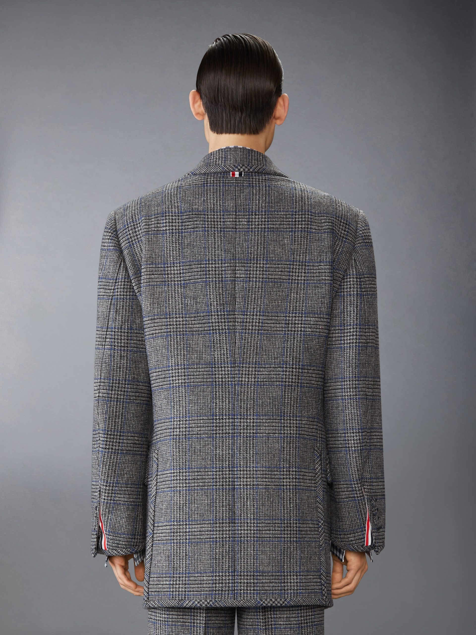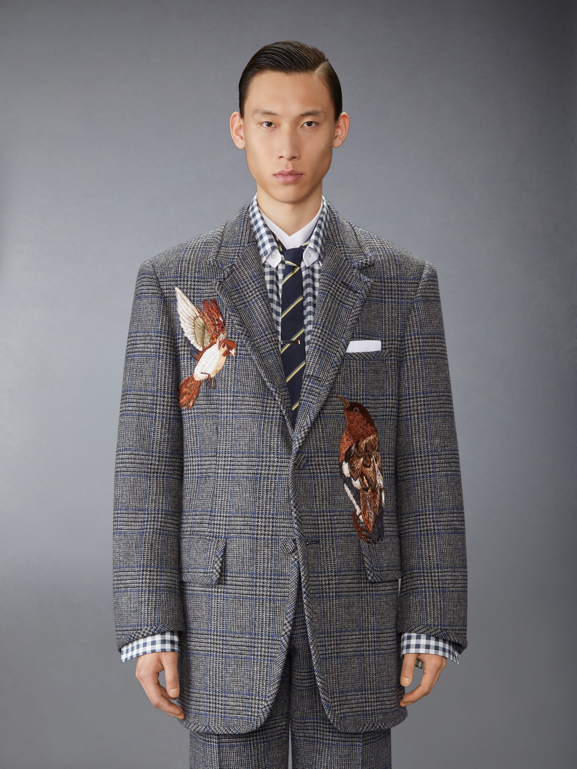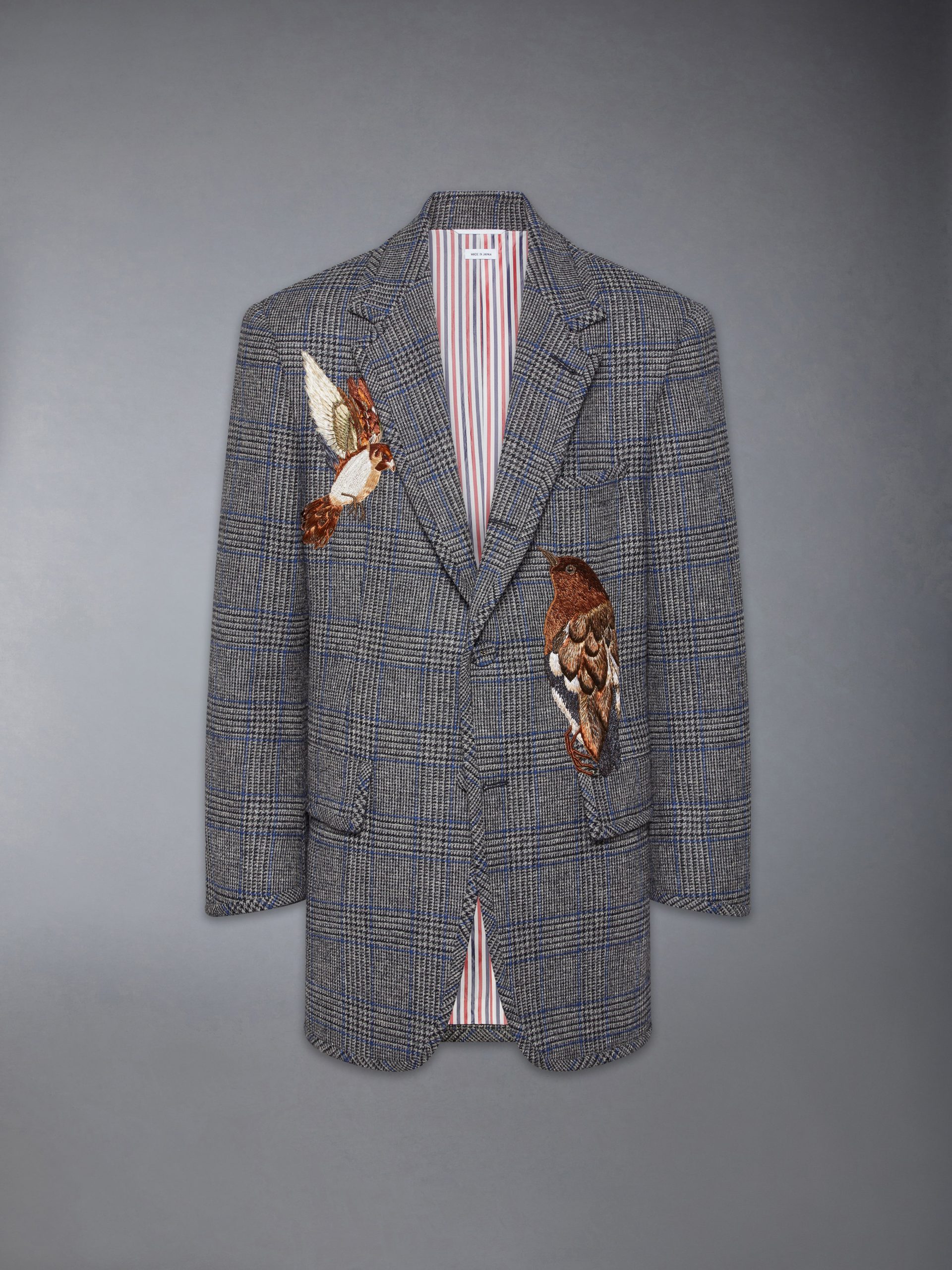 Adorned with bullion satin stitch–embroidered canaries in flight. this exquisite sport coat reflects the poetic spirit of the Fall/Winter 2025 collection. Thom takes tailoring on a contemplative journey. viewing it through the lens of birding—a practice rooted in patience. precision. and an appreciation for fleeting beauty. At the heart of this narrative is the canary: one of the few birds capable of escaping the eye of a hurricane. and a symbol of resilience. freedom. and the quiet strength of choosing your own path. Complete the suit with our Prince of Wales Hunting Tweed Backstrap Shorts.