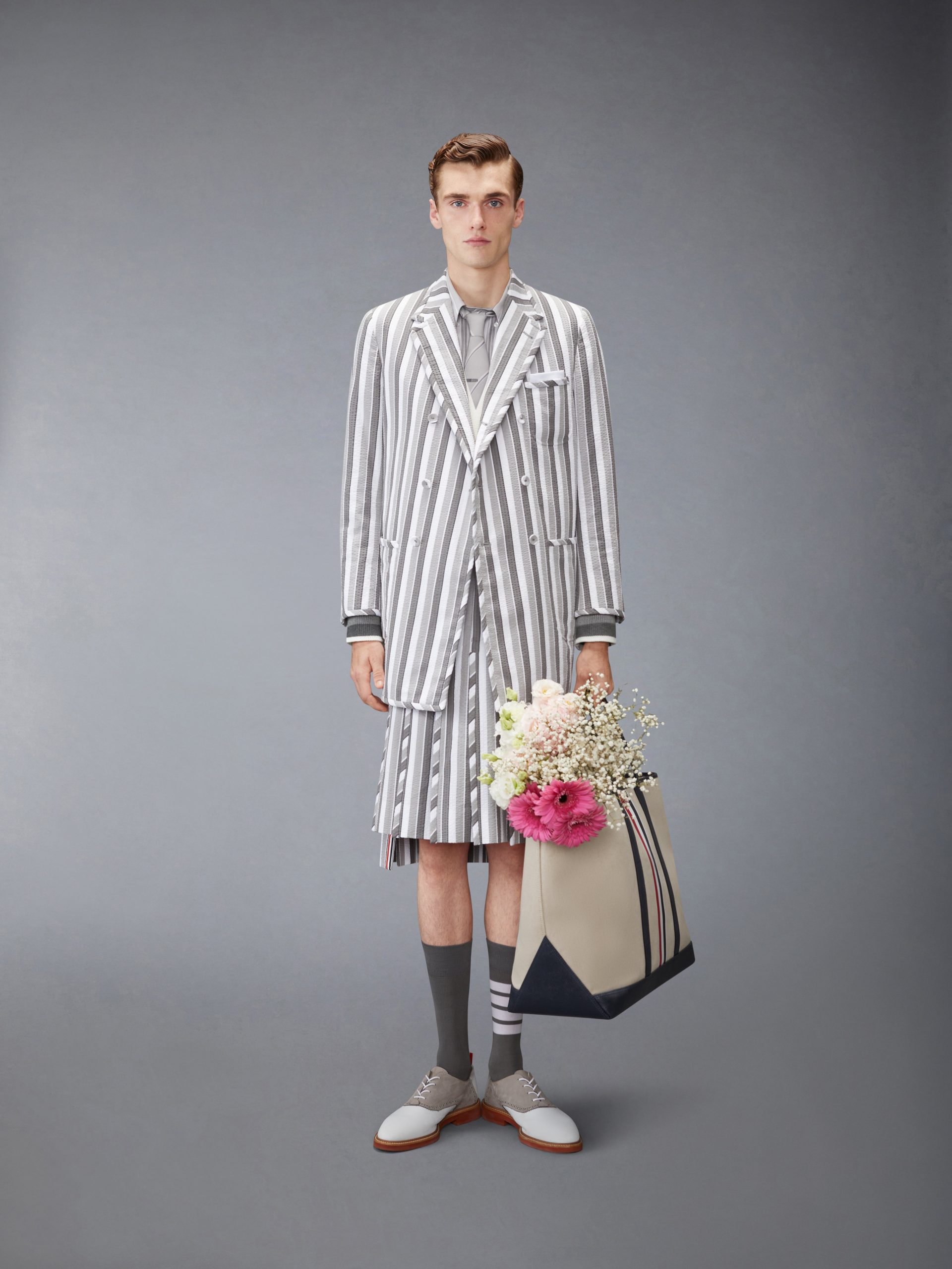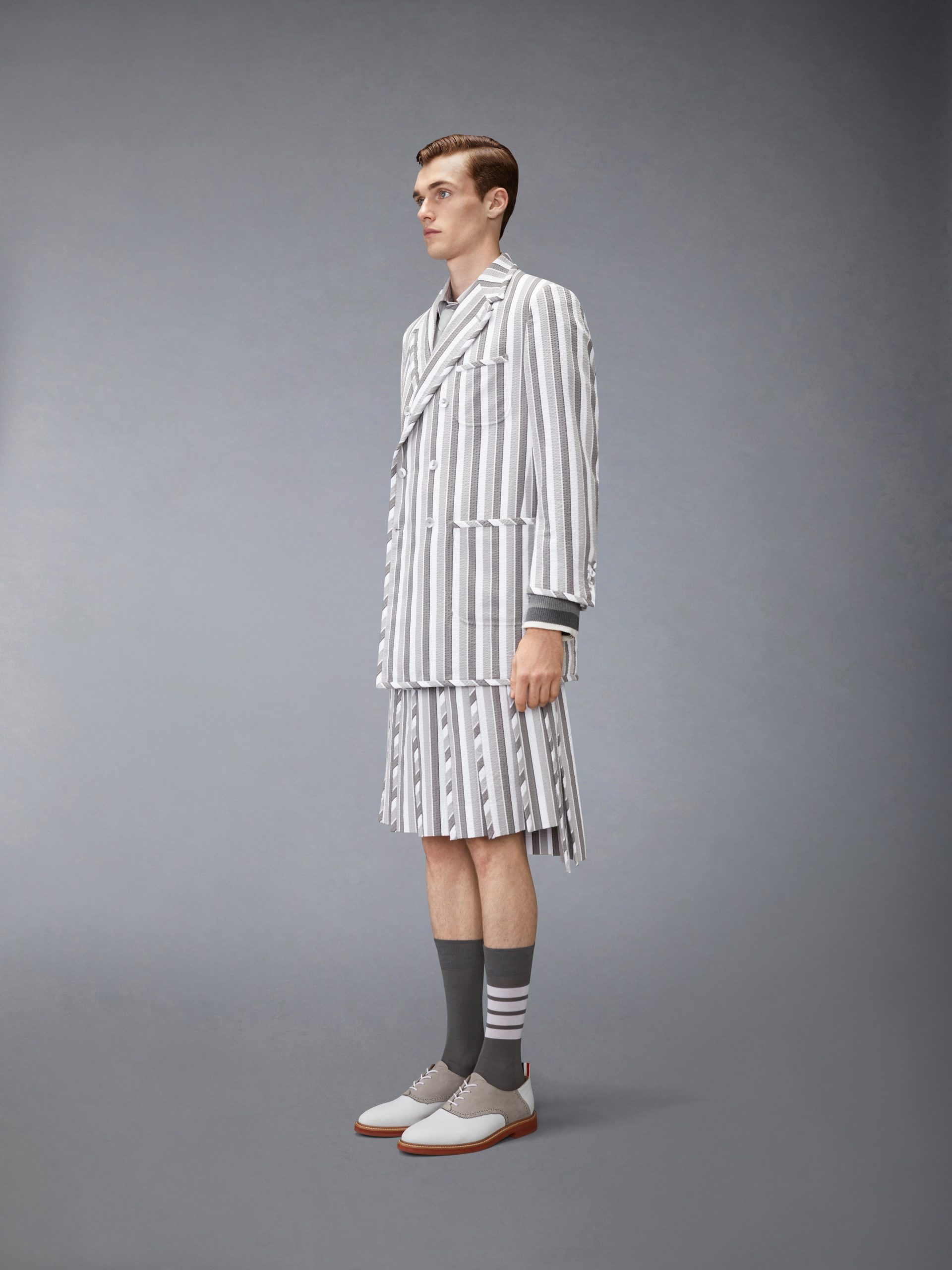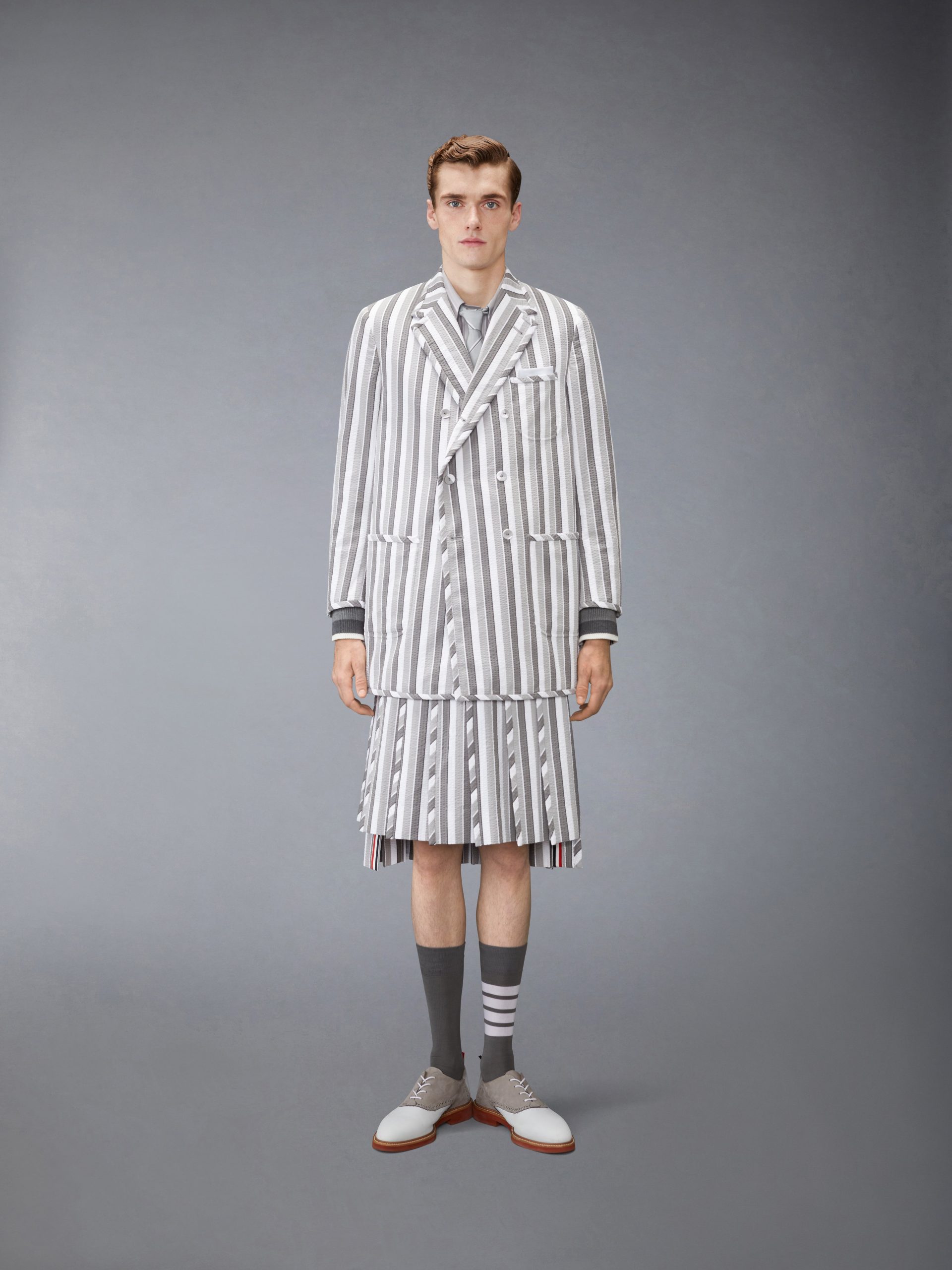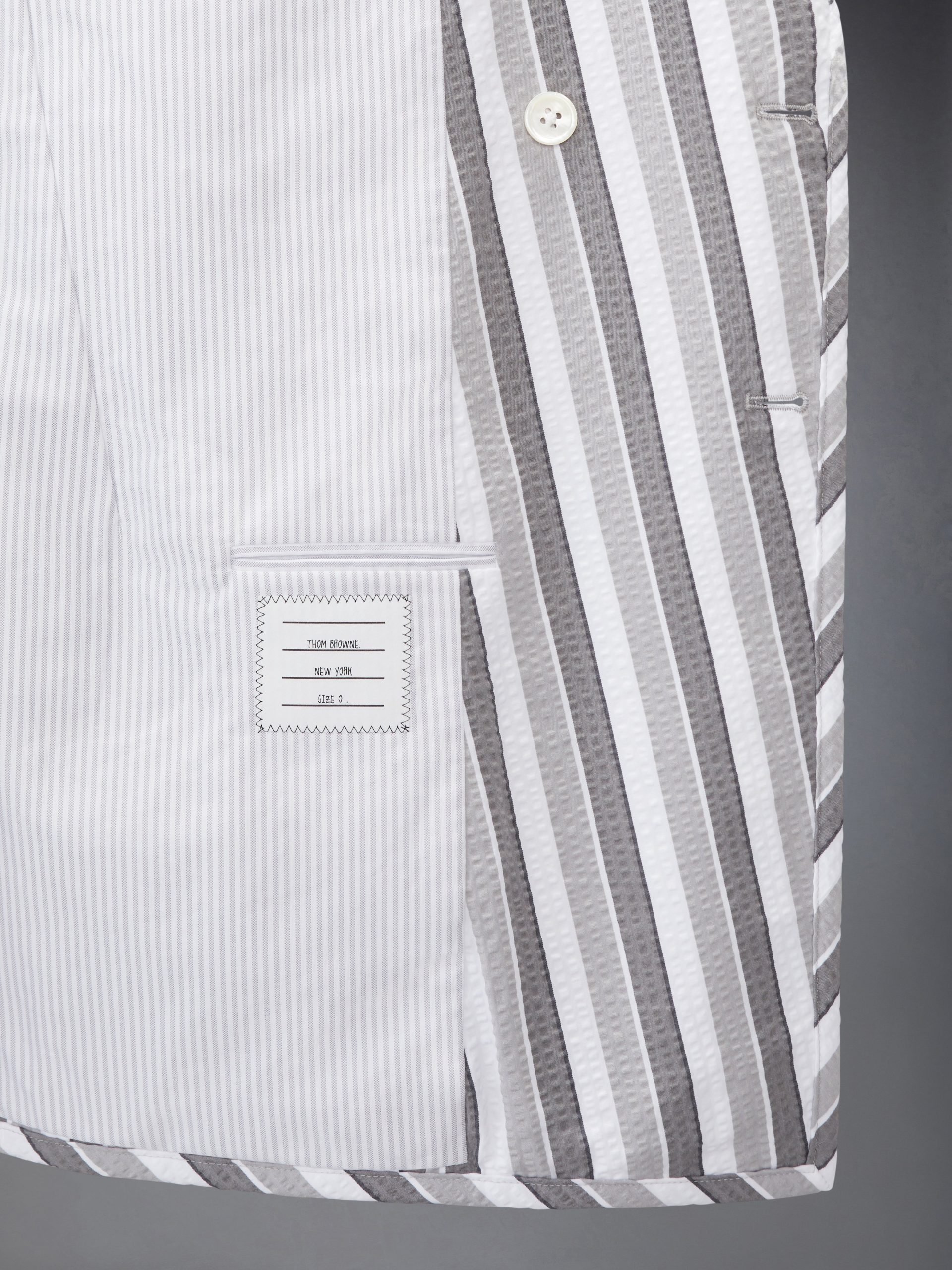 An exploration of proportion and seasonal formality. this sport coat embodies the season’s light yet disciplined spirit. Cut in tailored seersucker with bold shadow repp stripes. the elongated silhouette introduces ease to the structure of Thom Browne’s uniform language while the fabric’s airy construction adds movement. Paired with the matching Repp Striped Seersucker Backstrap Shorts. it offers a refined take on spring daytime event dressing.