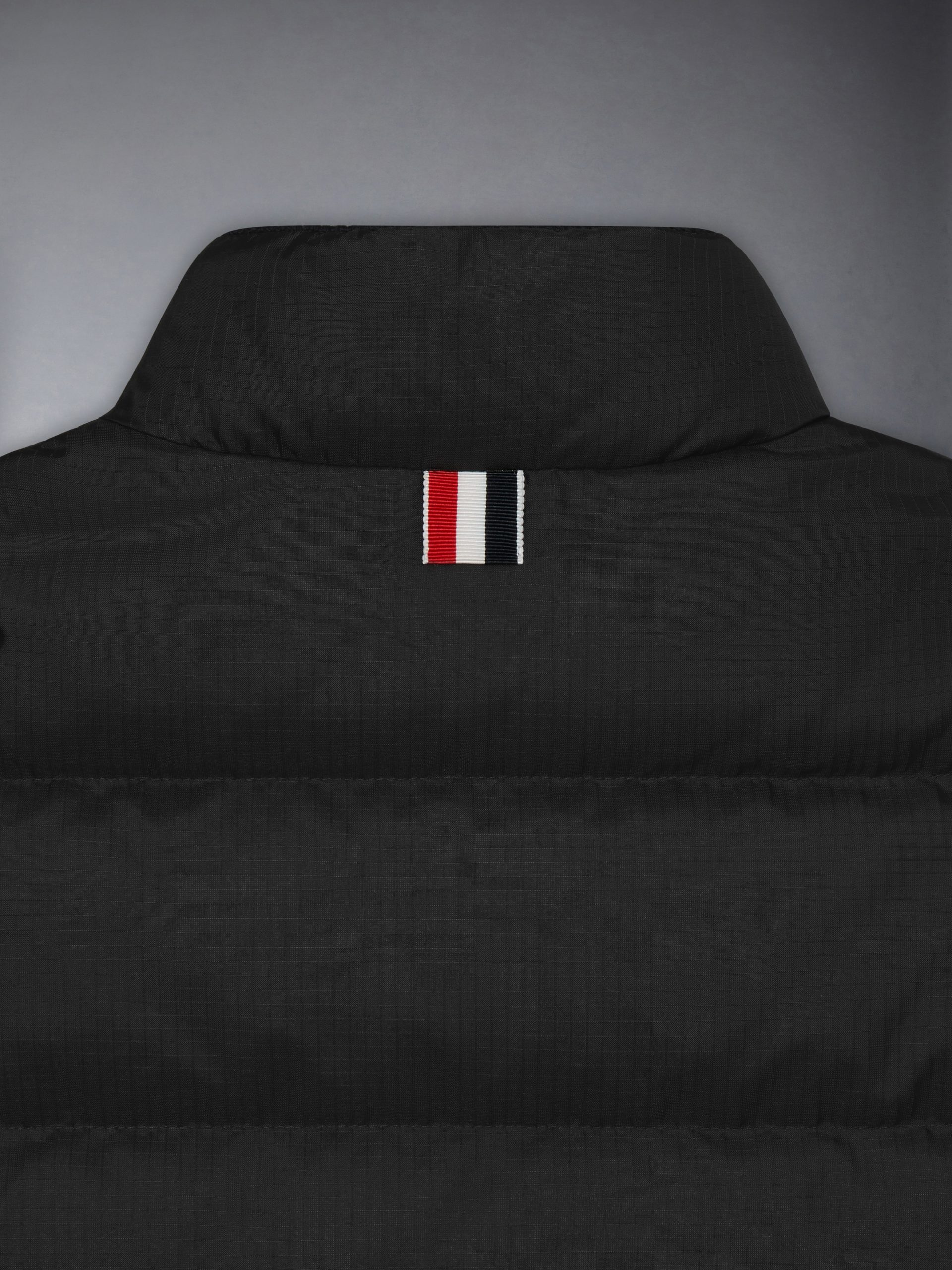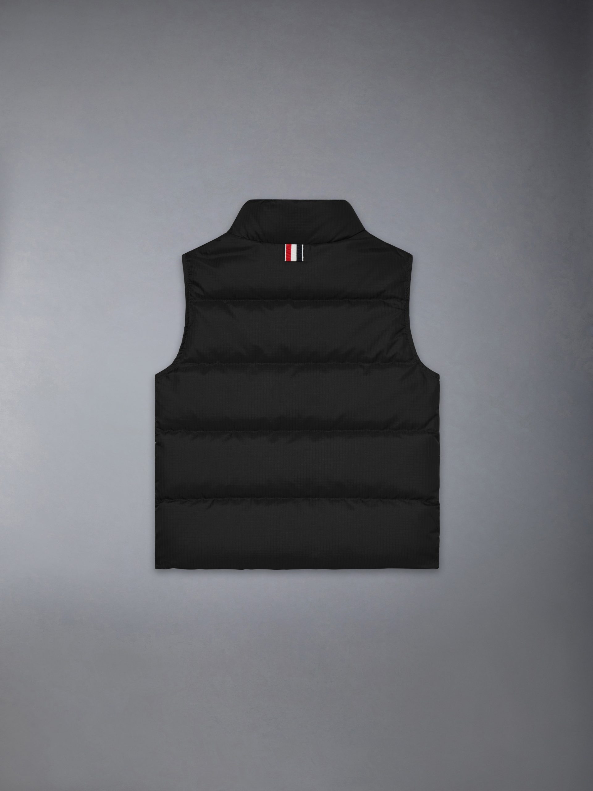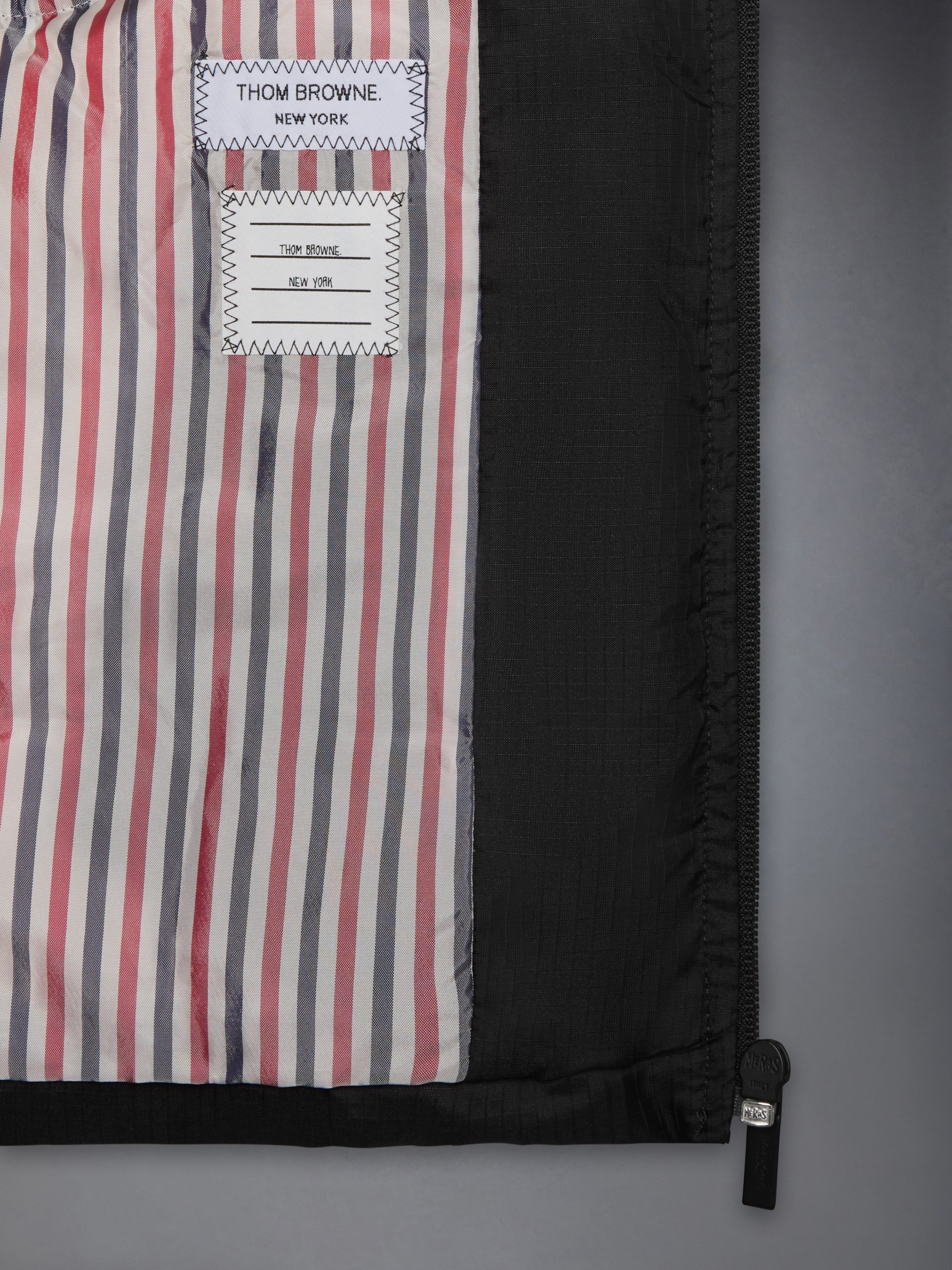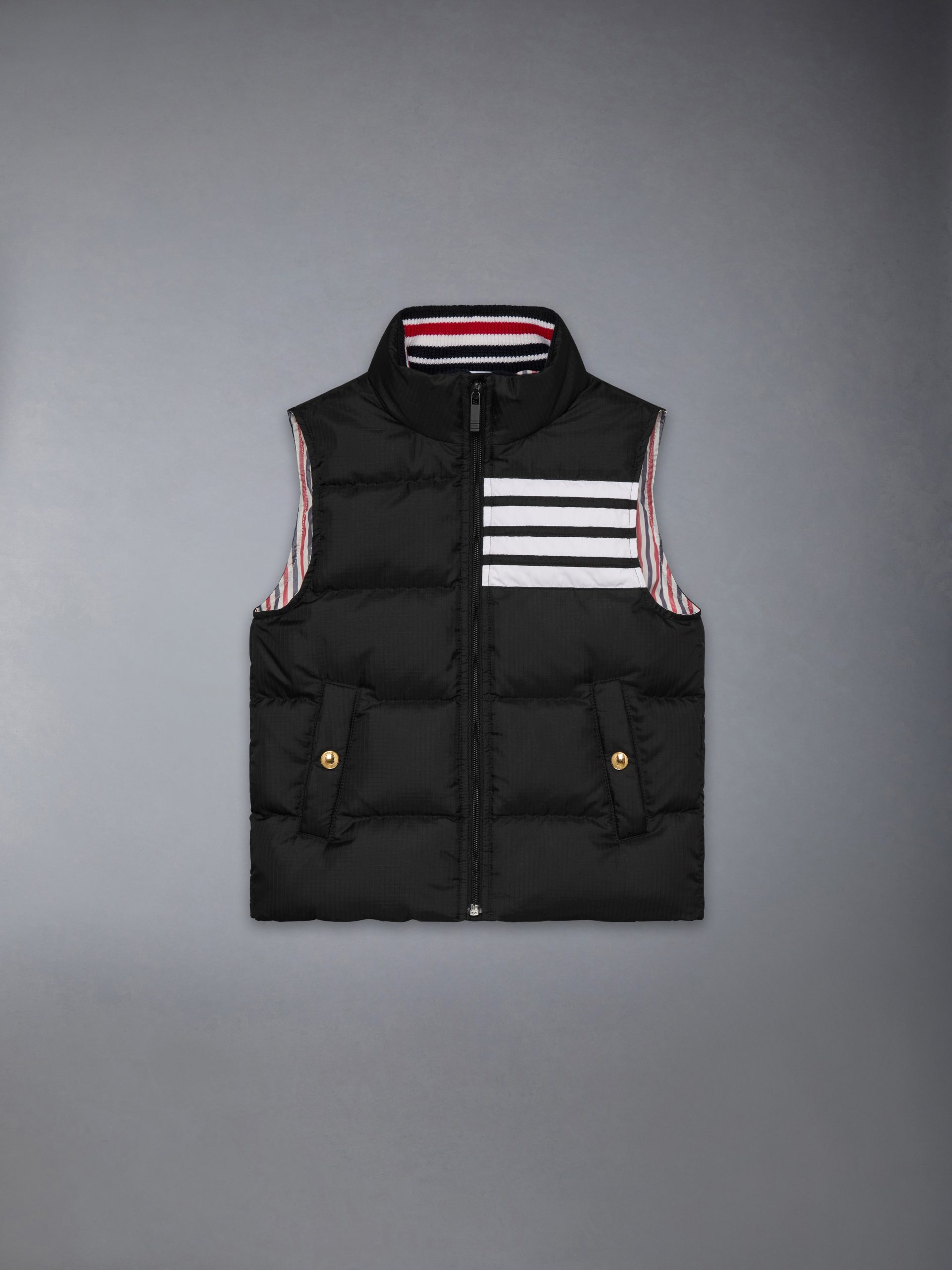 In lightweight. weather-resistant ripstop. this padded vest offers a crisp sense of utility softened by a rib-knit collar lining for comfort. The fabric’s subtle sheen and grid structure lend textural dimension. while the 4-bar detail adds a familiar signature note. A go-to layer for transitional days. whether worn solo or paired with outerwear.